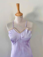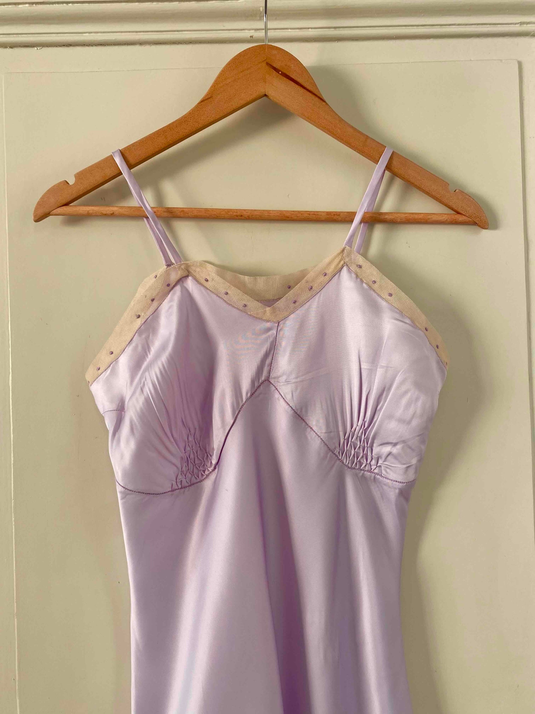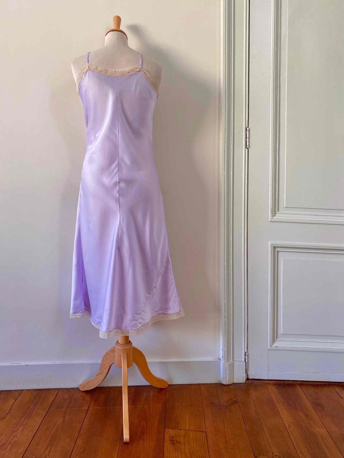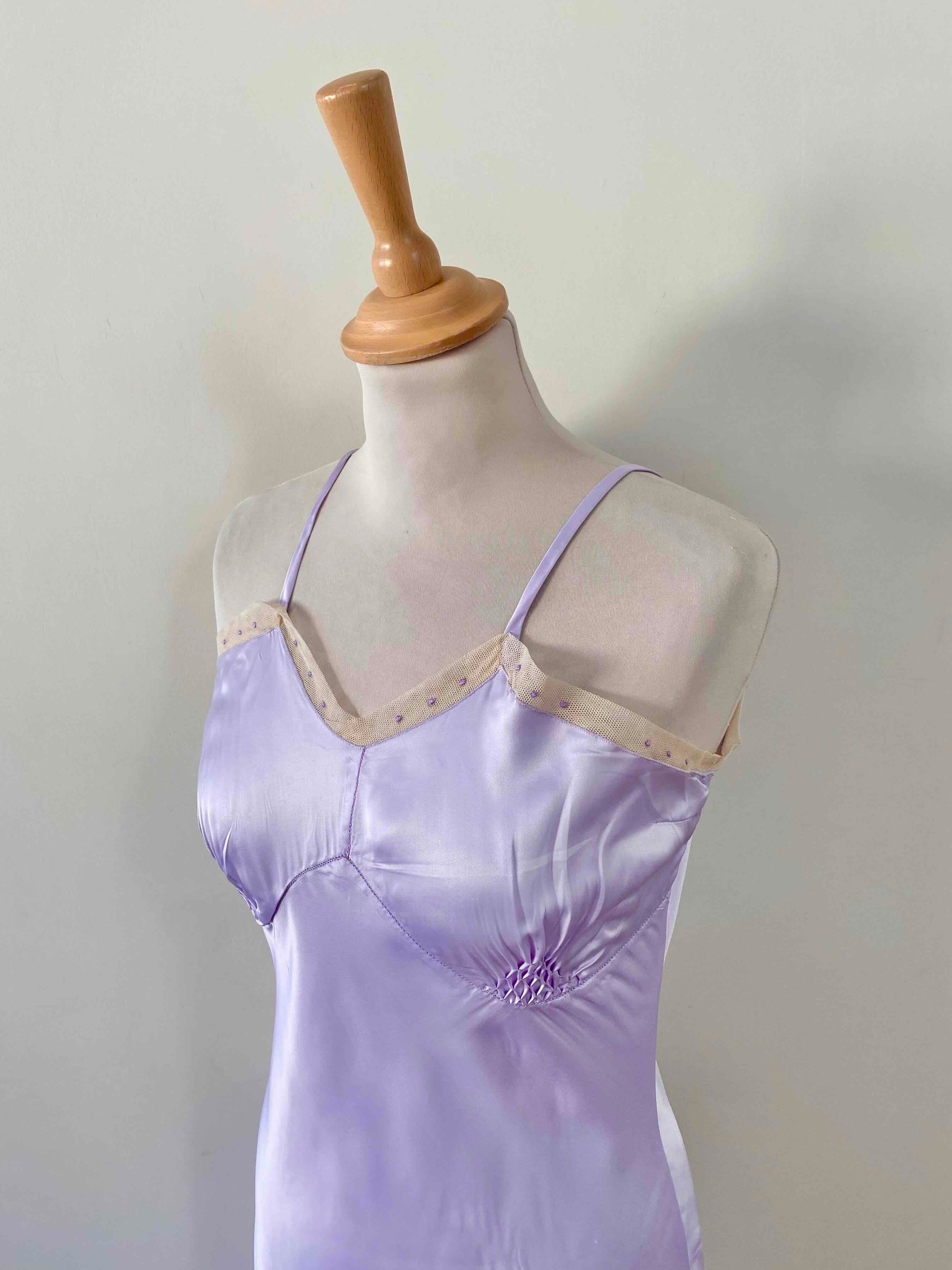 Prix unitaire parNuisette en satin lilas, satin viscose lila bordée de gaze résille brodée de pois, bretelles spaghettis, découpes sous poitrine et point smockés plissés, fabriquée et brodée mains en Italie, années 60’s, taille 36 portée ici sur un mannequin T36, aisselles 43cm.