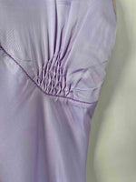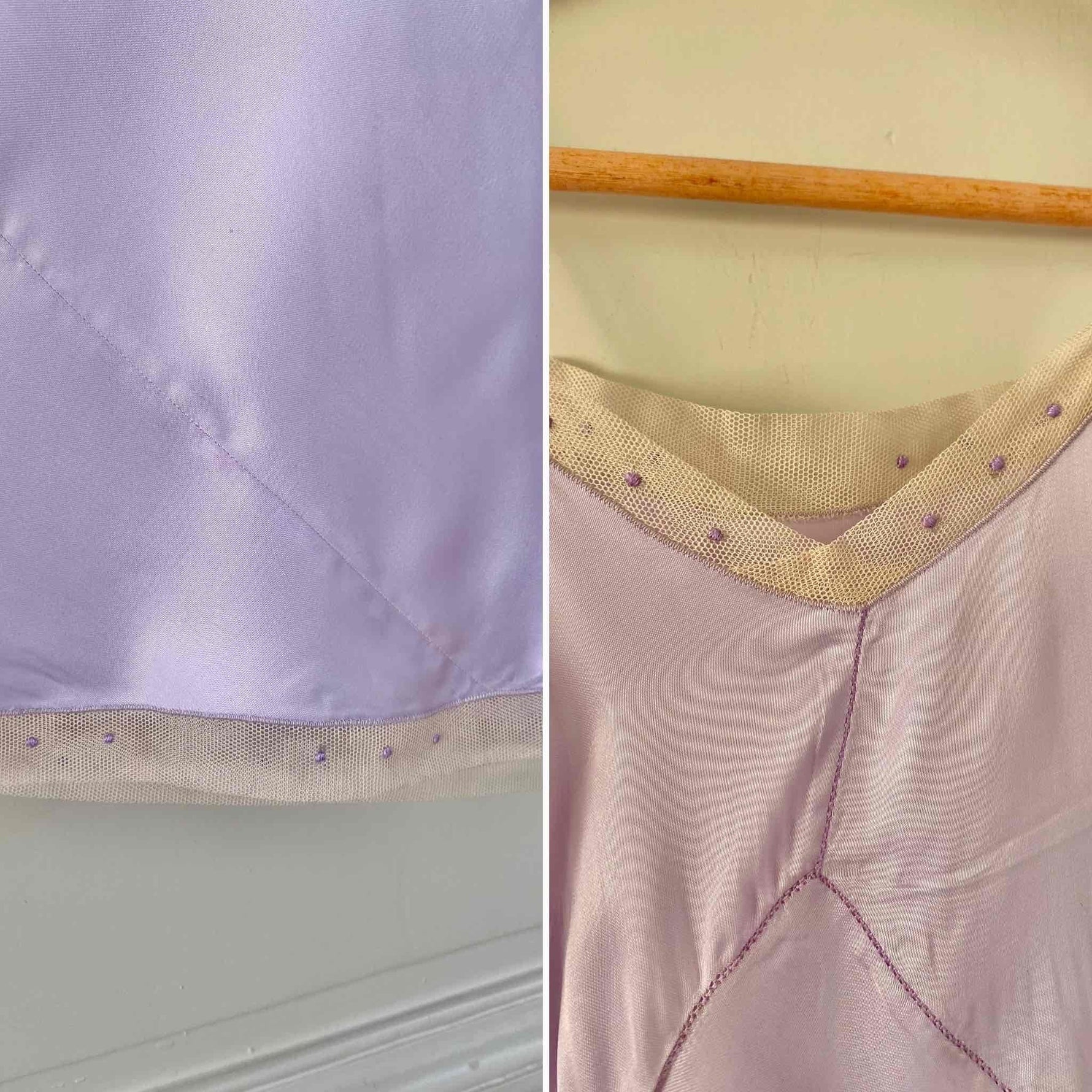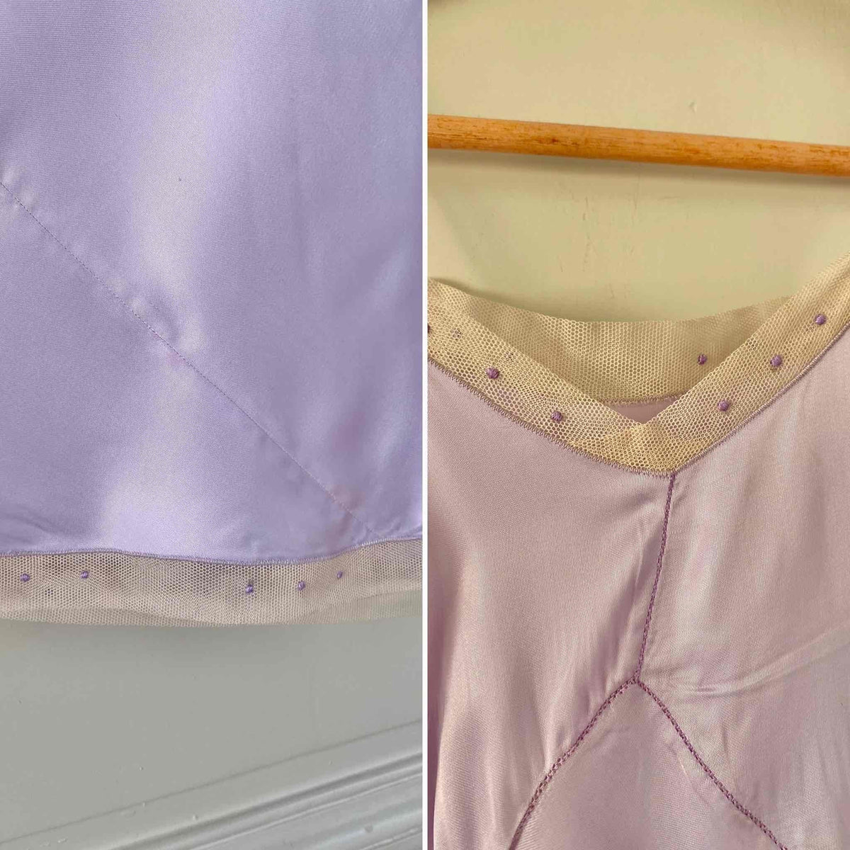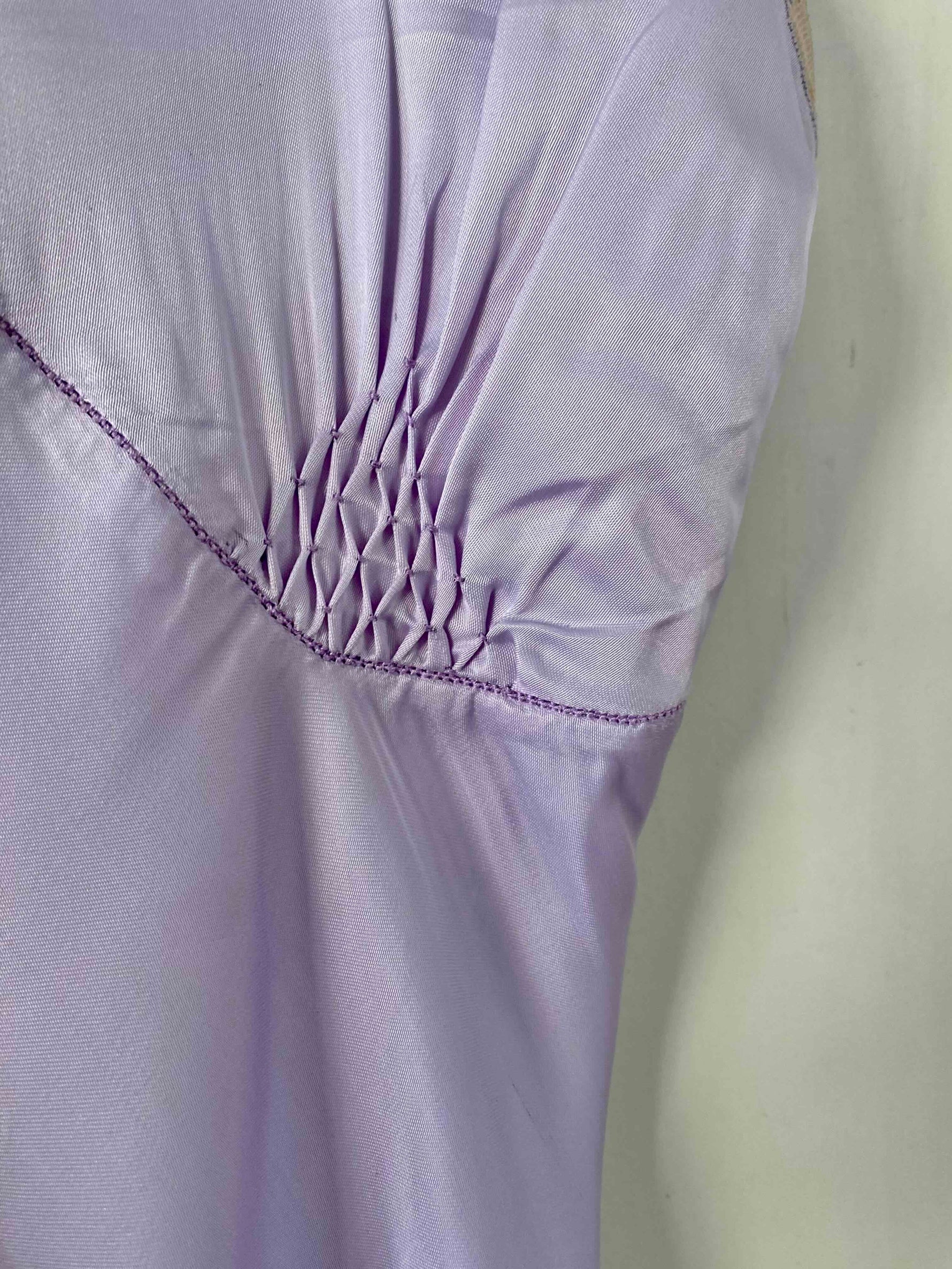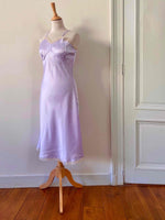 Prix unitaire parNuisette en satin lilas, satin viscose lila bordée de gaze résille brodée de pois, bretelles spaghettis, découpes sous poitrine et point smockés plissés, fabriquée et brodée mains en Italie, années 60’s, taille 36 portée ici sur un mannequin T36, aisselles 43cm.