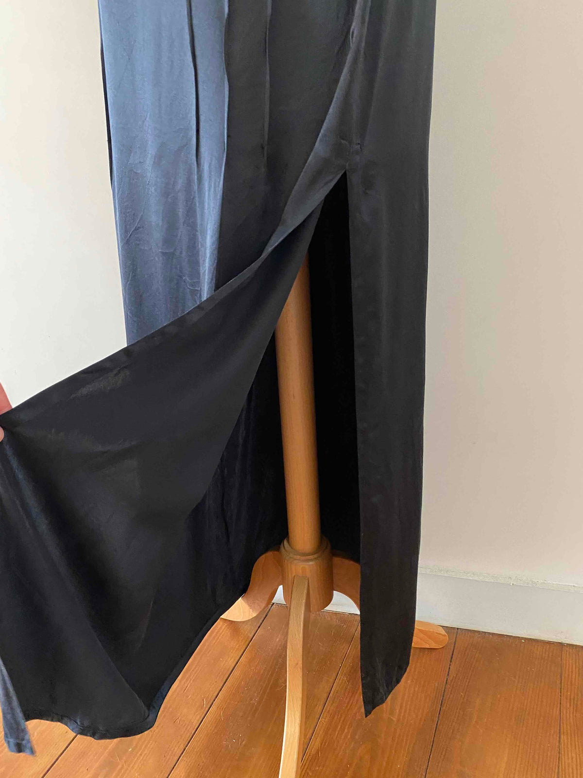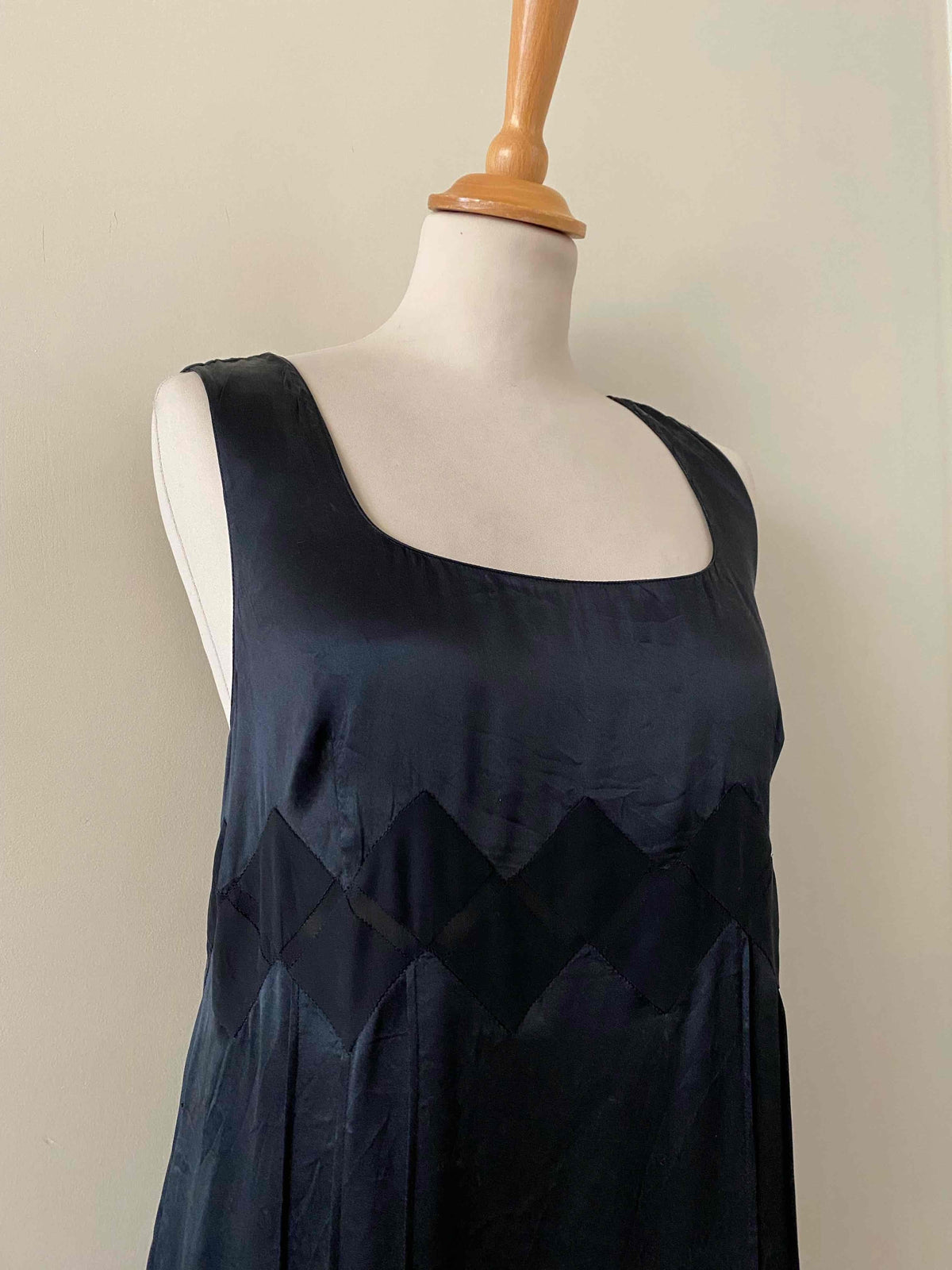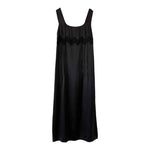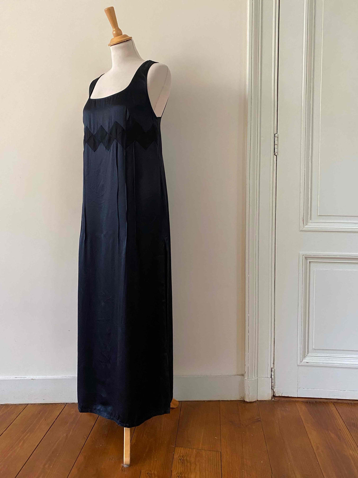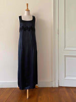 Nuisette en satin de soie noire, motifs losages en voile ajourés brodés sous poitrine, bretelles larges, grande fente sur un côté, fabriquée en Italie, taille 36 portée ici sur un mannequin T36, aisselles 43cm. Groupe La Perla.