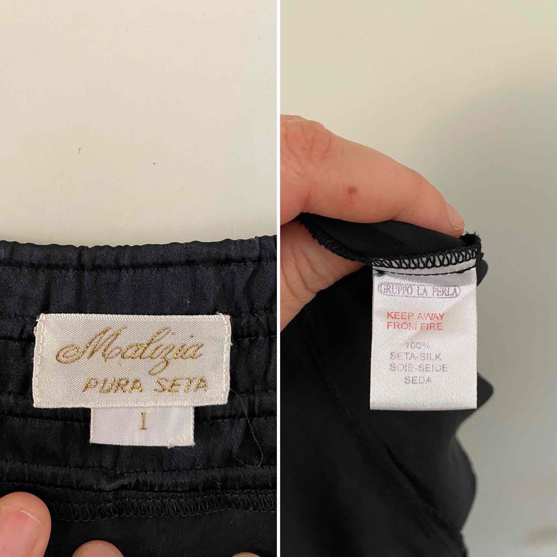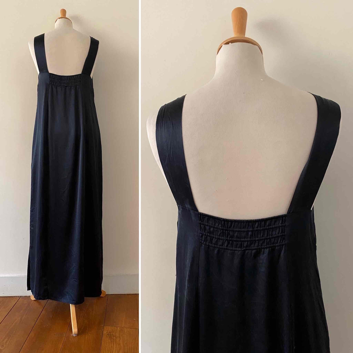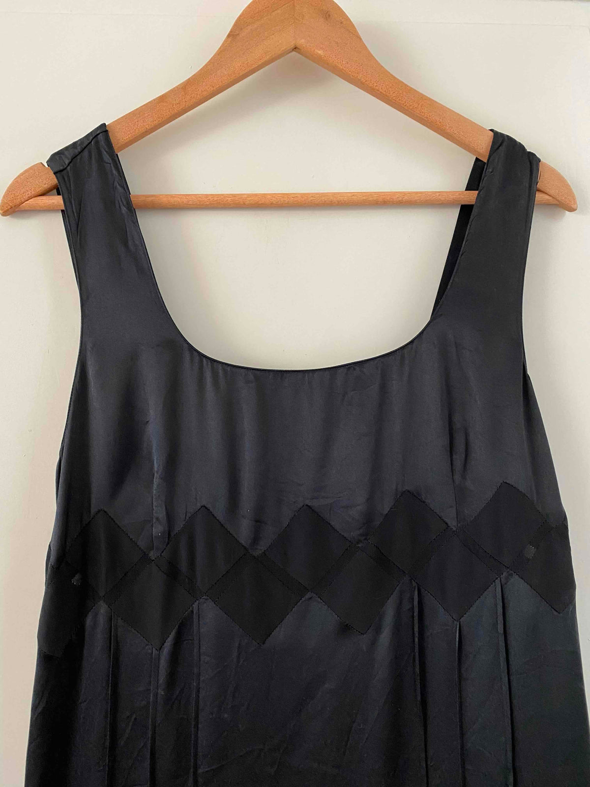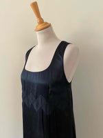 Nuisette en satin de soie noire, motifs losages en voile ajourés brodés sous poitrine, bretelles larges, grande fente sur un côté, fabriquée en Italie, taille 36 portée ici sur un mannequin T36, aisselles 43cm. Groupe La Perla.