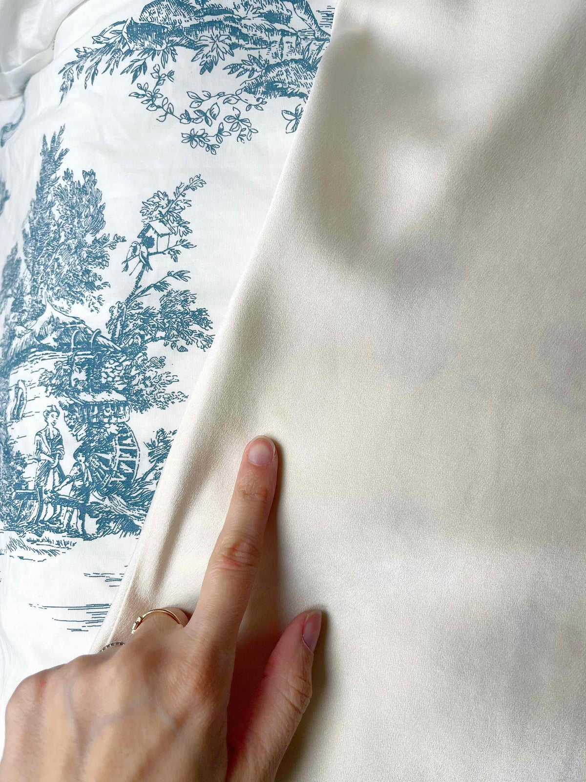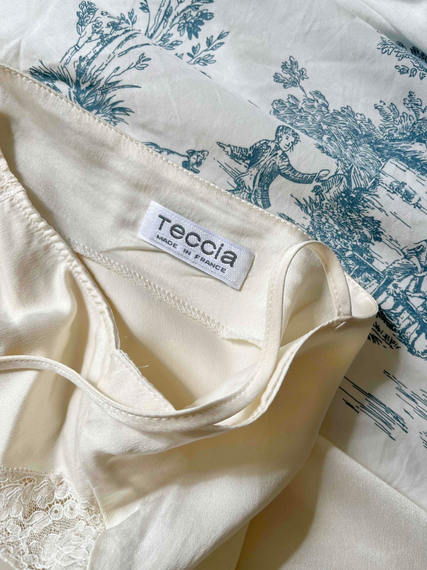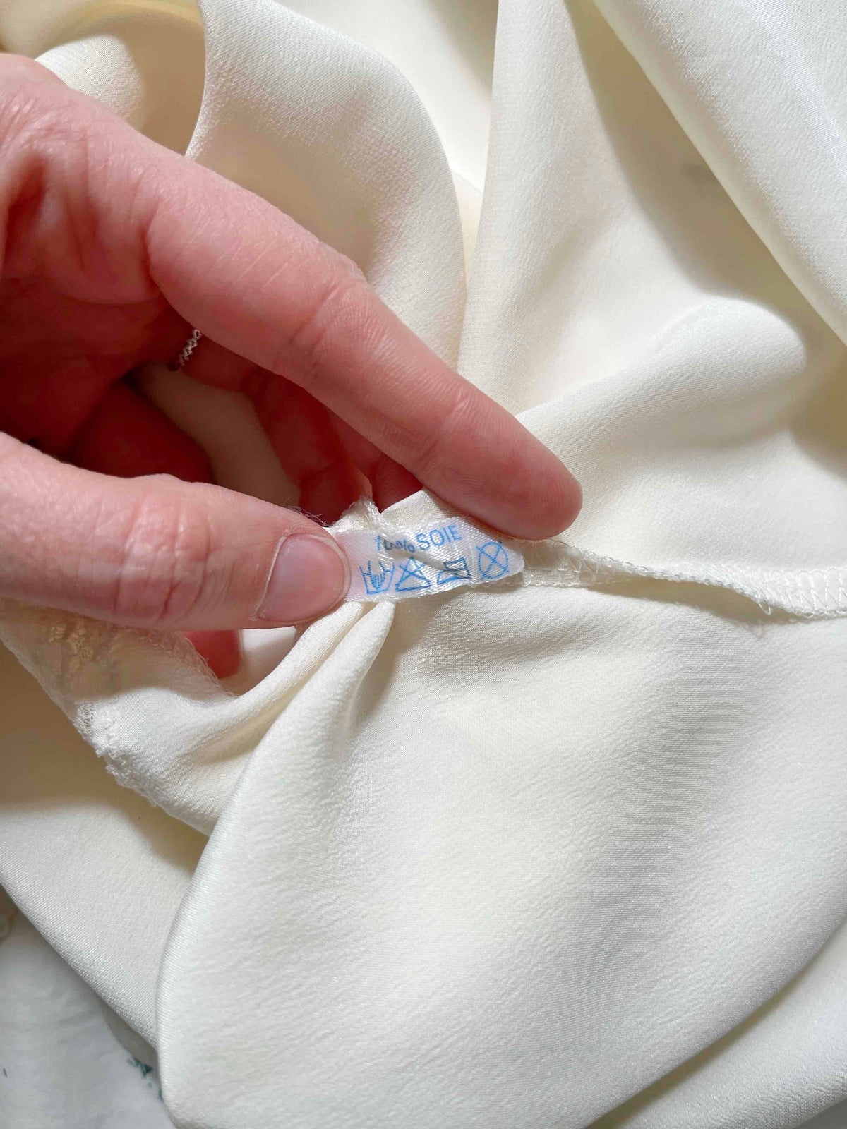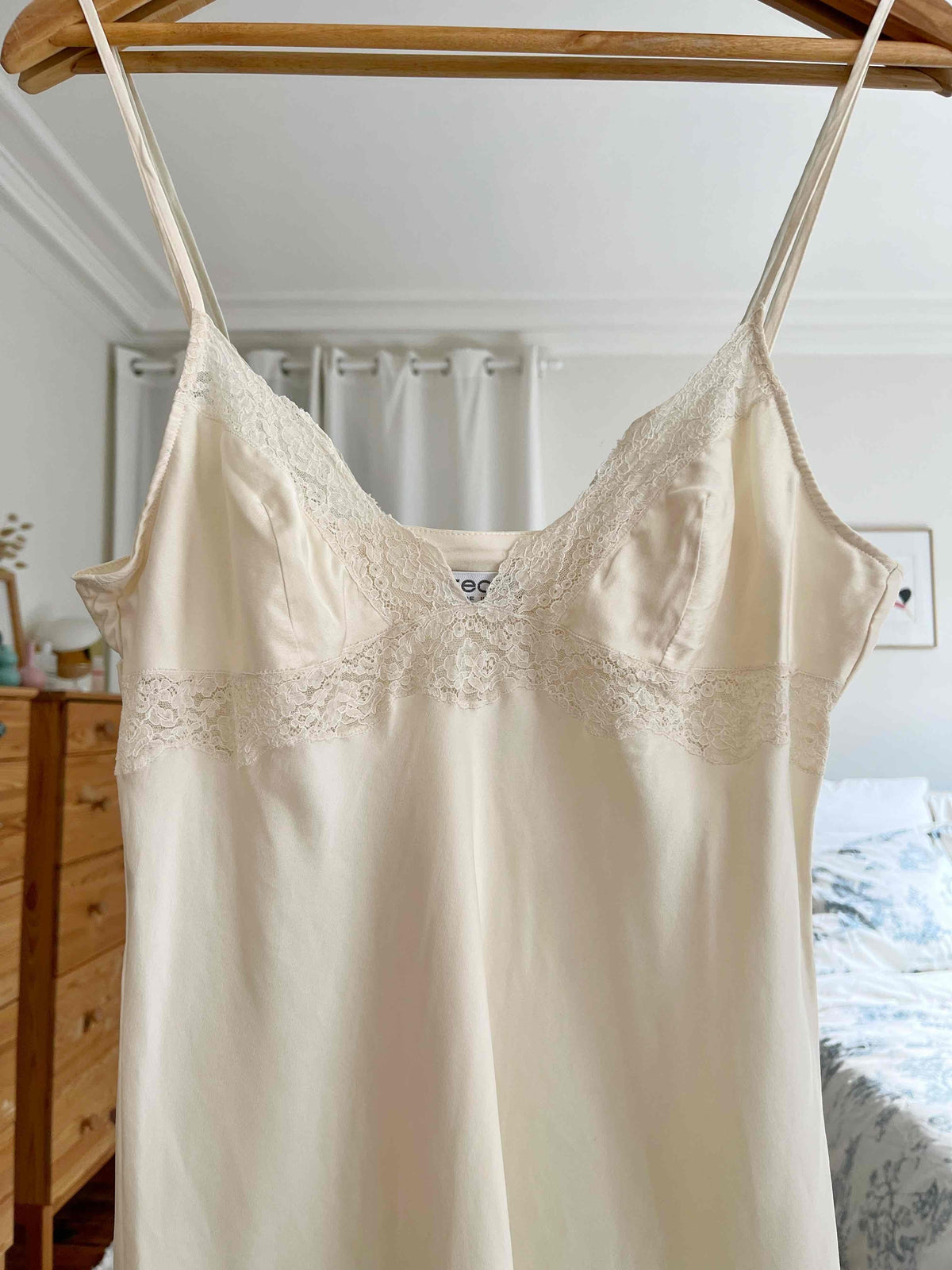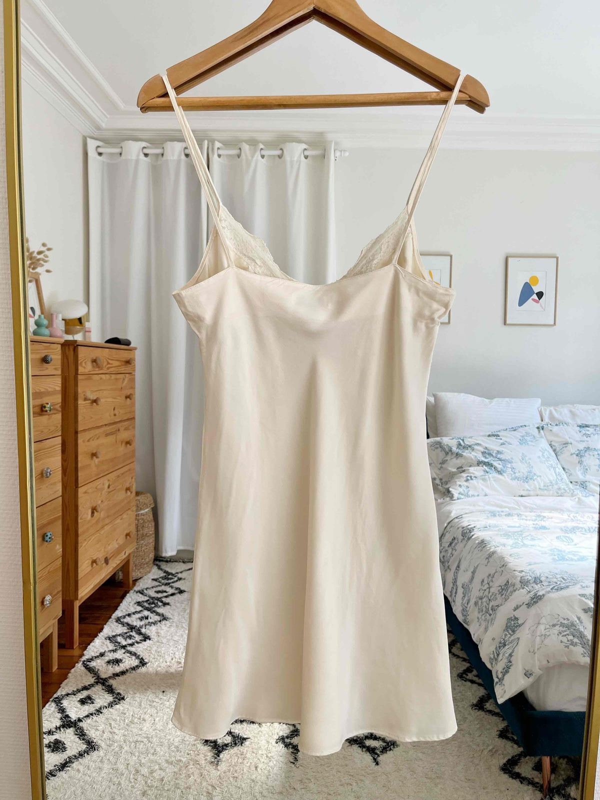 Prix unitaire parNuisette 100% soie et dentelle, couleur écrue, bretelles non ajustable de 41cm, fabriquée en France. Portée ici sur une T36 pour 1m64.