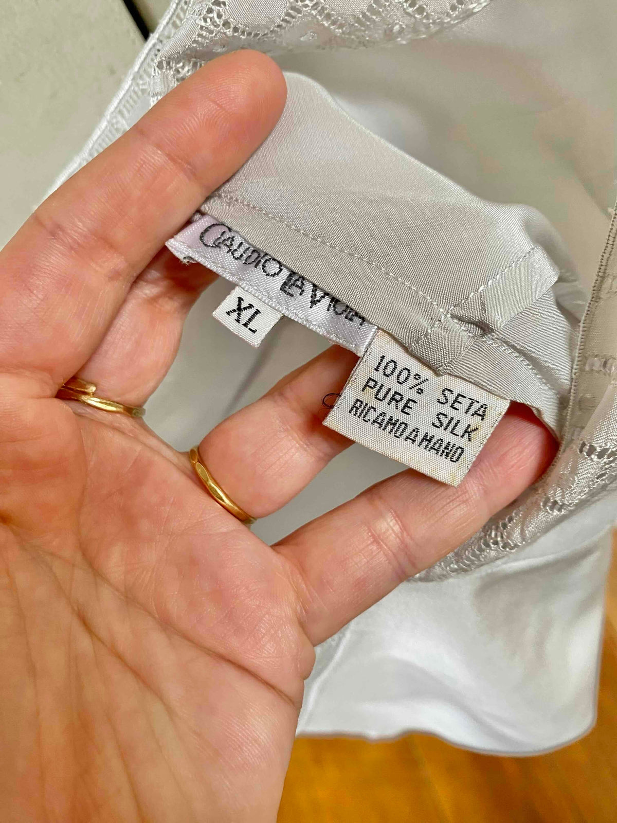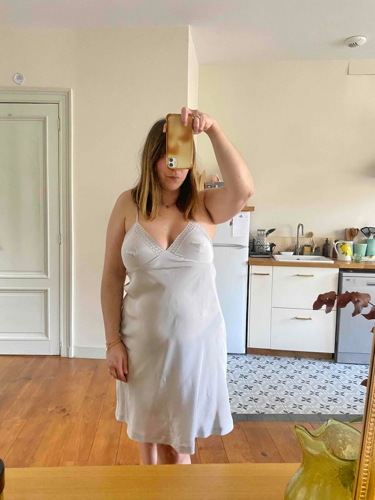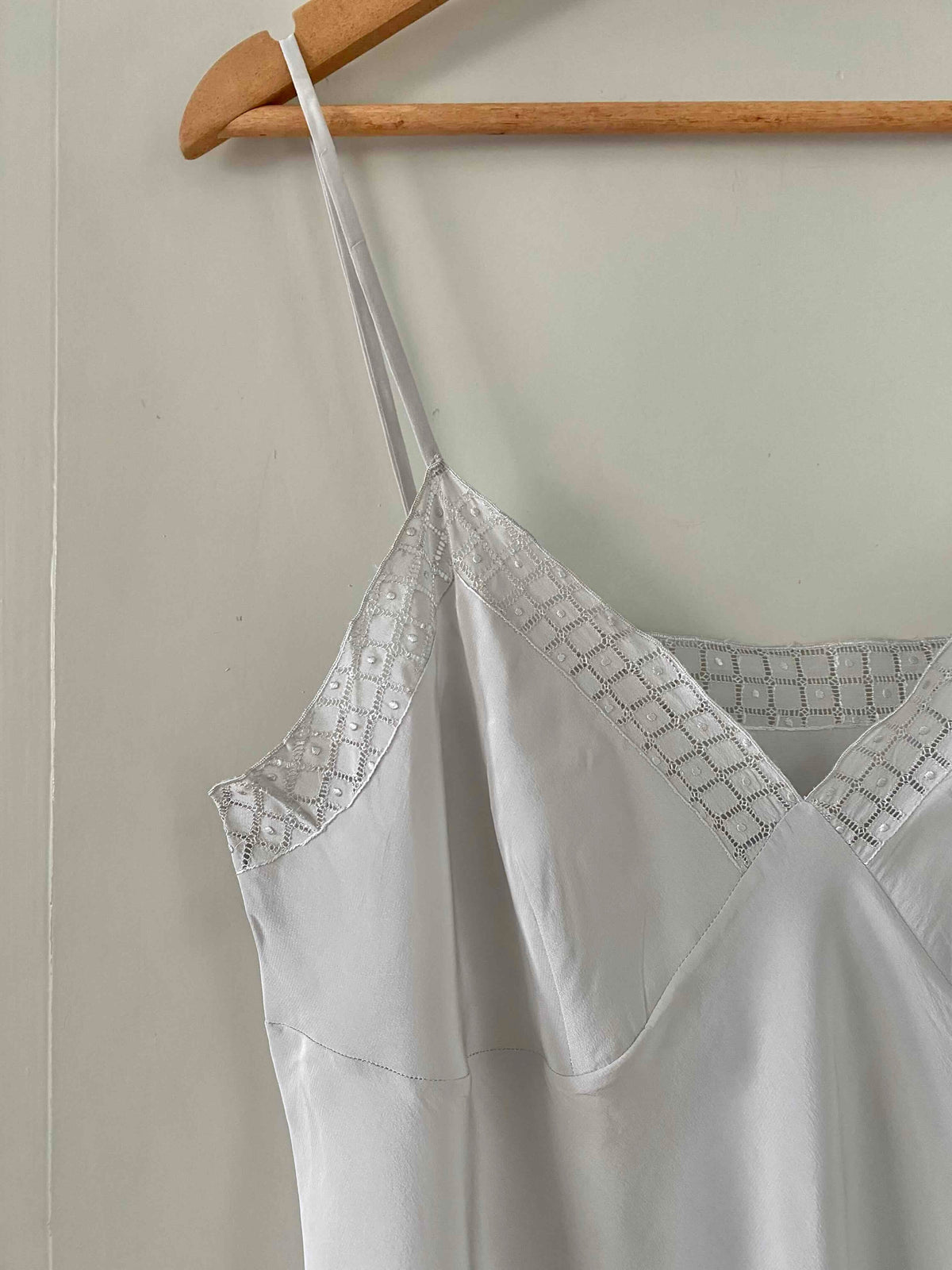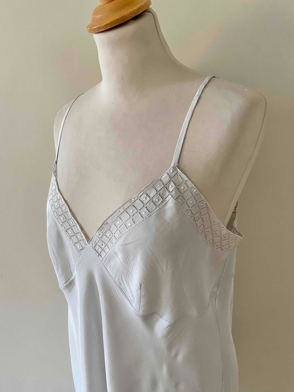 Prix unitaire parNuisette en soie gris perle très clair, encolure brodée ajourée faite main, bretelles spaghettis, découpes sous poitrine, fabriquée en Italie, taille 40 portée ici sur une personne T40 et un mannequin T36, aisselles 50cm.