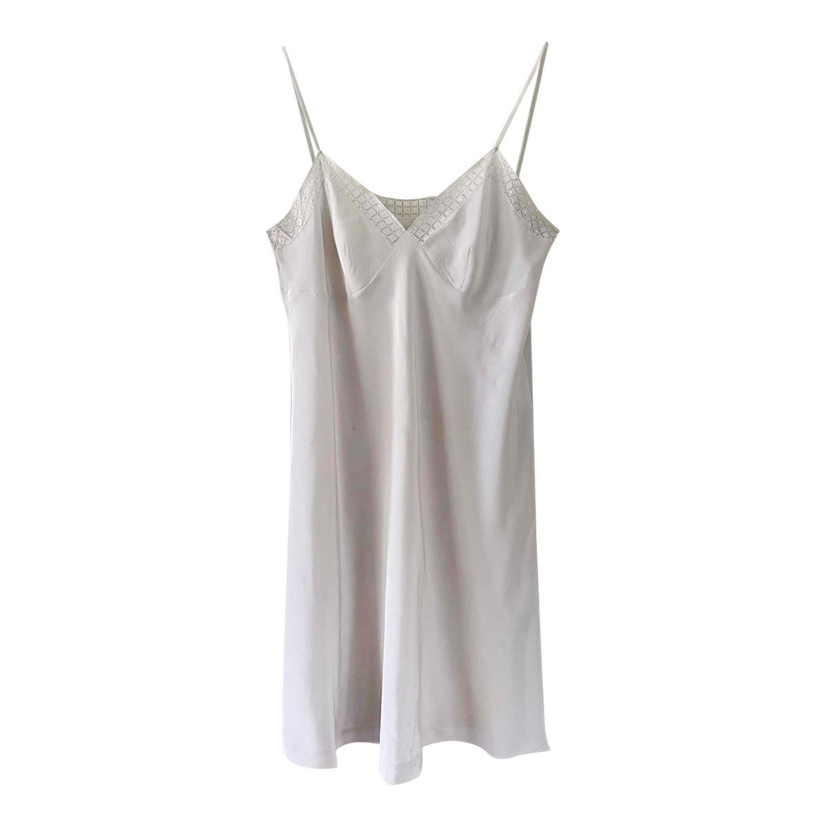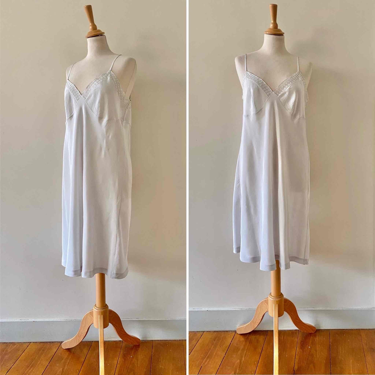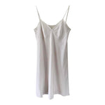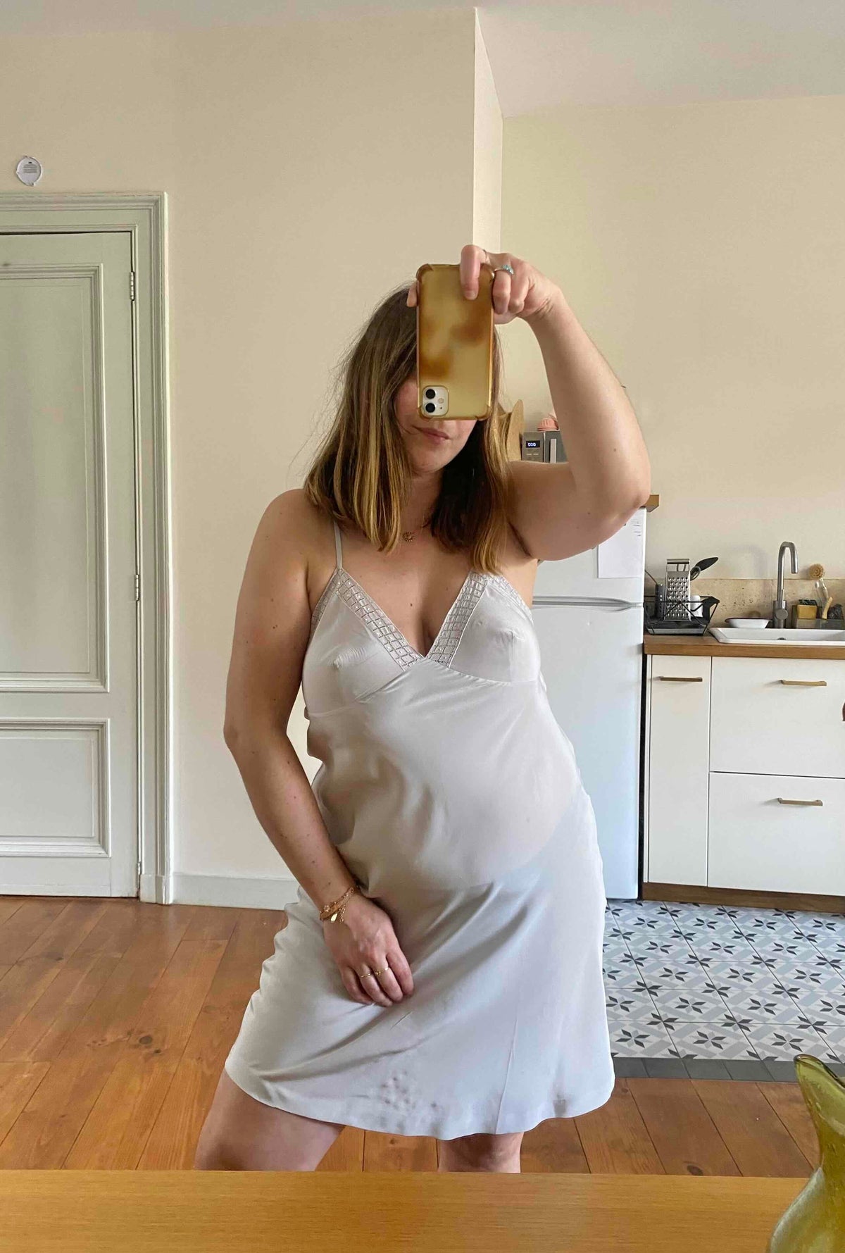Prix unitaire parNuisette en soie gris perle très clair, encolure brodée ajourée faite main, bretelles spaghettis, découpes sous poitrine, fabriquée en Italie, taille 40 portée ici sur une personne T40 et un mannequin T36, aisselles 50cm.