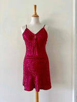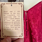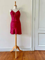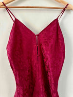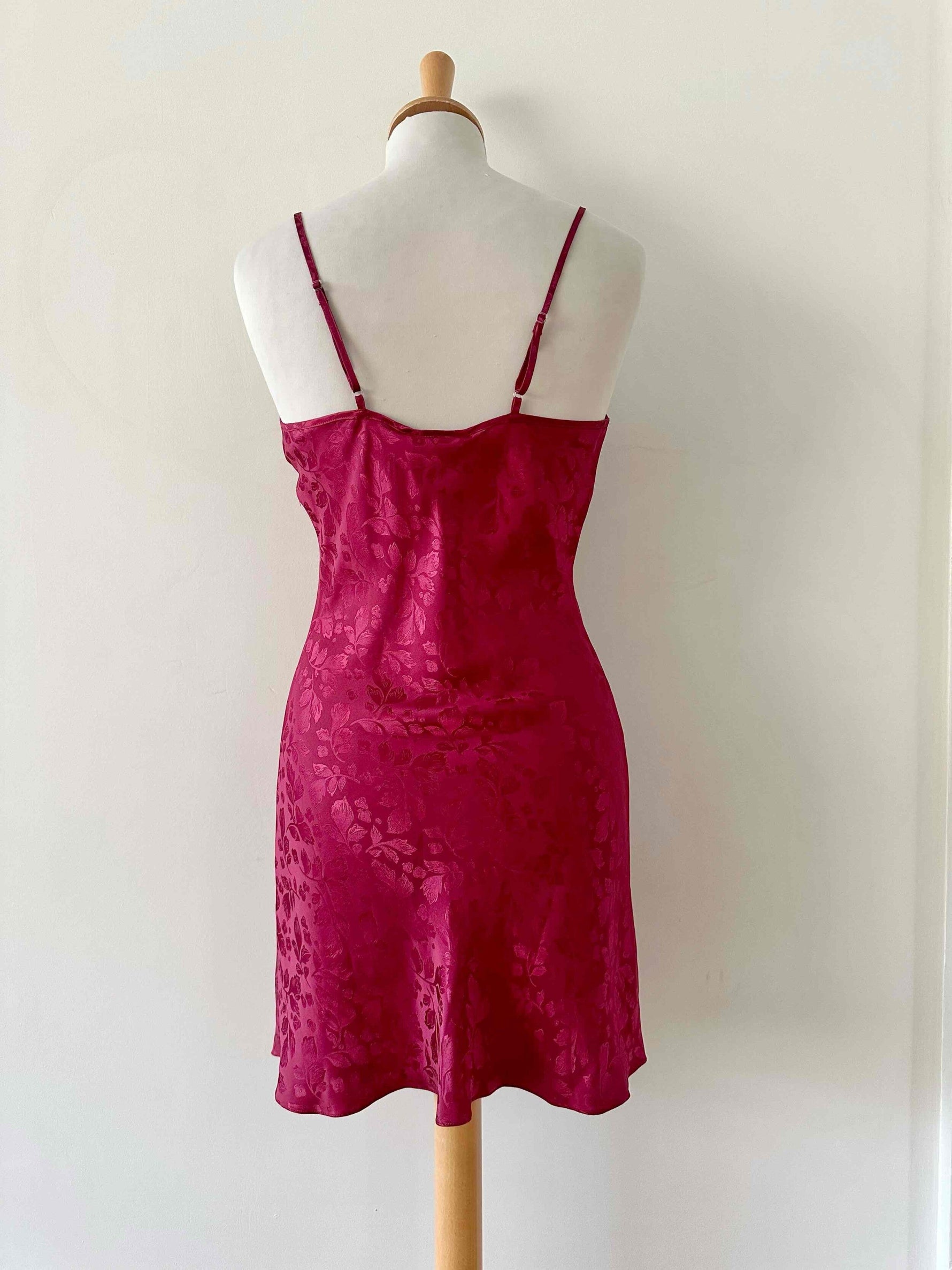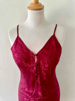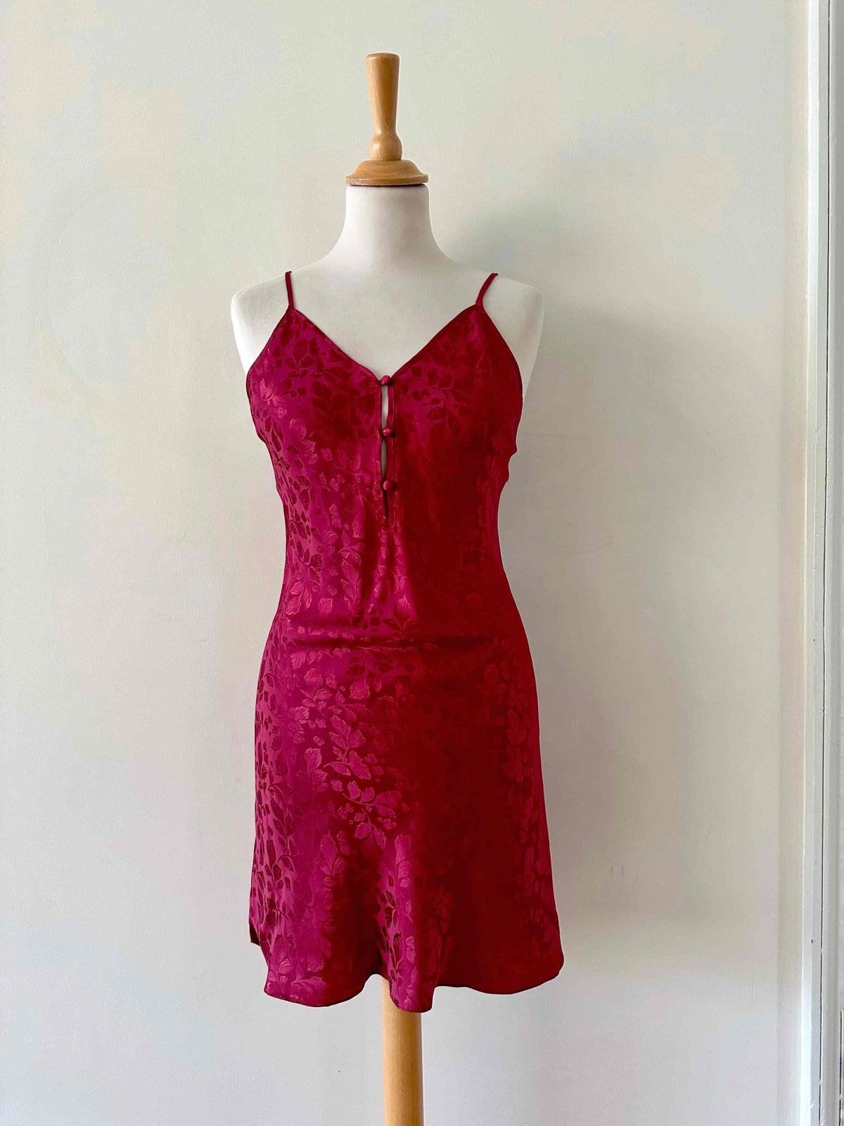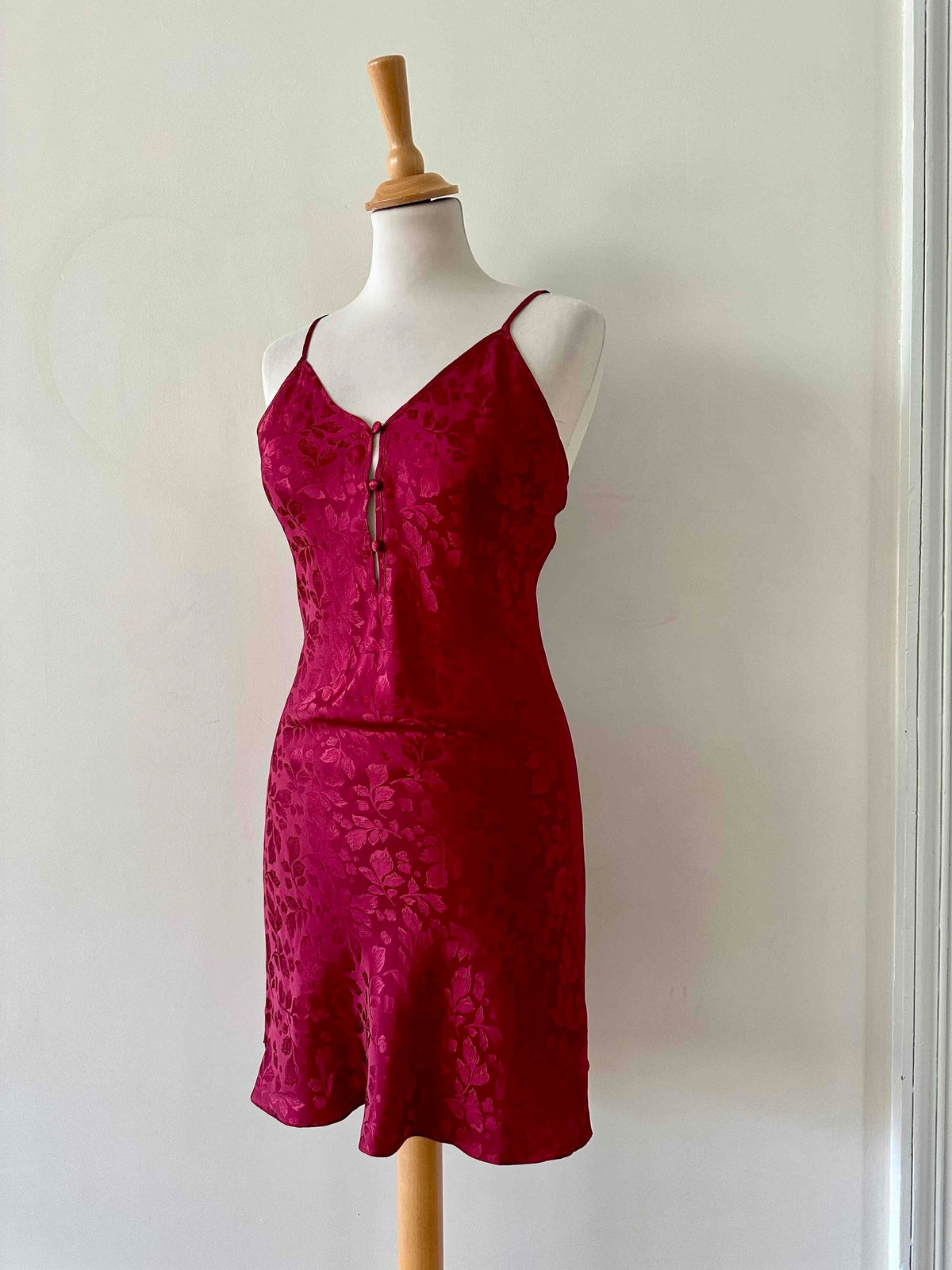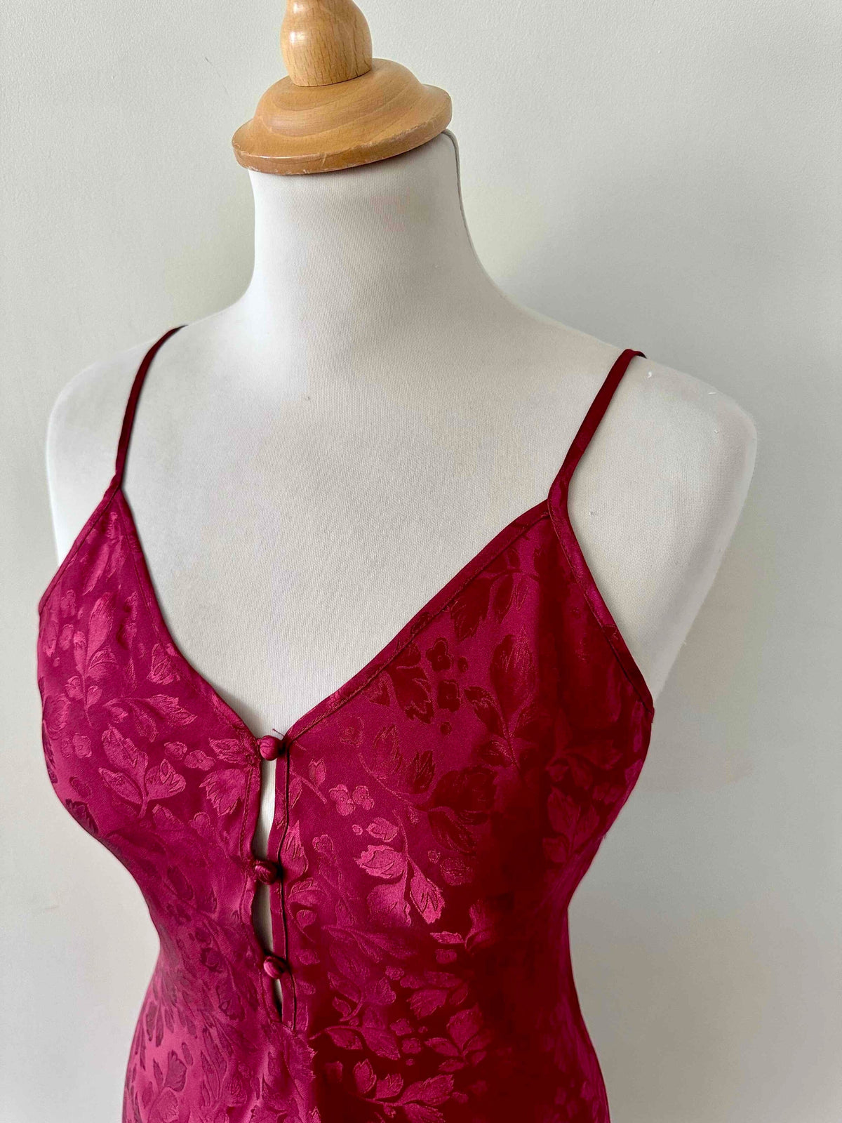 Prix unitaire parNuisette damassée en soie, soie satin jacquard damassé fleuri rouge bordeaux, bretelles spaghettis réglables, boutons ajouré milieu poitrine, fabriquée en Italie, taille 36, portée ici sur un mannequin T36. Aisselles 43 cm.