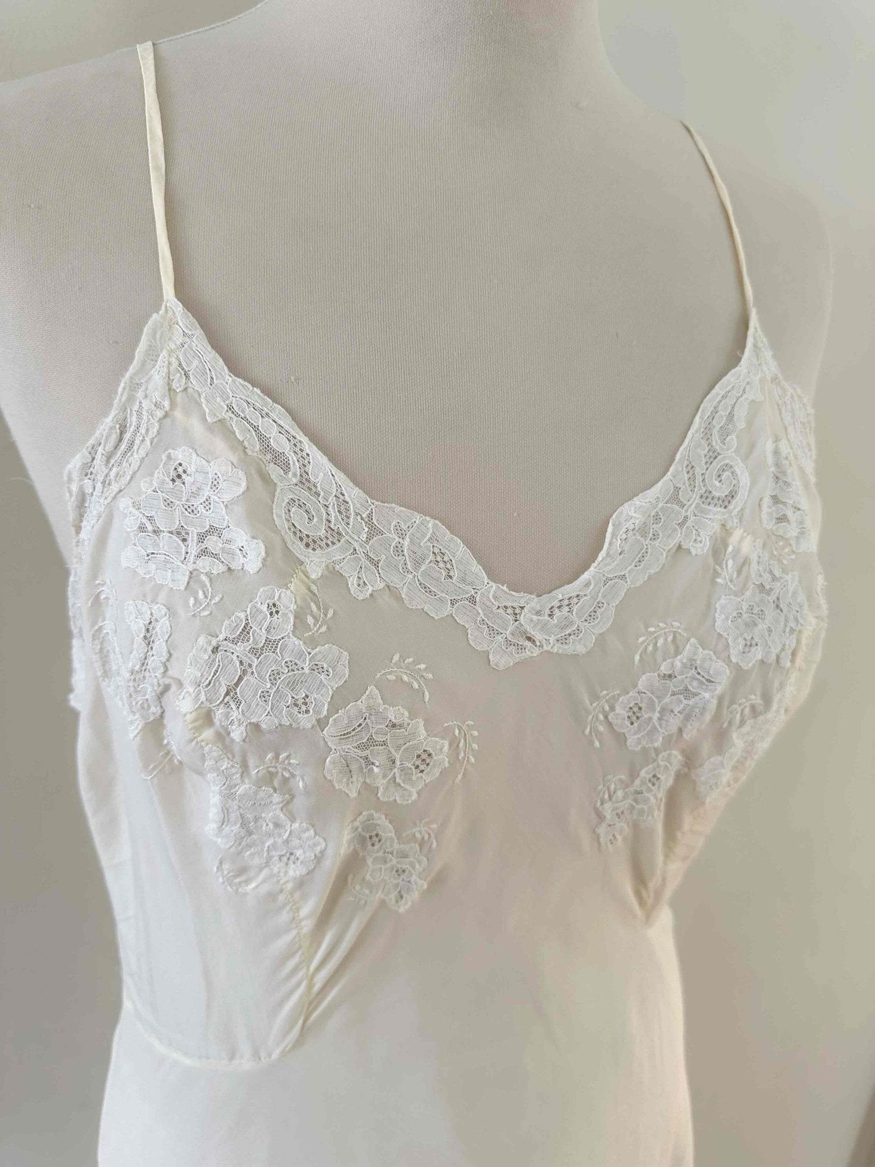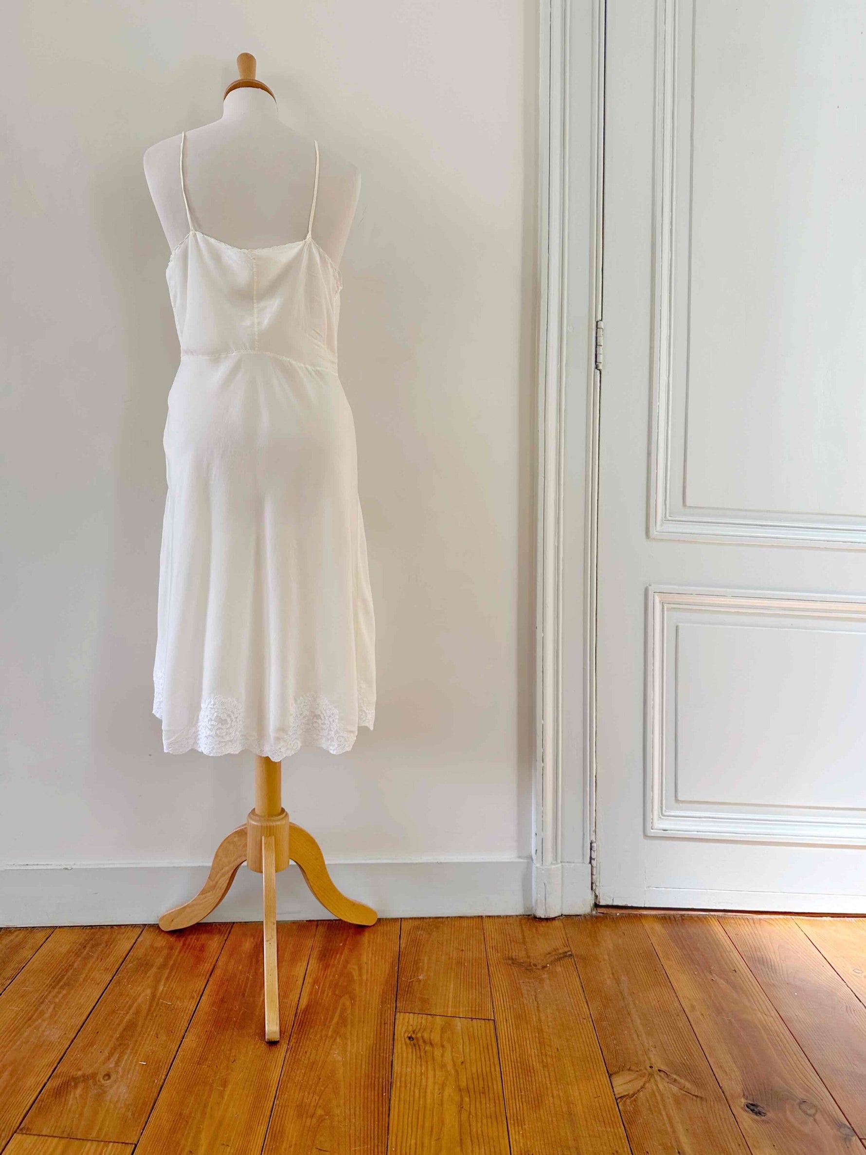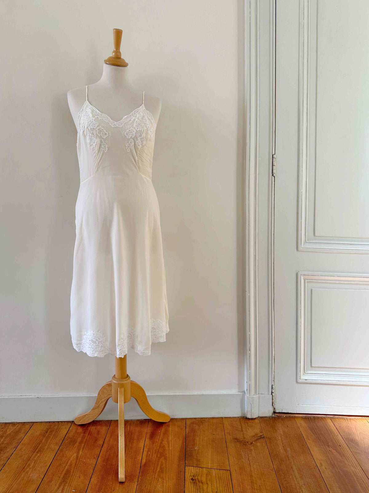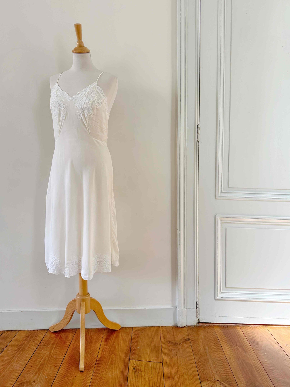 Nuisette en soie 50s, soie écru ivoire, bretelles spaghettis, encolure et bordure bas en dentelle chantilly appliquée et ajourée, années 50s, taille 36, portée ici sur un mannequin T36, aisselles 43 cm.