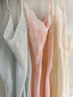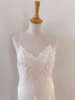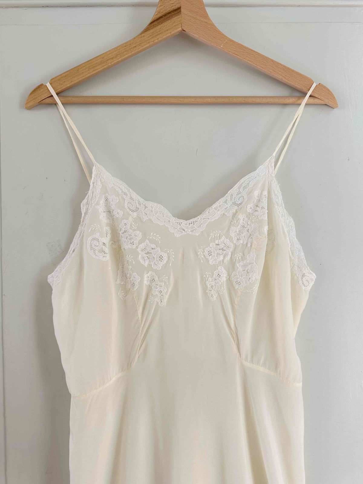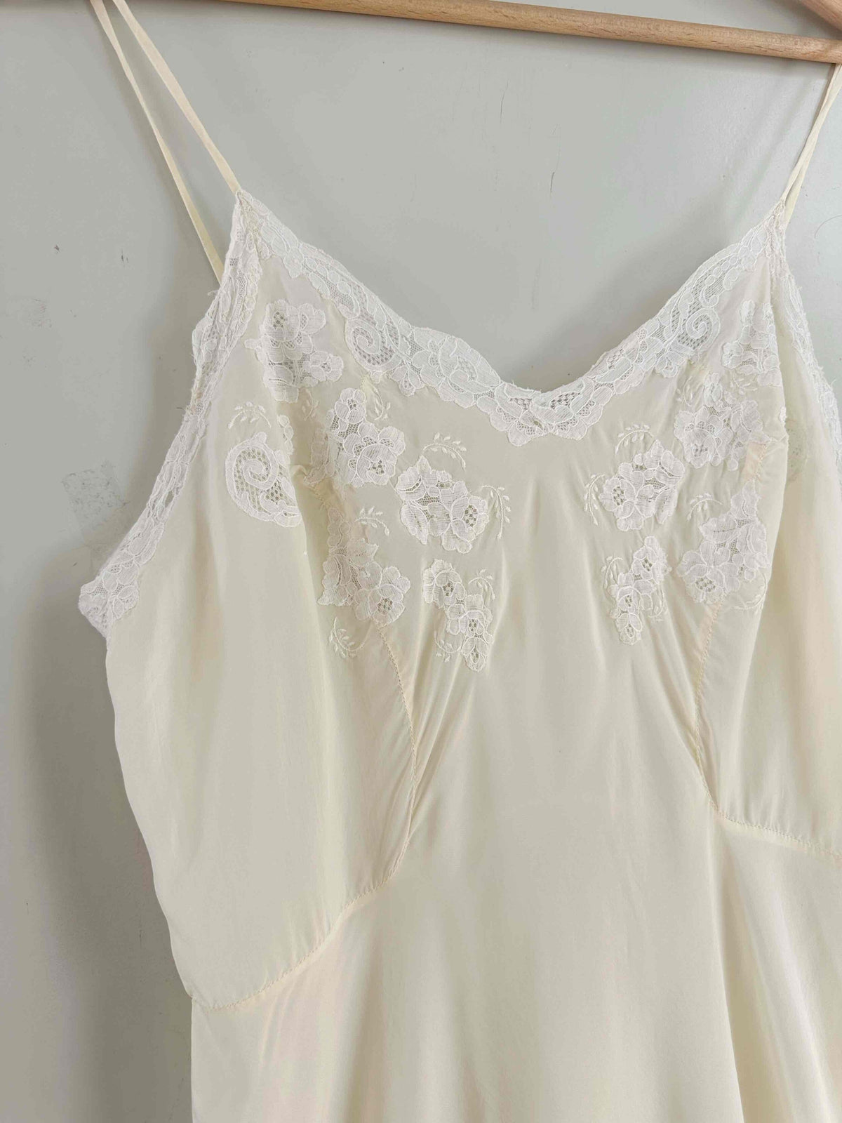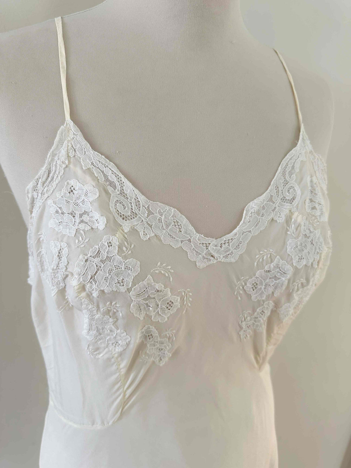 Nuisette en soie 50s, soie écru ivoire, bretelles spaghettis, encolure et bordure bas en dentelle chantilly appliquée et ajourée, années 50s, taille 36, portée ici sur un mannequin T36, aisselles 43 cm.