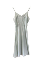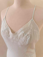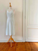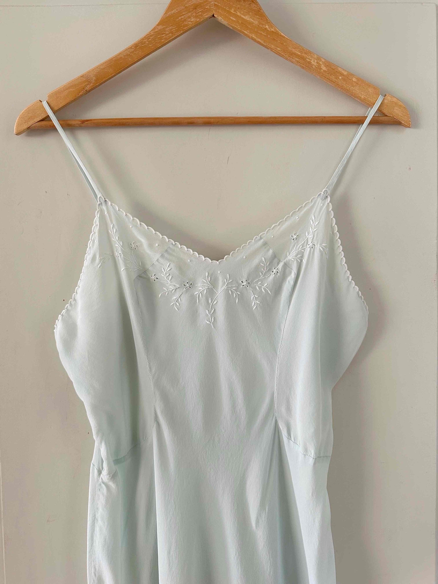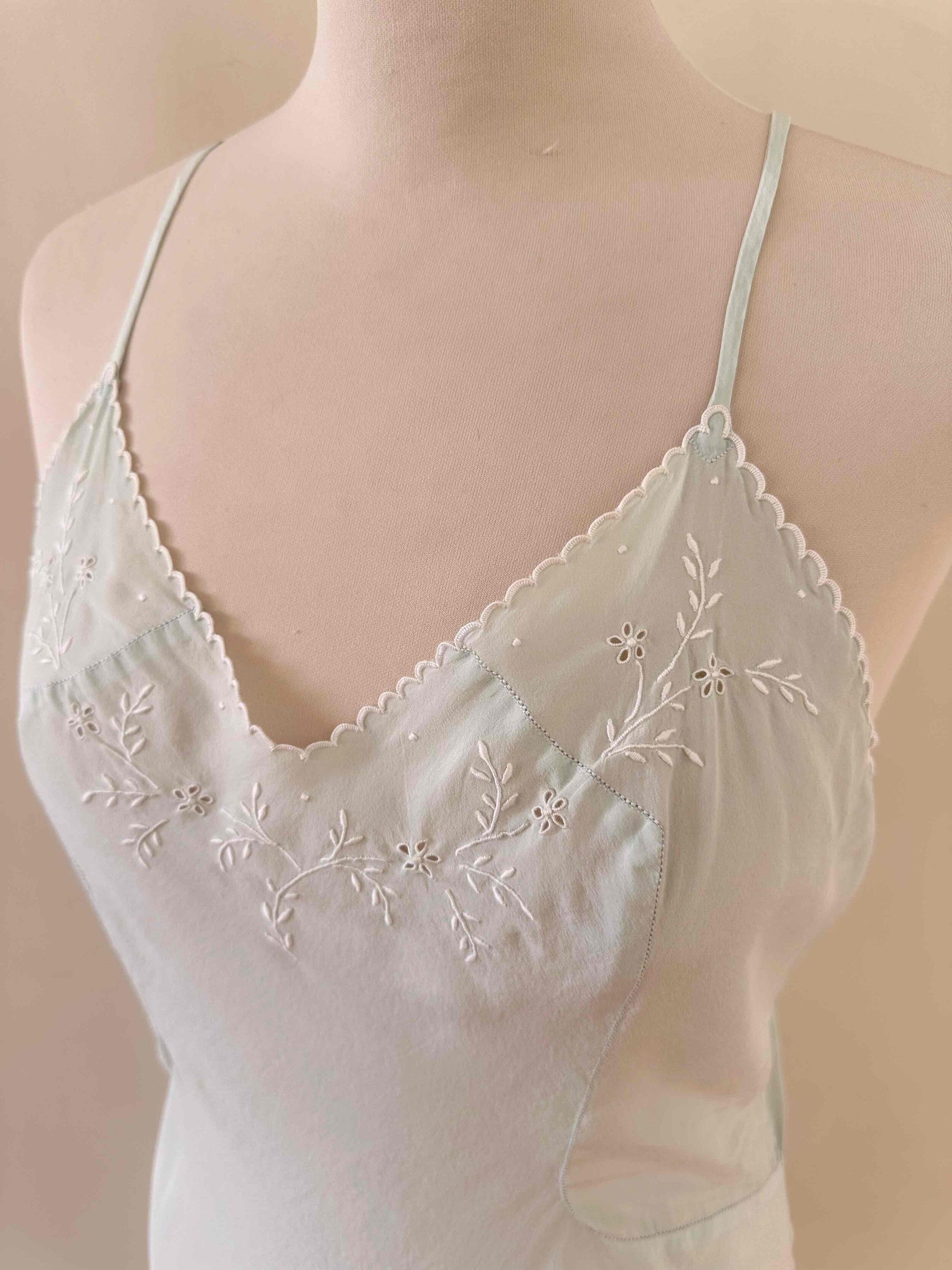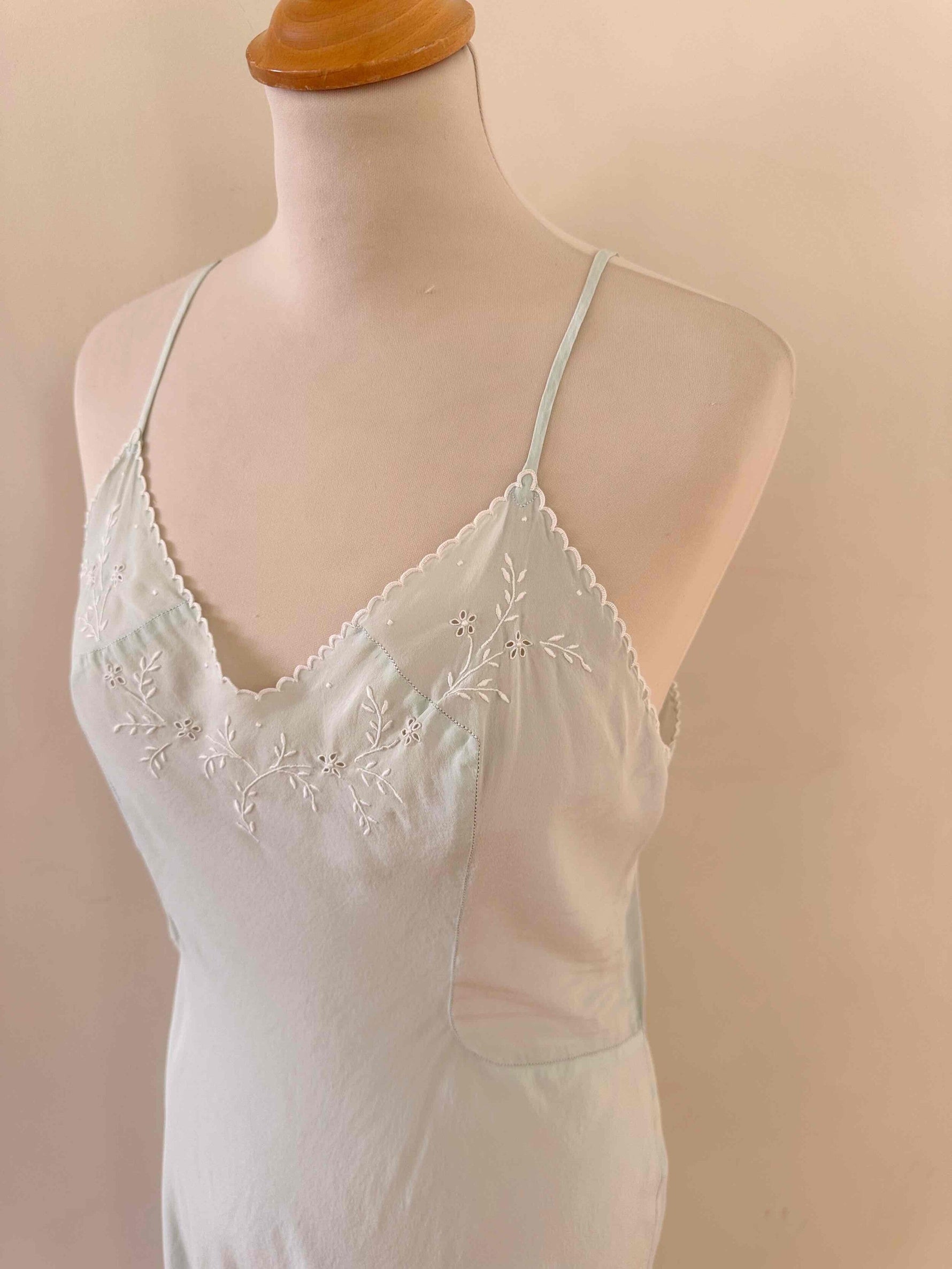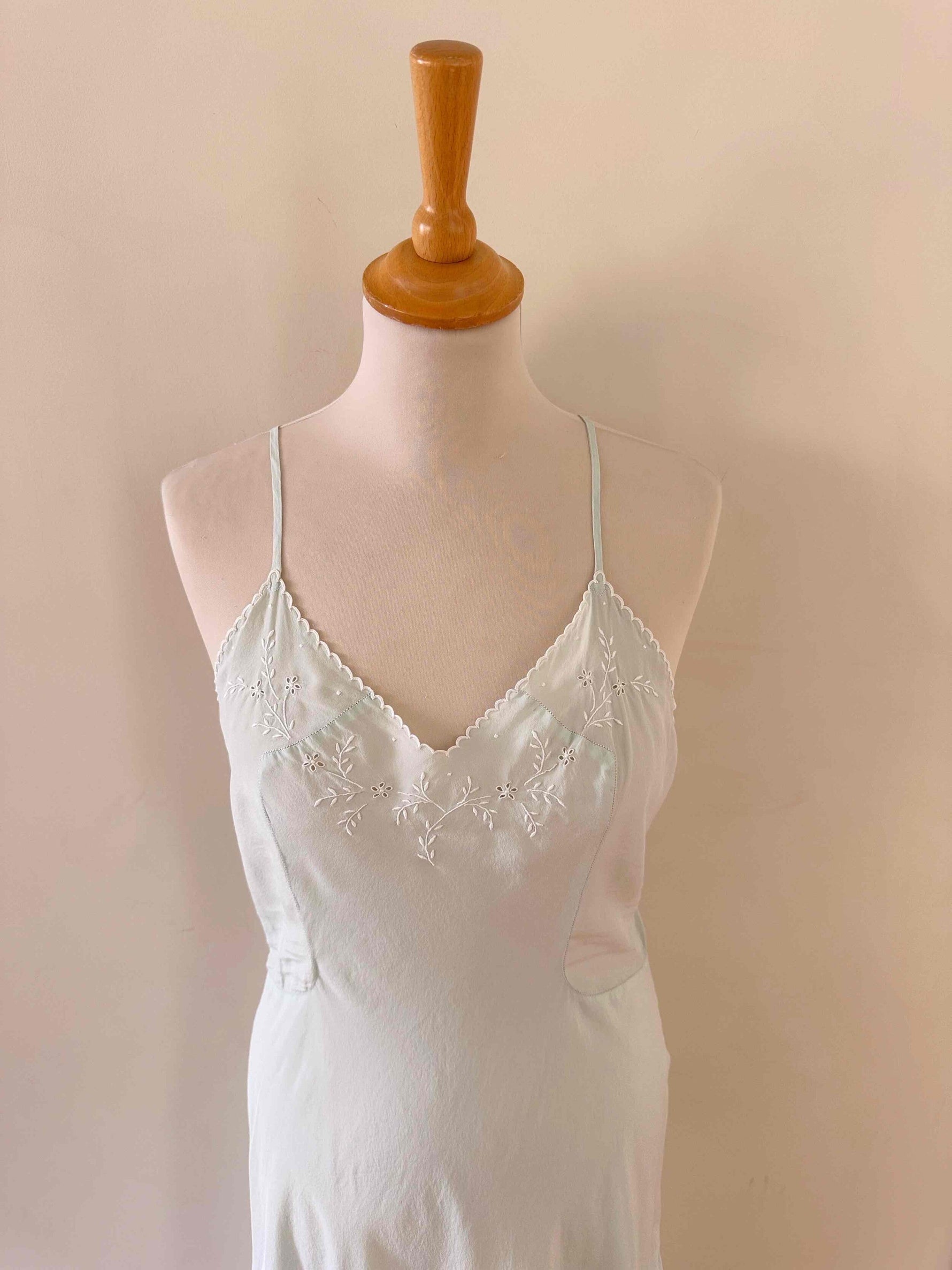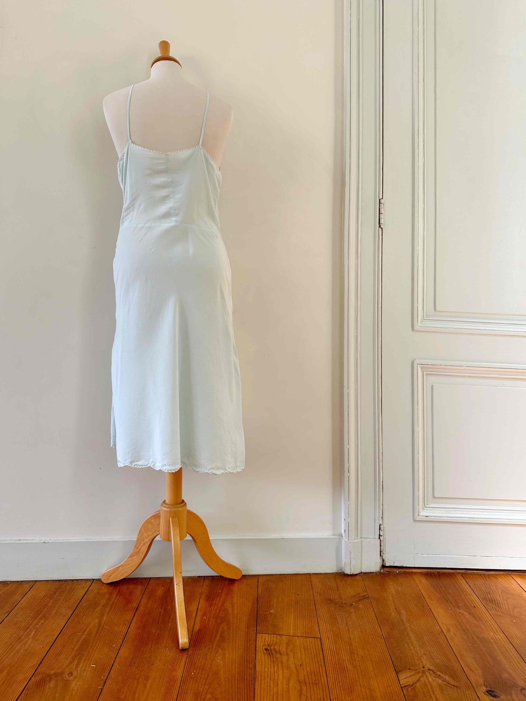 Prix unitaire parNuisette en soie 50s, soie bleu ciel vert d’eau, bretelles spaghettis, encolure et bordure bas brodée à la main de fleurs et ajourées, années 50s, taille 36, portée ici sur un mannequin T36, aisselles 43 cm.