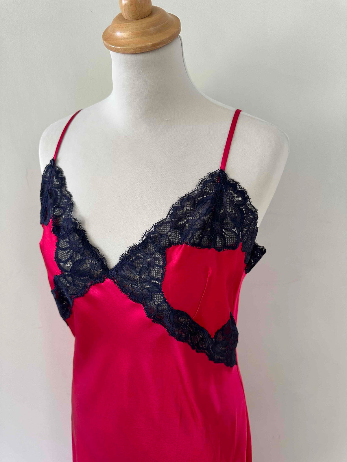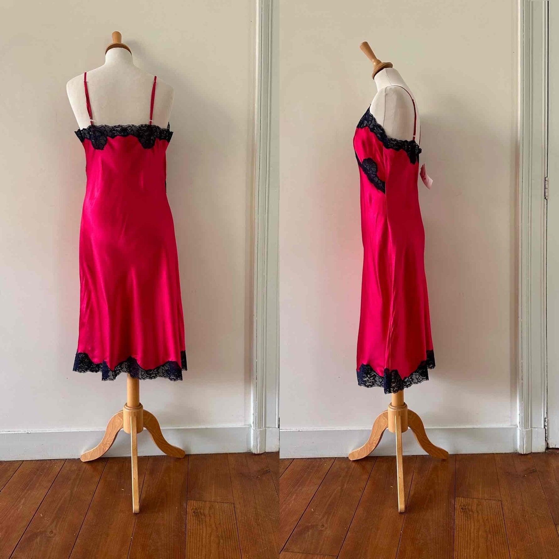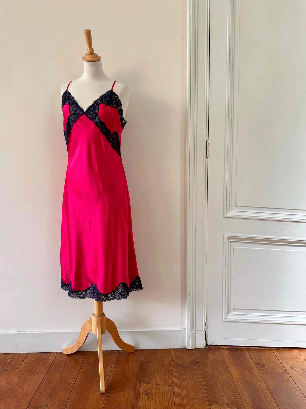 Robe nuisette en soie satin, rouge bordures en dentelle noire, bretelles spaghettis réglables, découpes sous poitrine en dentelle noire ajourées, taillée en biais, fabriquée en Italie, taille 38 portée ici sur un mannequin T36, aisselles 45cm. Deadstock avec étiquette d’origine.