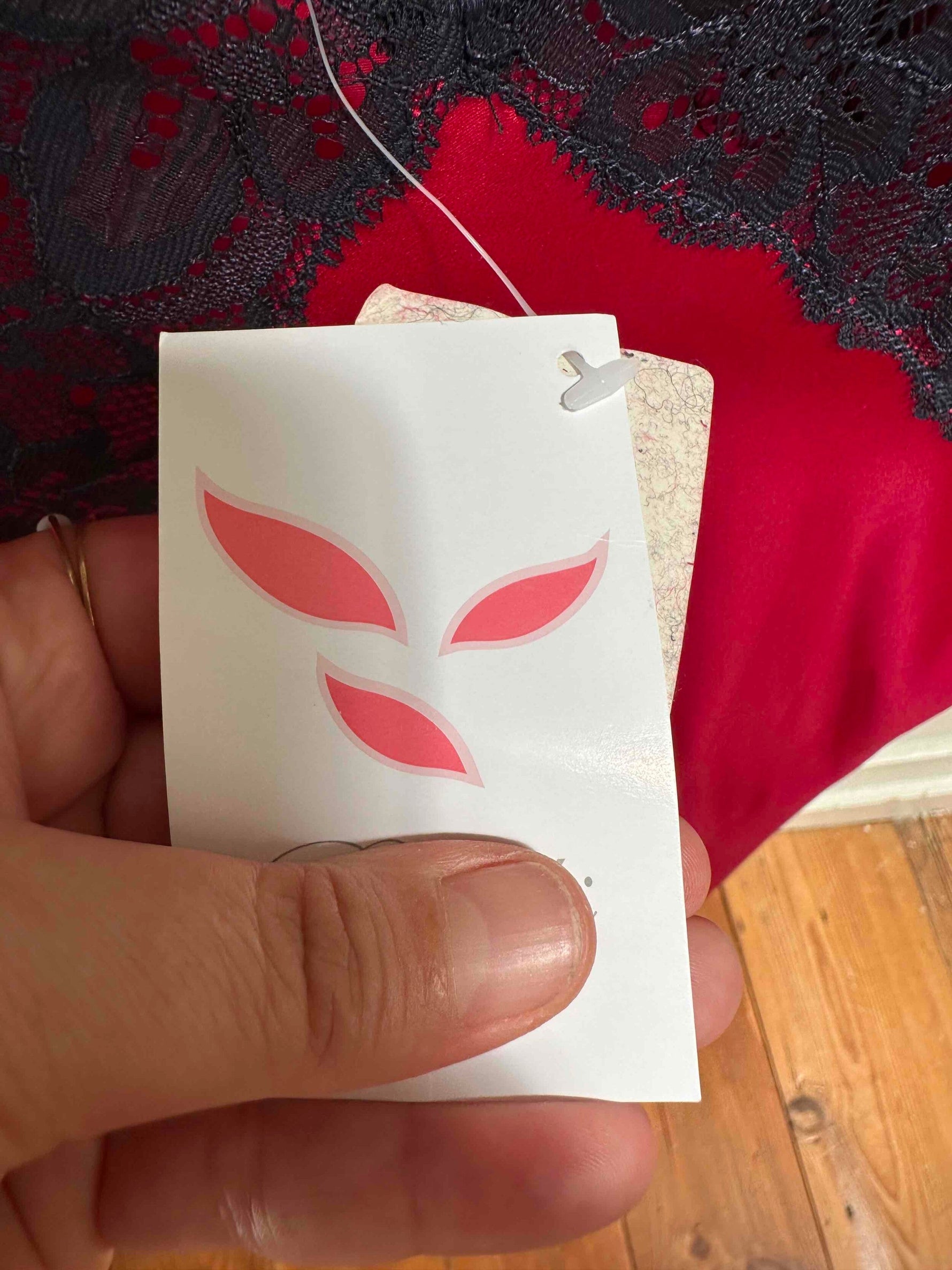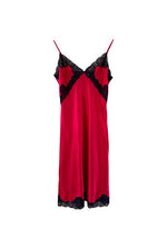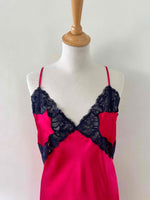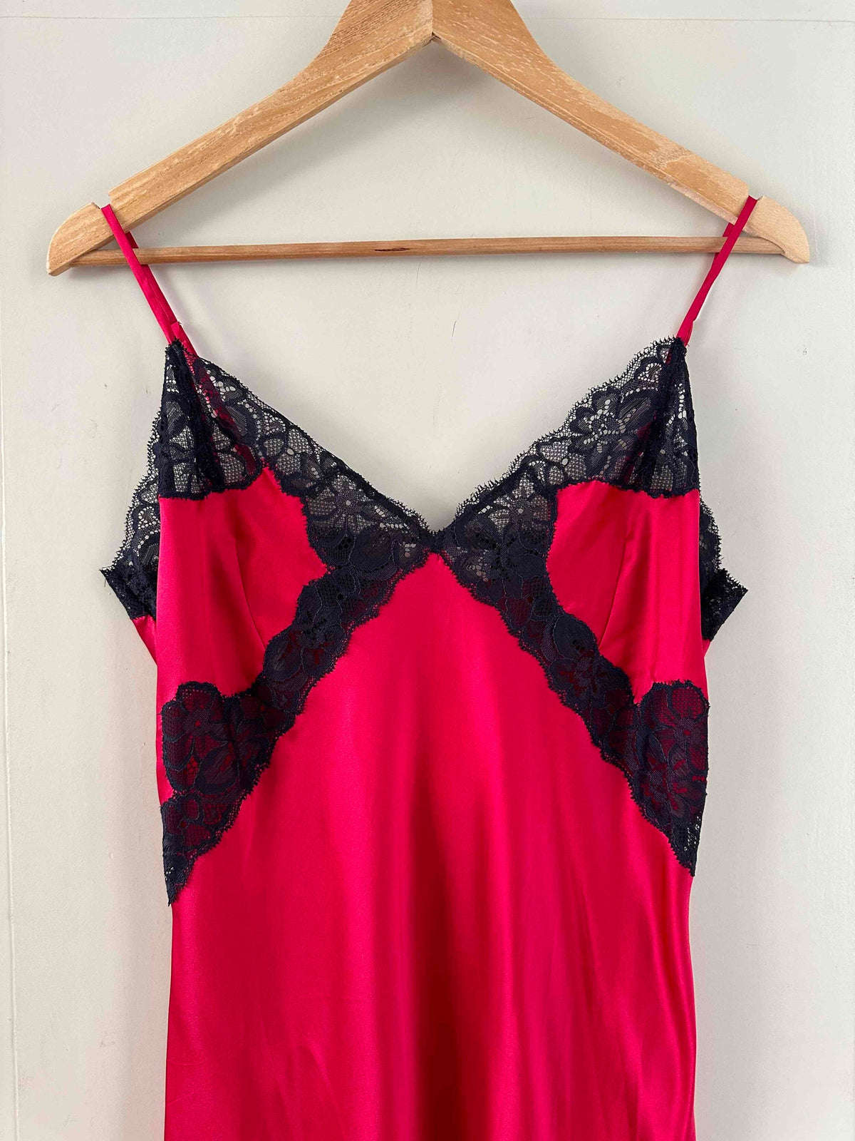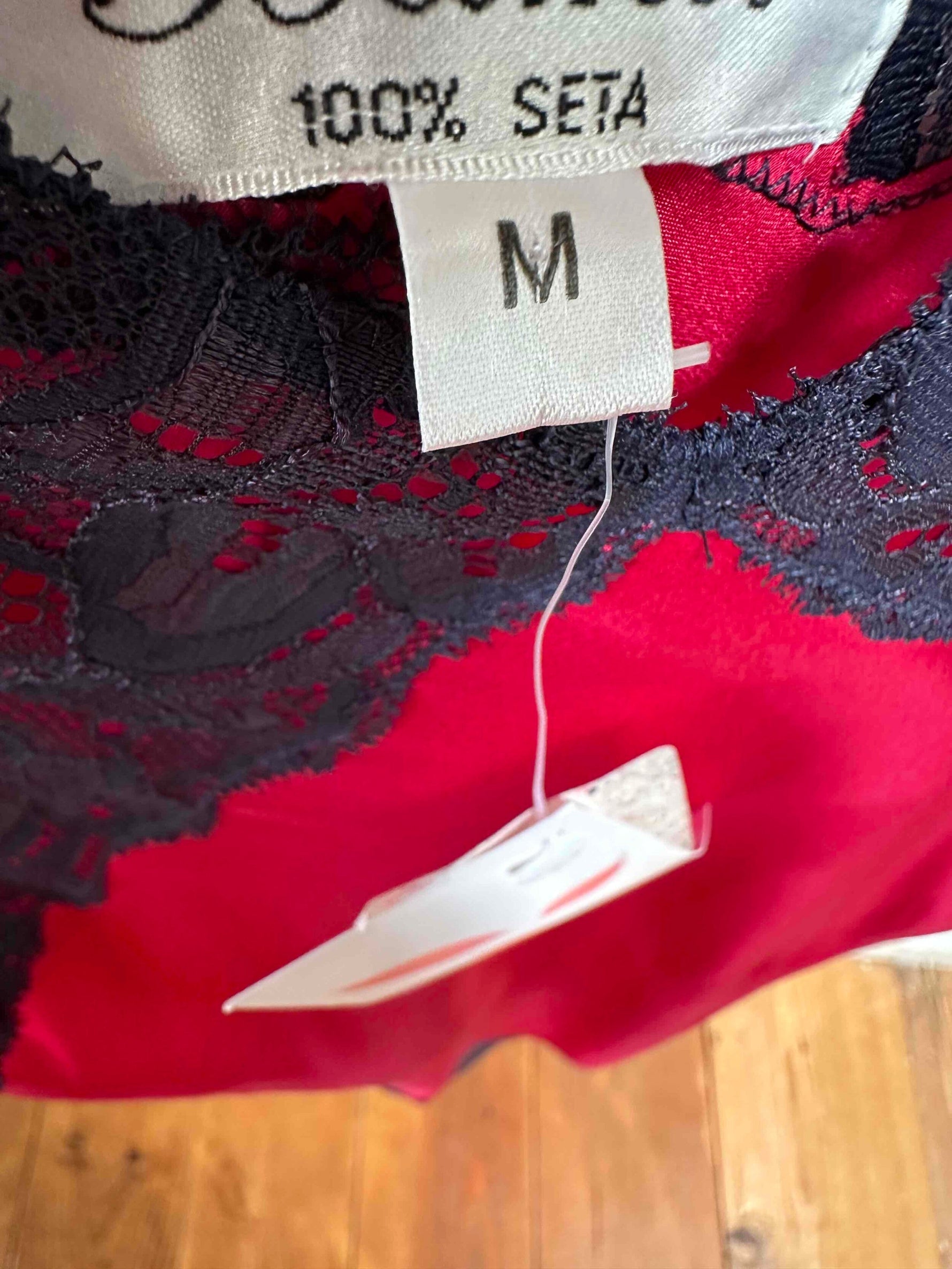 Robe nuisette en soie satin, rouge bordures en dentelle noire, bretelles spaghettis réglables, découpes sous poitrine en dentelle noire ajourées, taillée en biais, fabriquée en Italie, taille 38 portée ici sur un mannequin T36, aisselles 45cm. Deadstock avec étiquette d’origine.