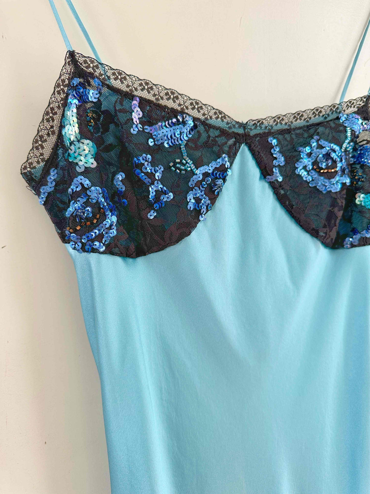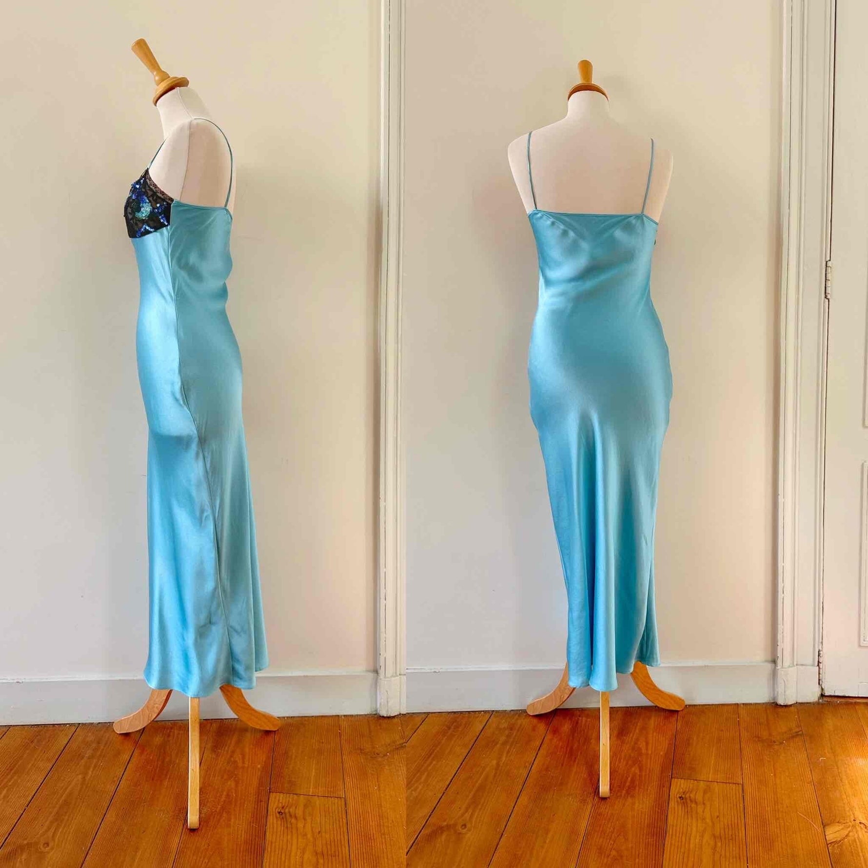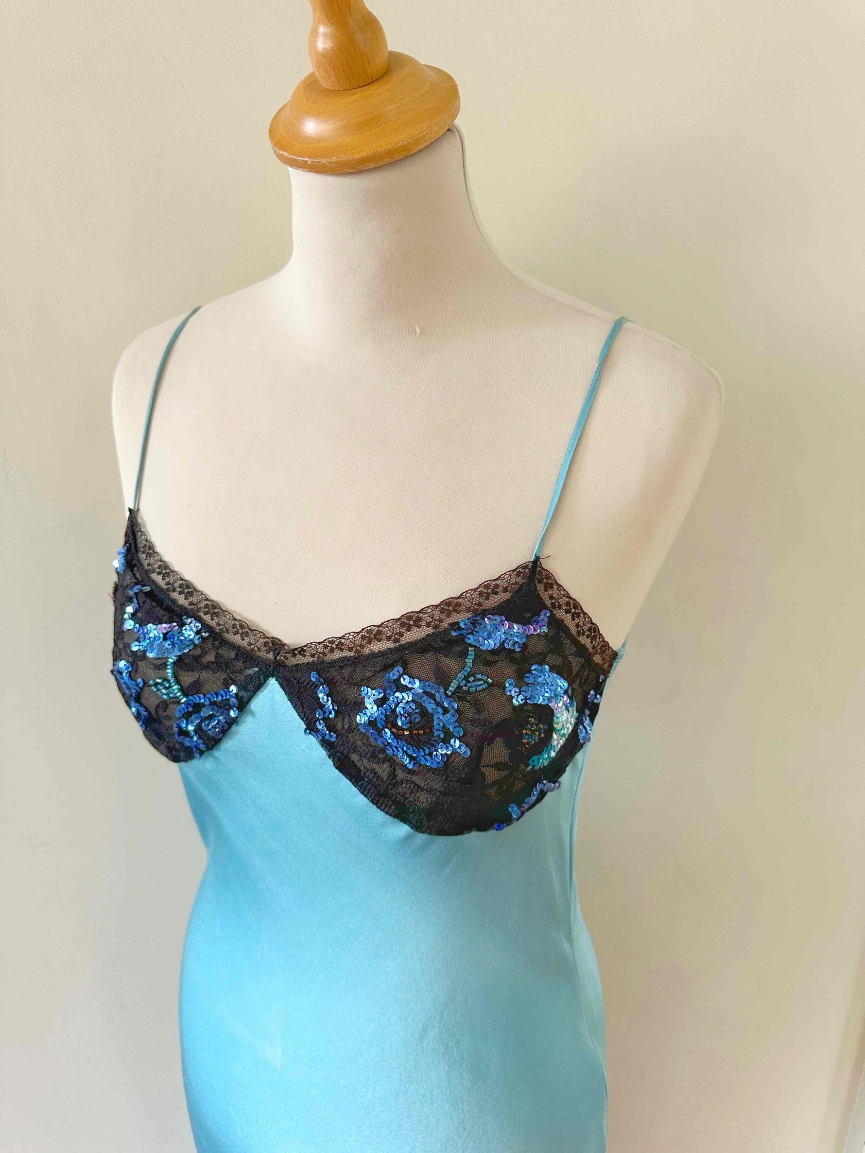 Prix unitaire parRobe nuisette en soie, satin de soie bleu piscine, poitrine ajourée de dentelle noire et rebrodée de sequins, bretelles spaghettis, taillée en biais, fabriquée en Italie, taille 34 et 36 portée ici sur un mannequin T36, aisselles 43cm.