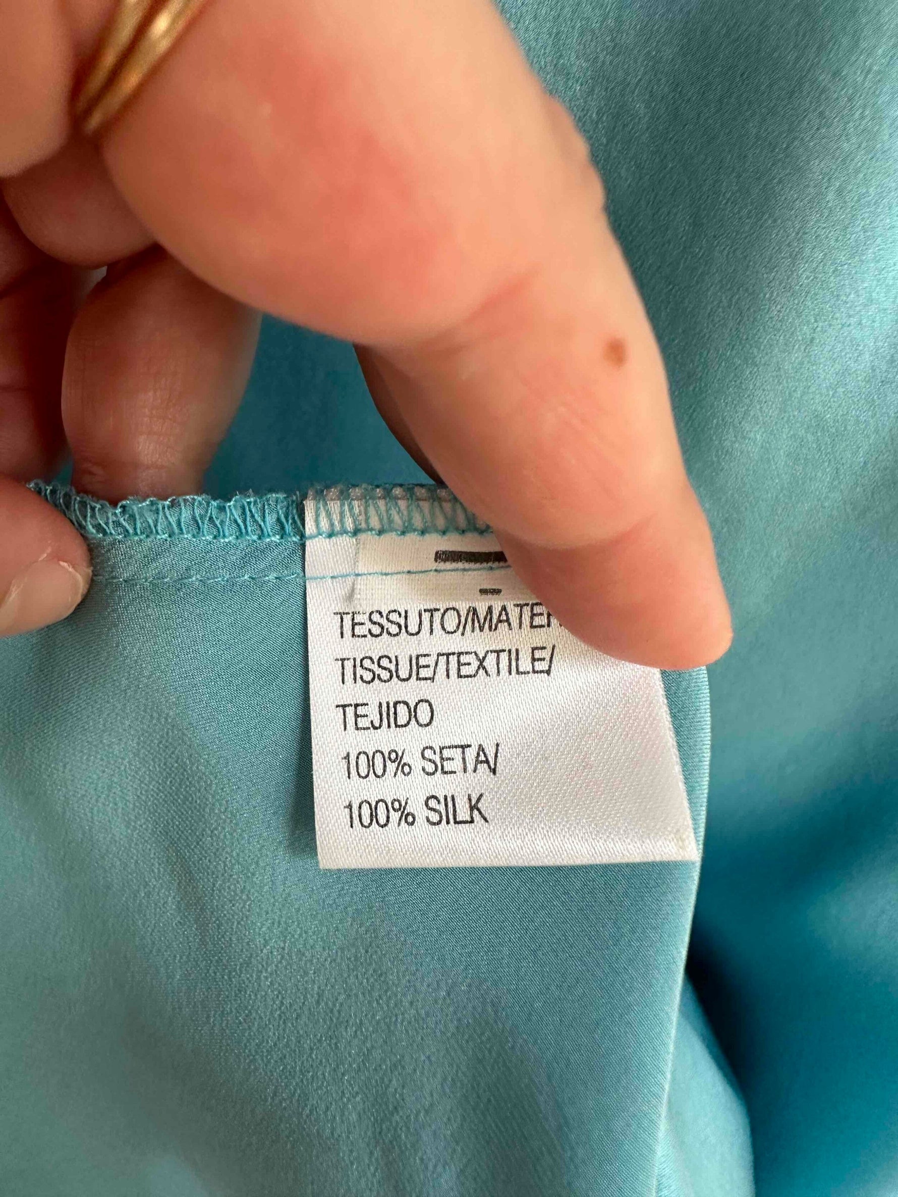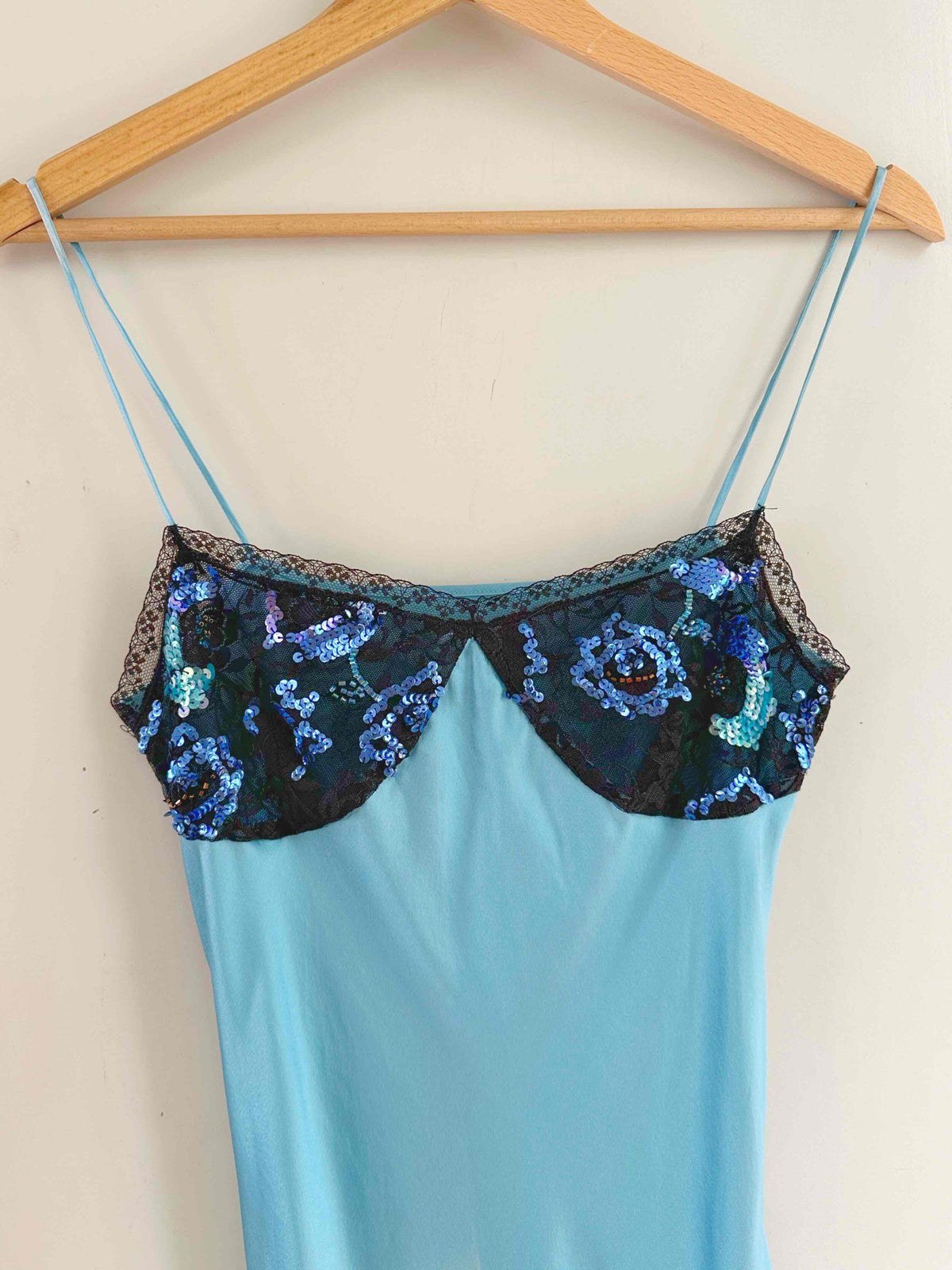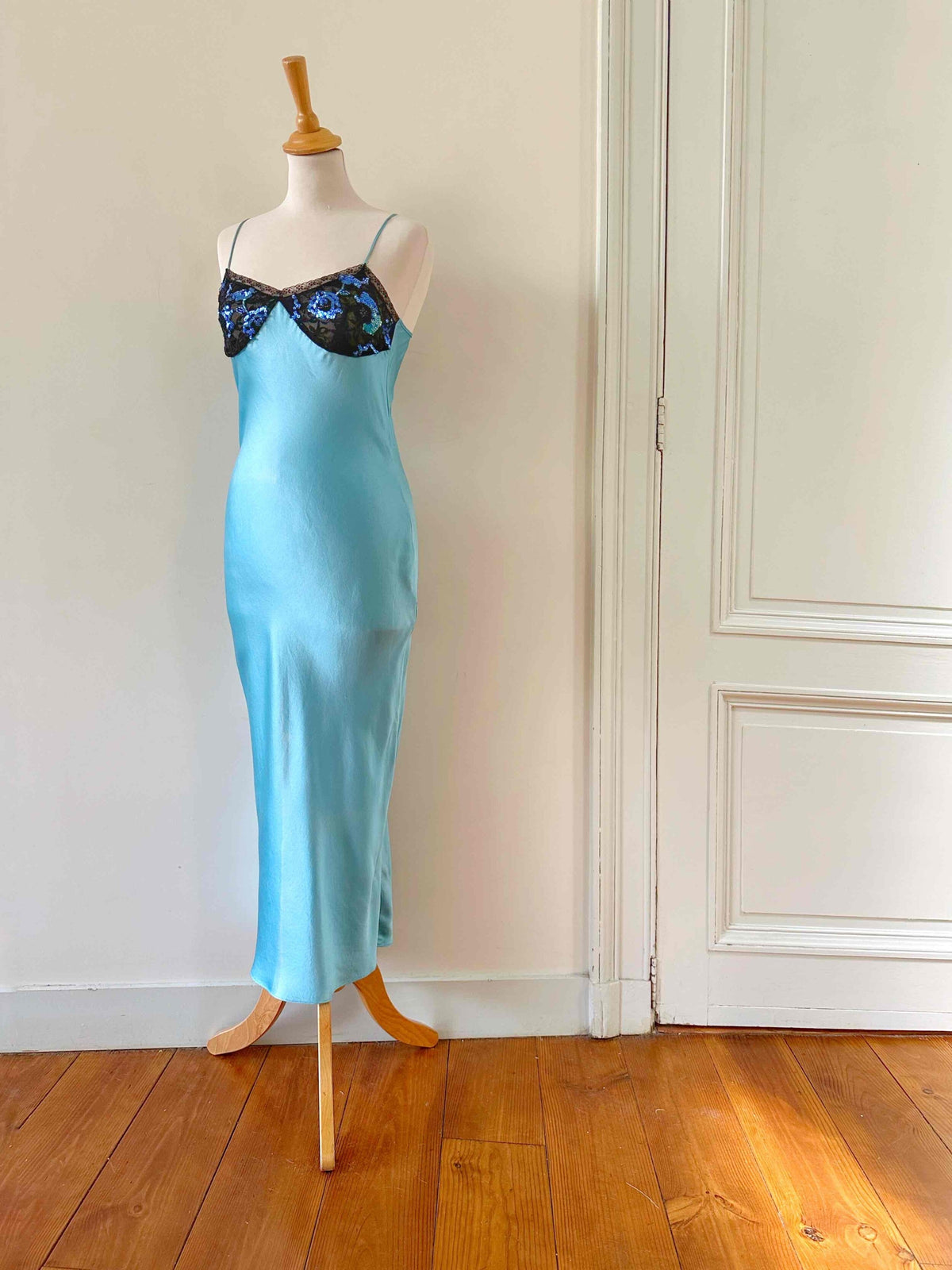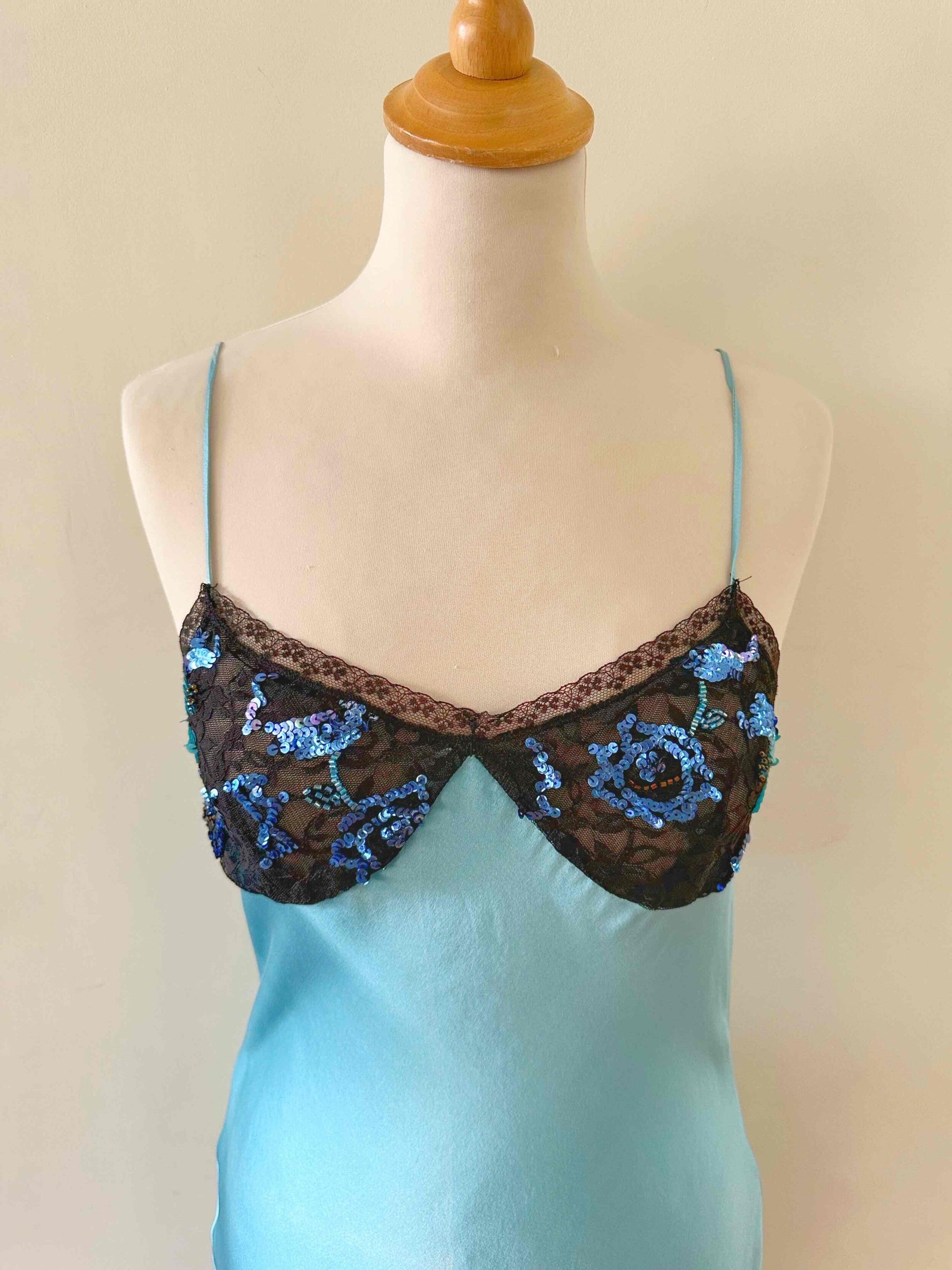 Prix unitaire parRobe nuisette en soie, satin de soie bleu piscine, poitrine ajourée de dentelle noire et rebrodée de sequins, bretelles spaghettis, taillée en biais, fabriquée en Italie, taille 34 et 36 portée ici sur un mannequin T36, aisselles 43cm.