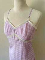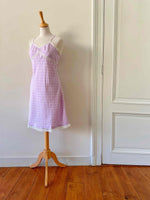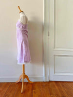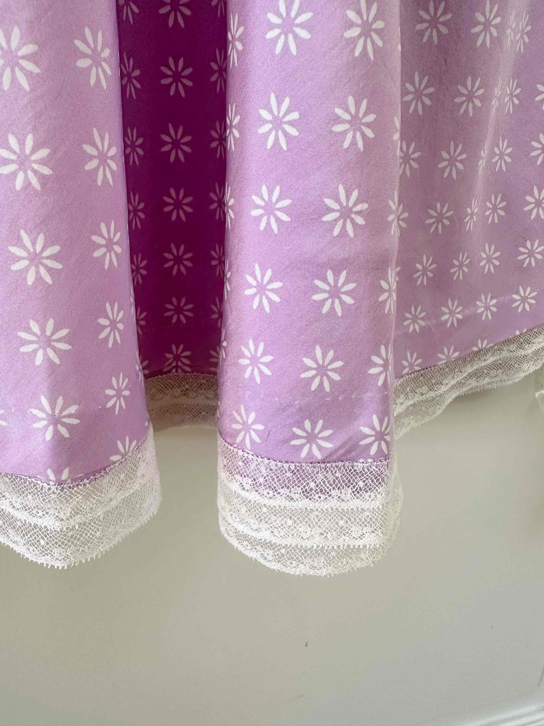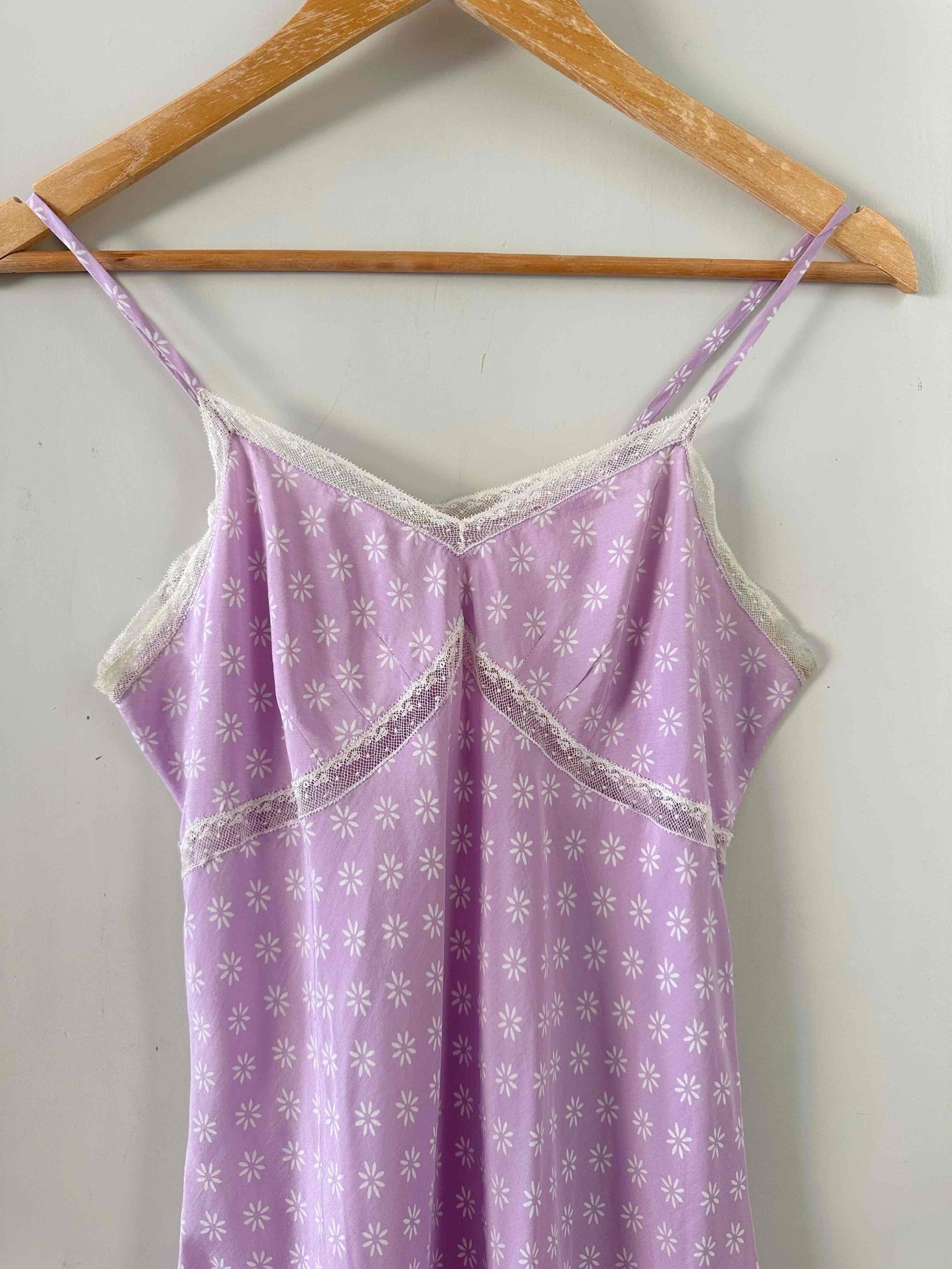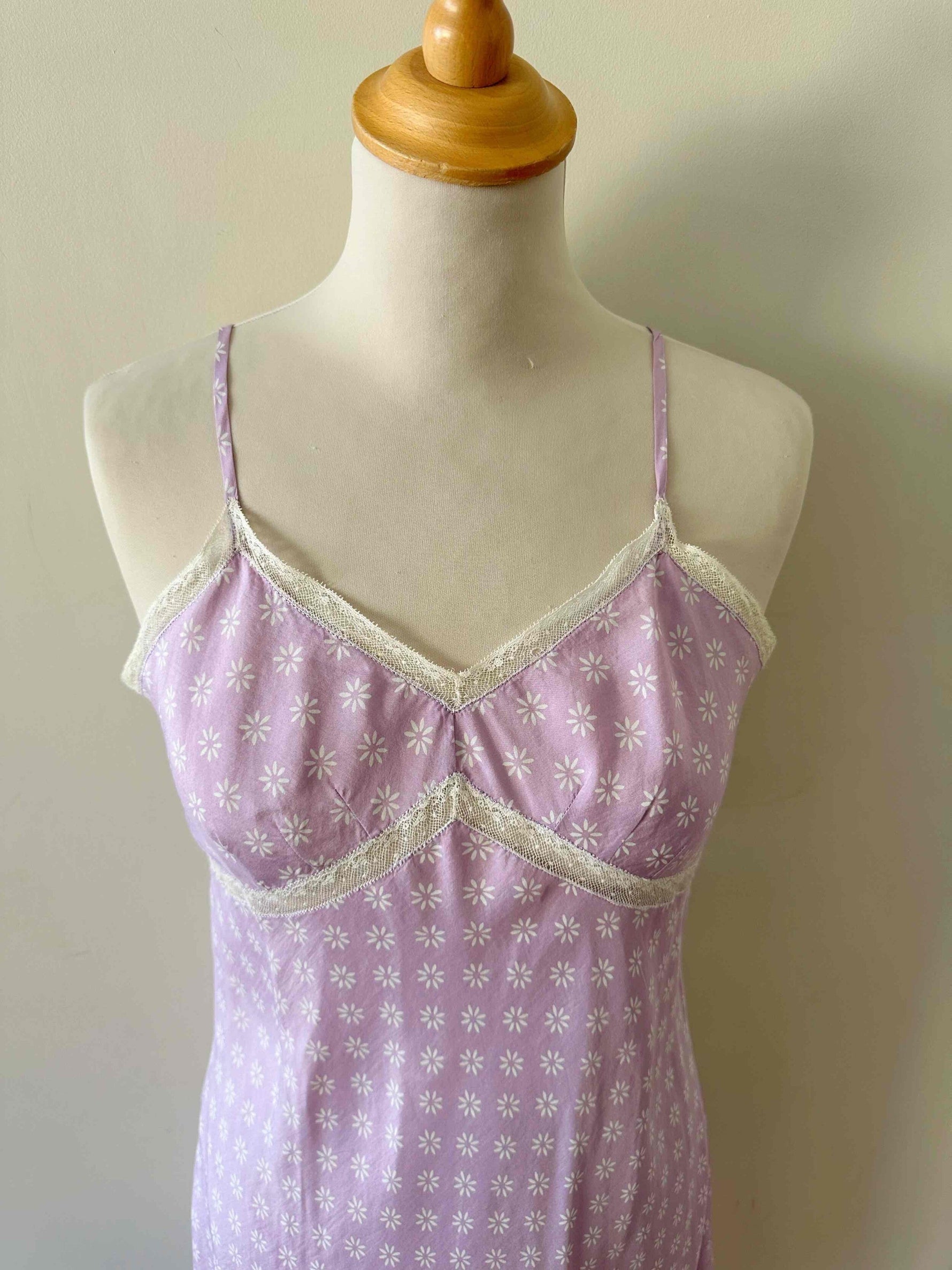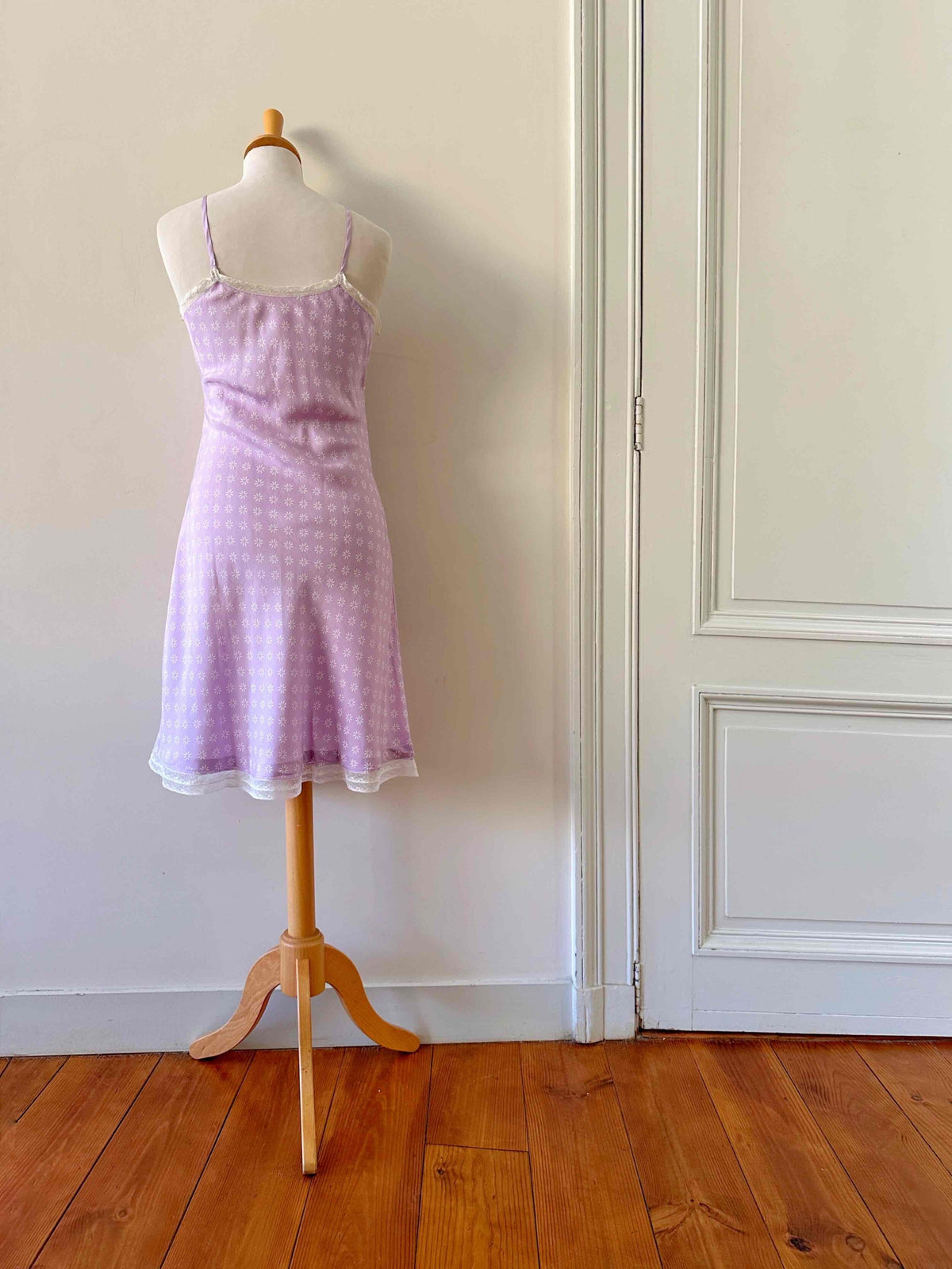 Prix unitaire parNuisette en soie 60s, soie lilas parme imprimée de fleurs blanches, découpes sous poitrine en dentelle fine ajourée, bas bordé de dentelle, bretelles spaghettis, taillée en biais, taille 36 portée ici sur un mannequin T36, aisselles 43cm.