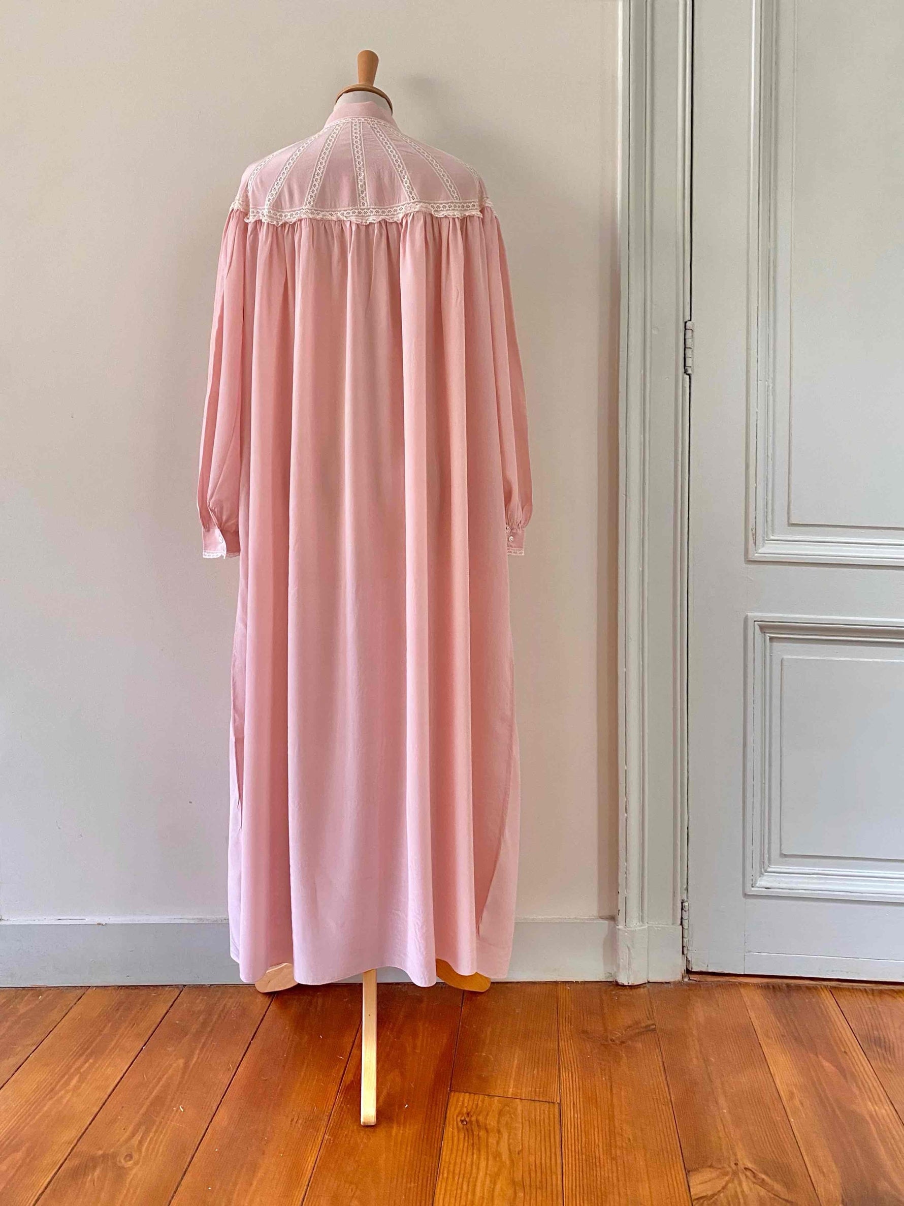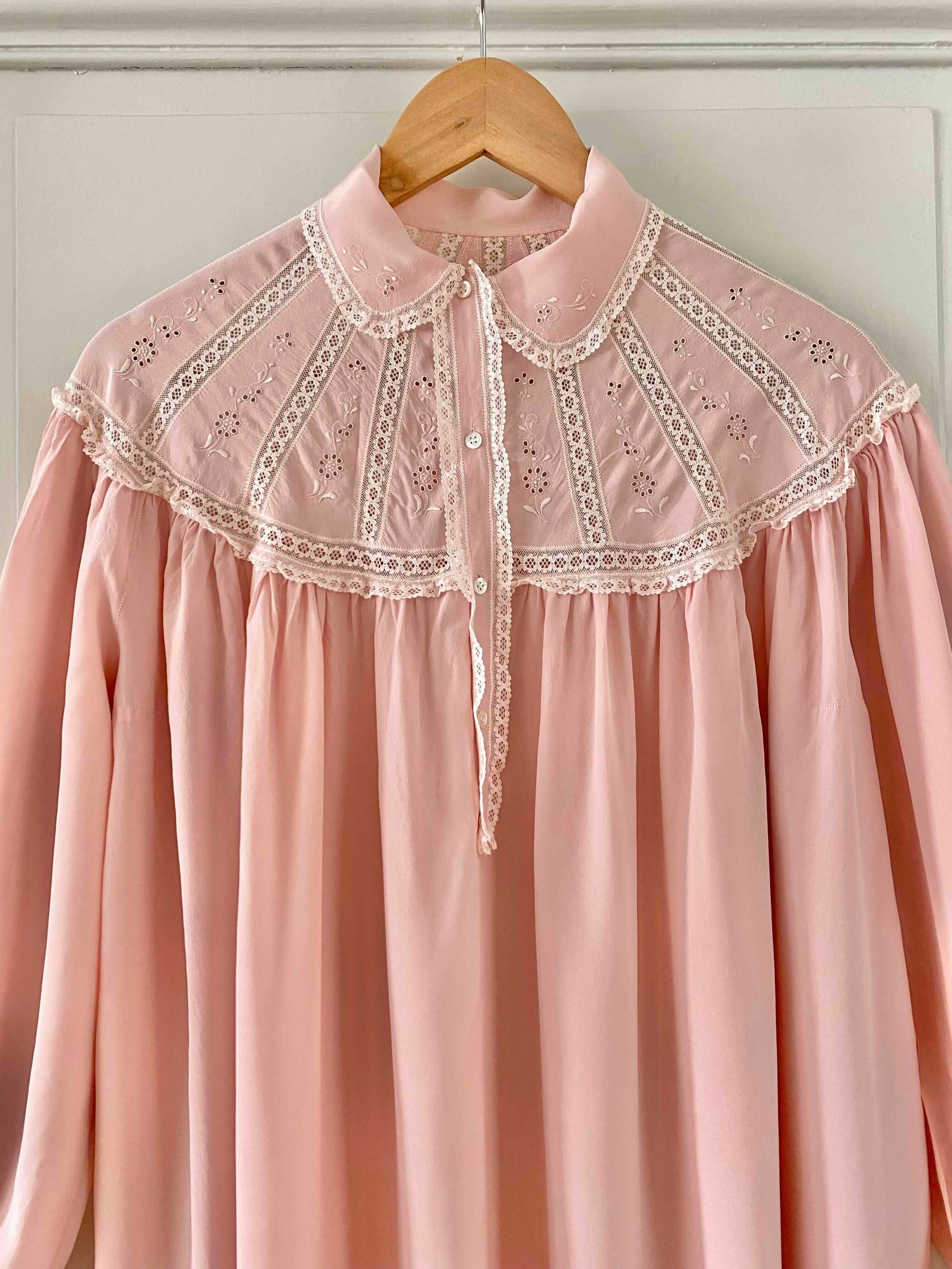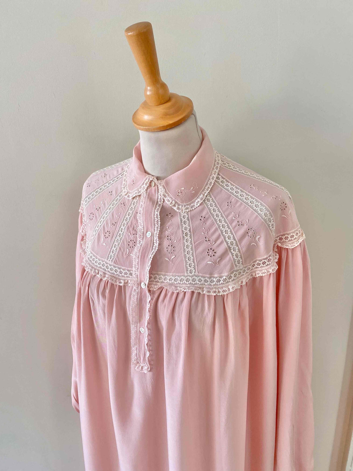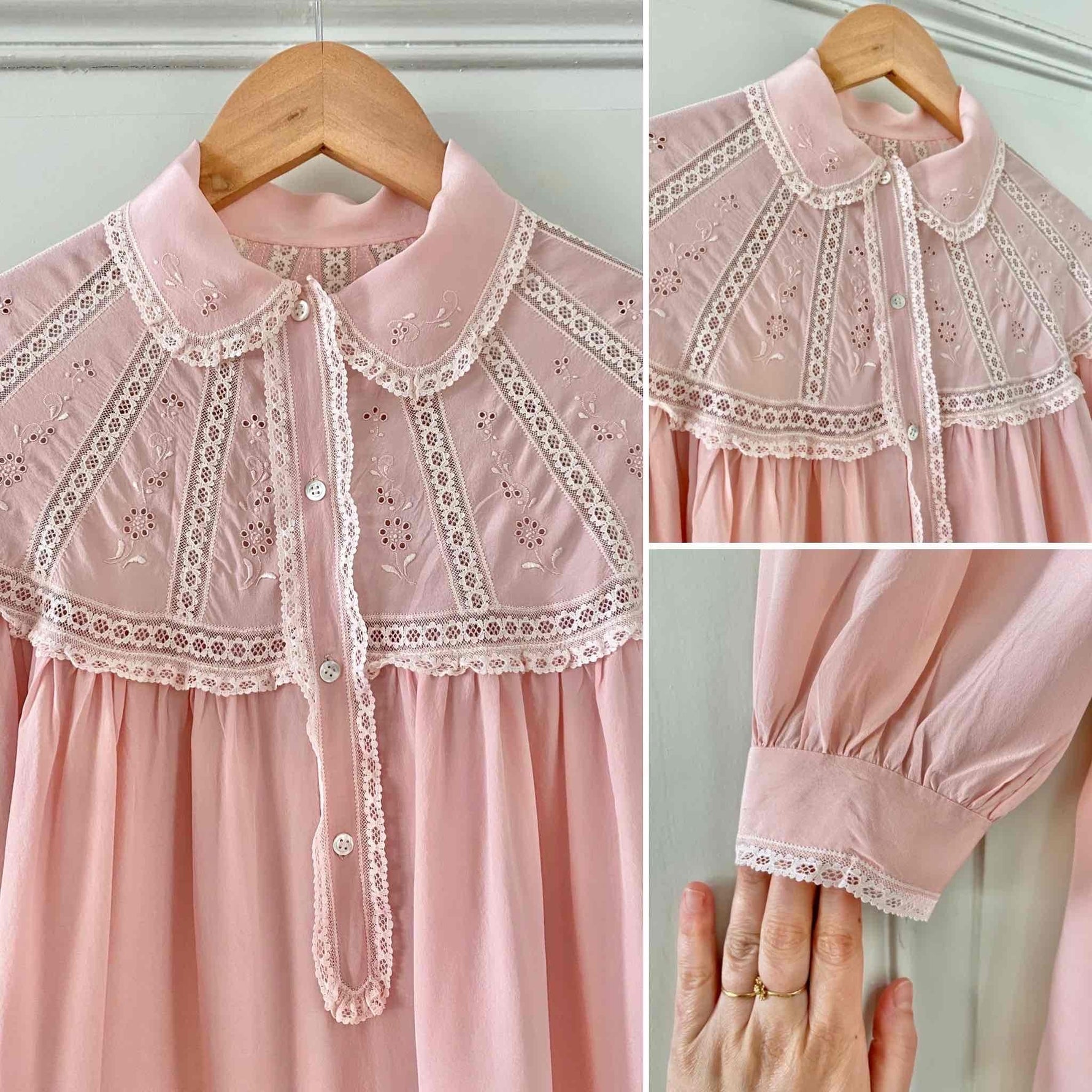 Prix unitaire parNuisette en soie brodée, soie rose pastel, avec plastron et col claudine brodé de fleurs ajourées et dentelle fine brodée mains, manches longues ballons, longueur maxi et trapèze plissée, années 60’s, taille 36 et 38 portée ici sur un mannequin T36, aisselles 48cm.