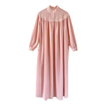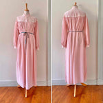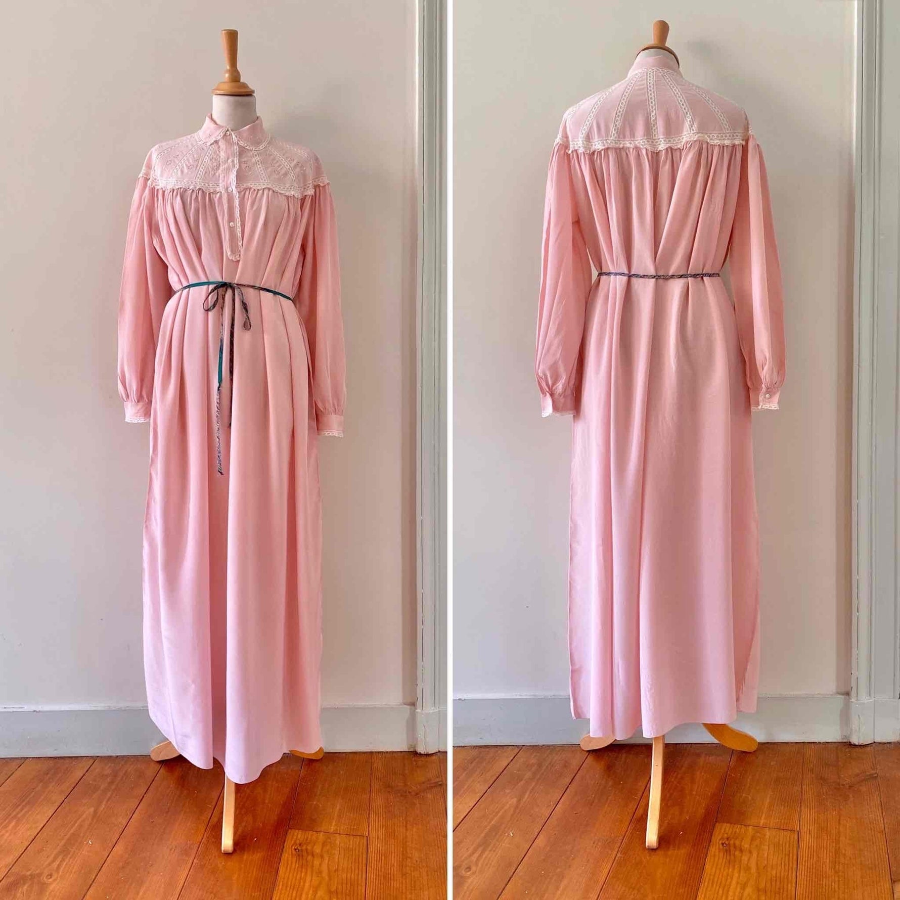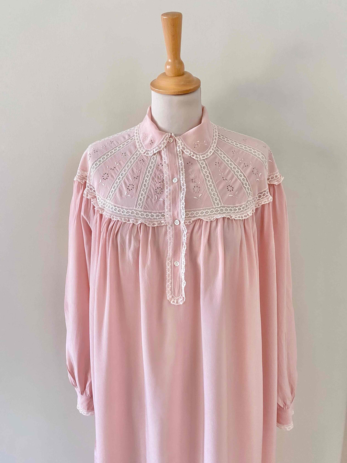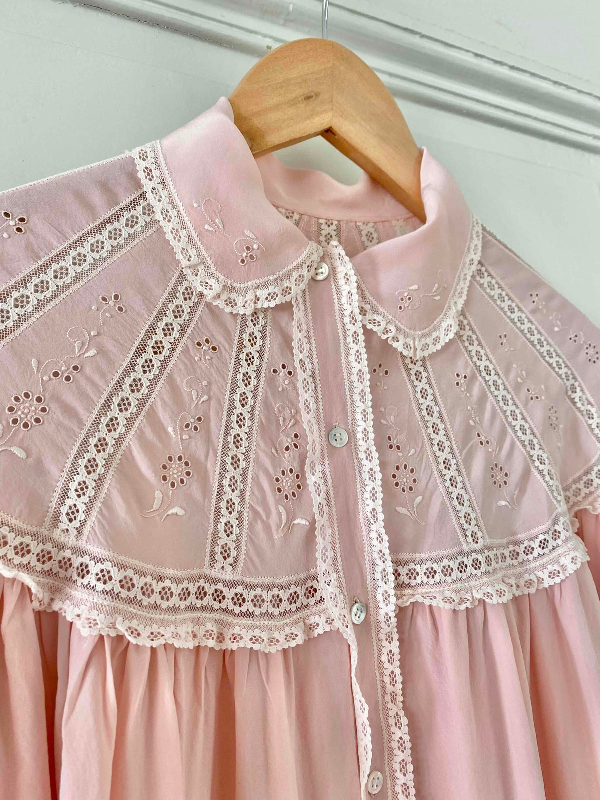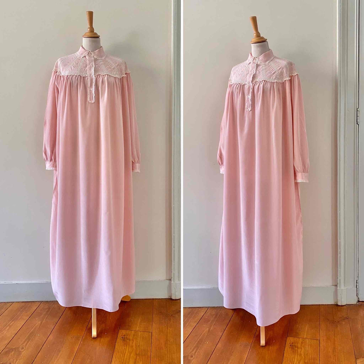 Prix unitaire parNuisette en soie brodée, soie rose pastel, avec plastron et col claudine brodé de fleurs ajourées et dentelle fine brodée mains, manches longues ballons, longueur maxi et trapèze plissée, années 60’s, taille 36 et 38 portée ici sur un mannequin T36, aisselles 48cm.