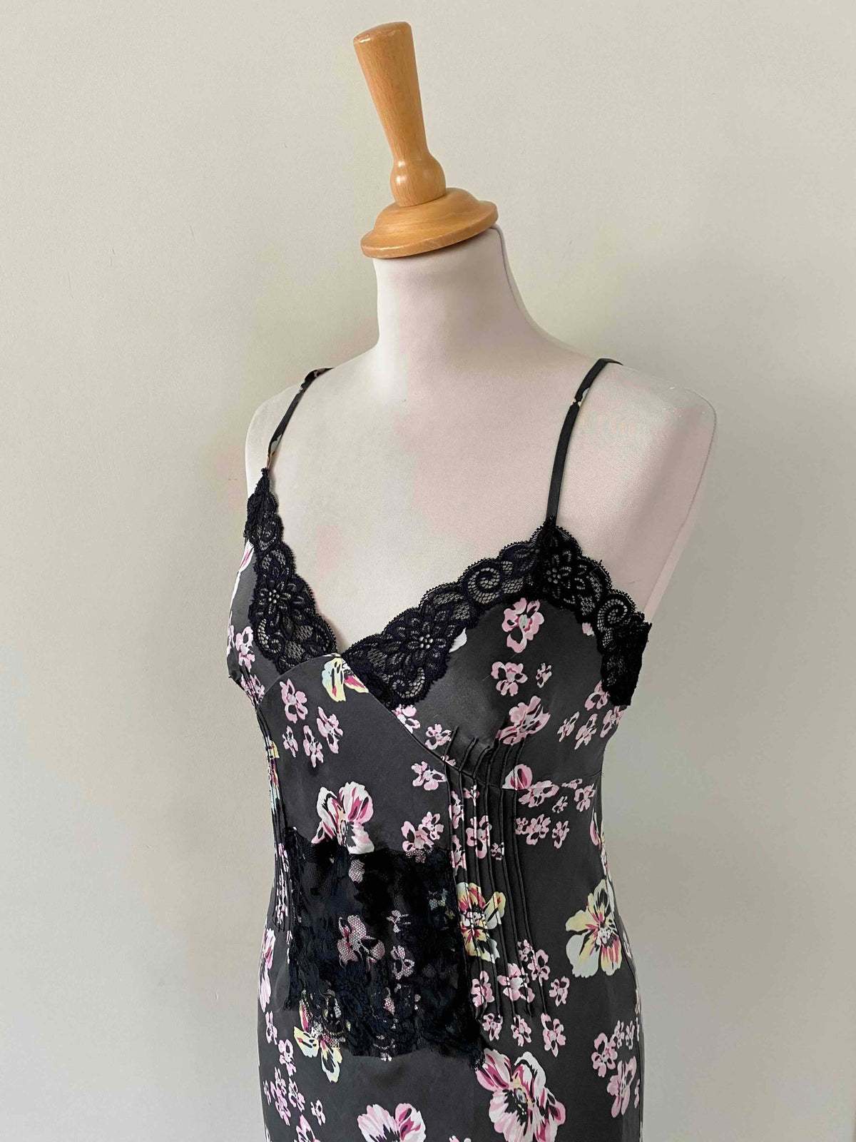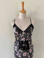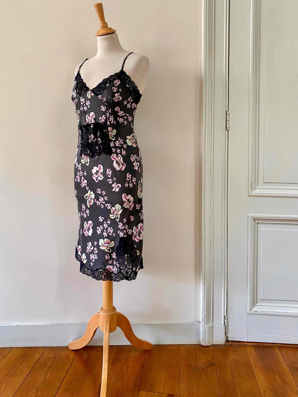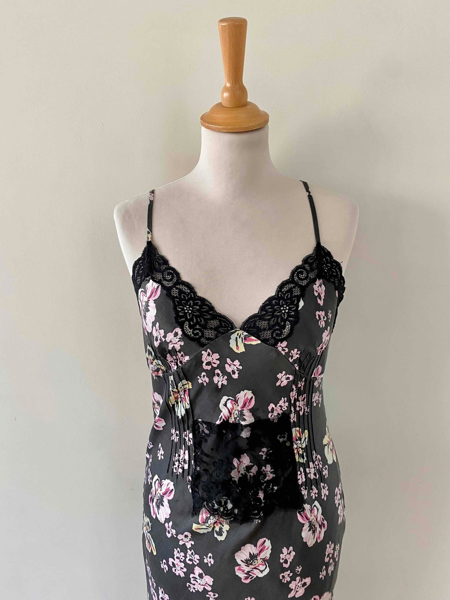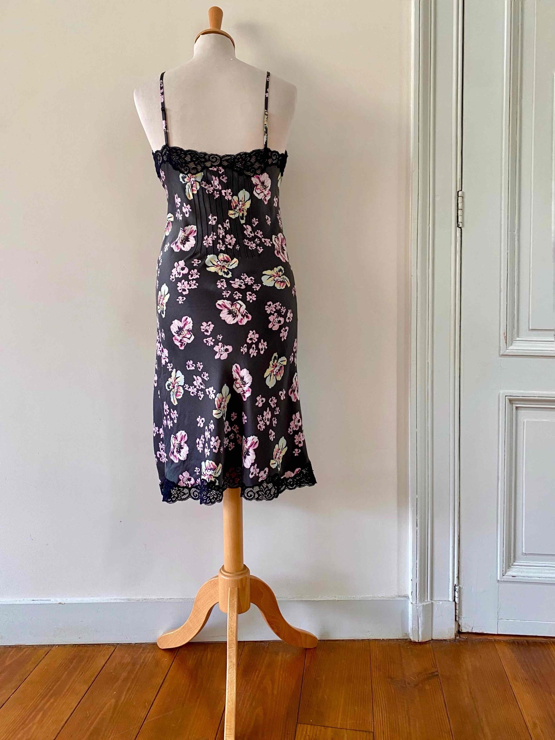 Robe nuisette en soie satin lavée noire imprimée fleurs roses, jaunes et bleu ciel, plis nervurés, plastron, bordures encolure et bas fendu en dentelle noire, bretelles spaghettis réglables, Alain Manoukian y2k, taille 36 portée ici sur un mannequin T36, aisselles 43cm.