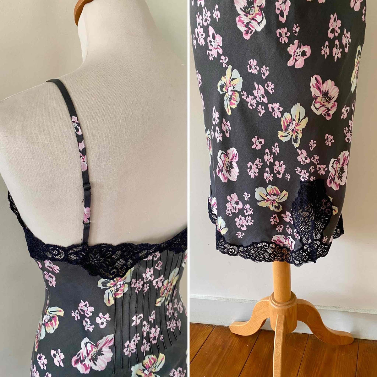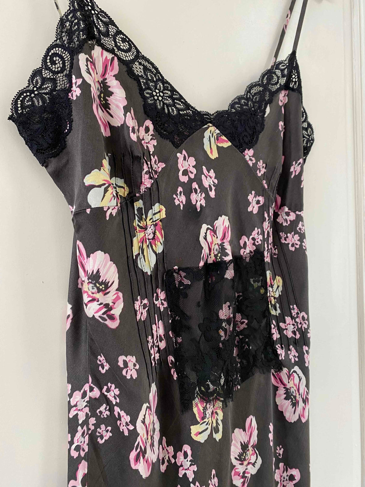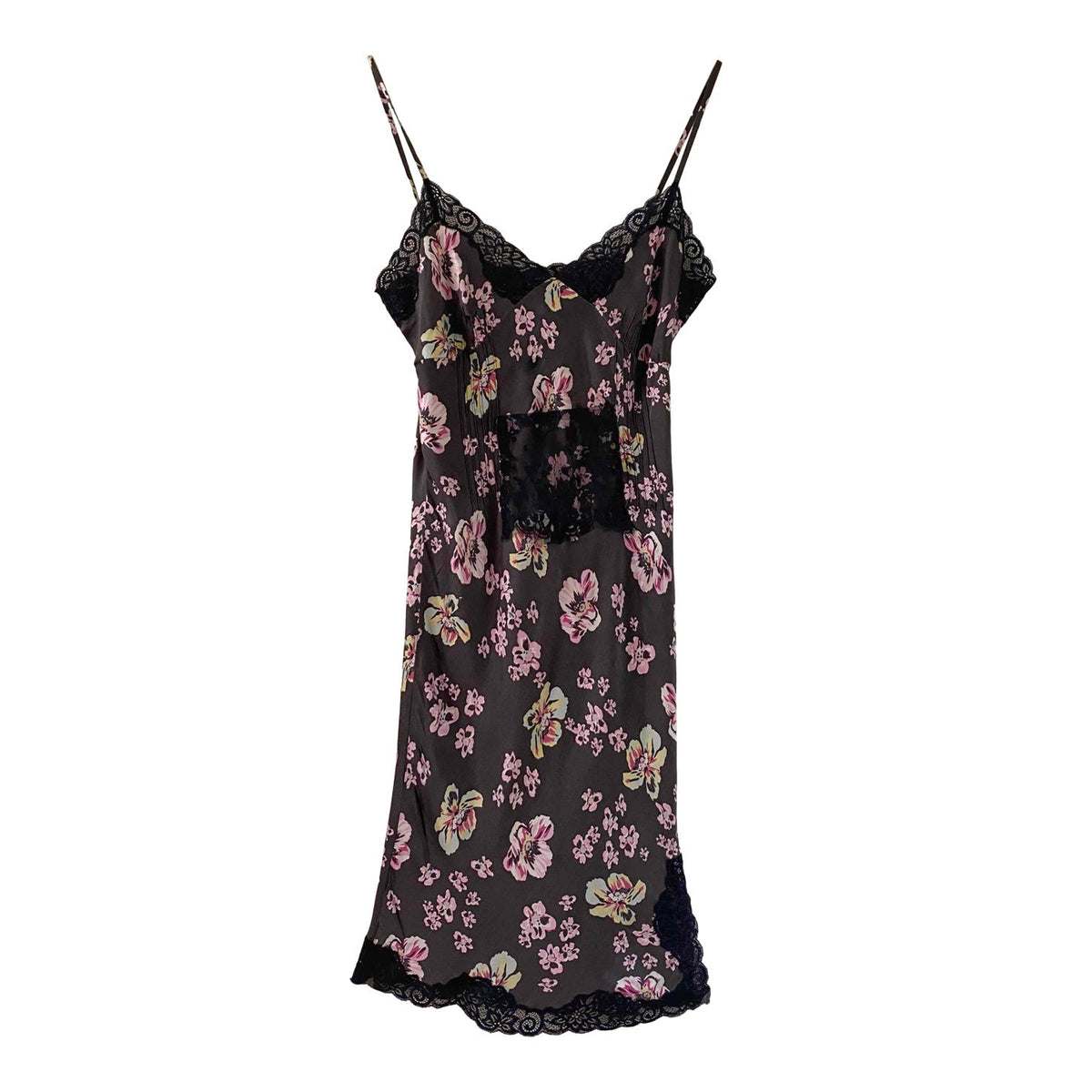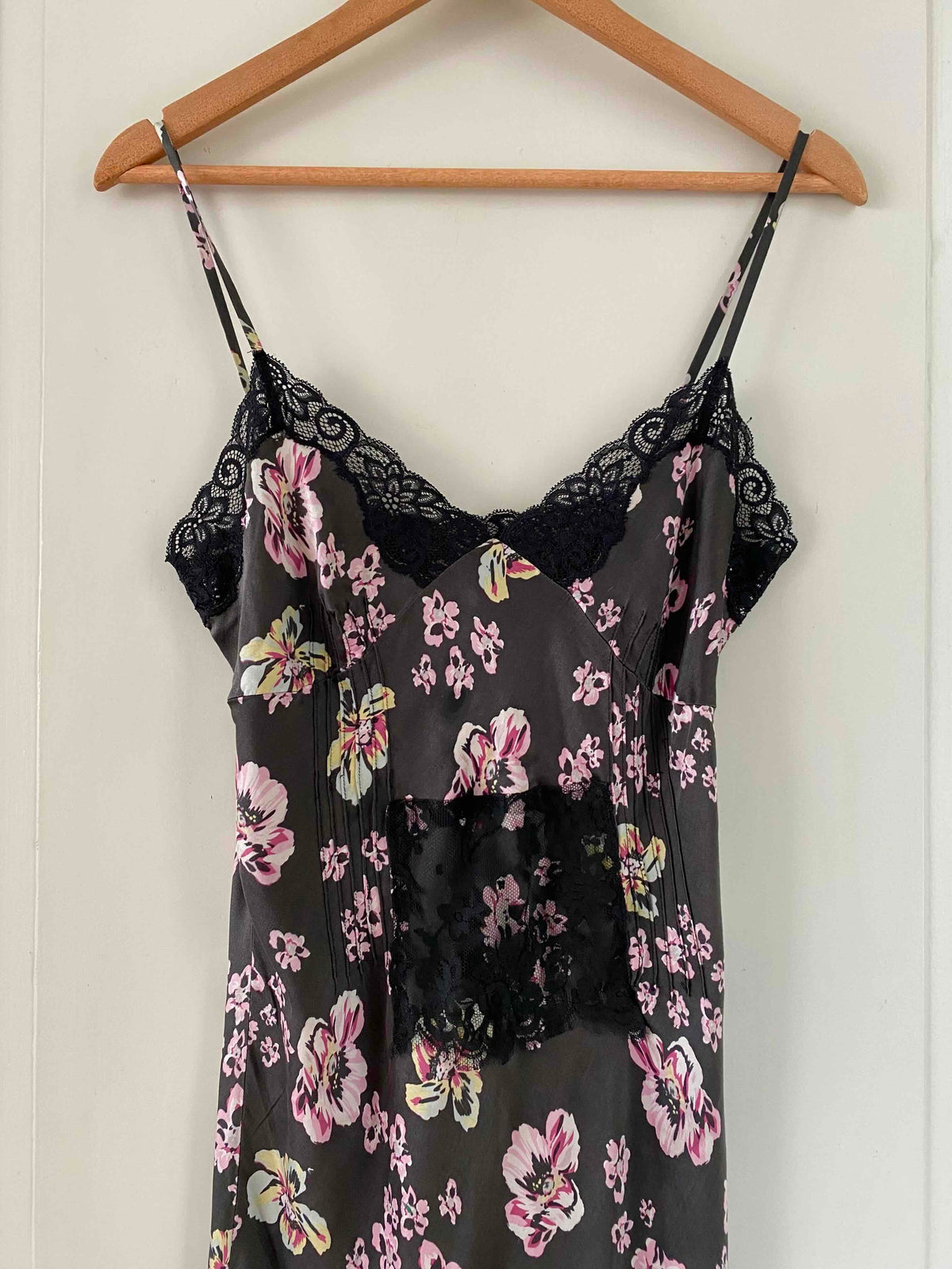 Robe nuisette en soie satin lavée noire imprimée fleurs roses, jaunes et bleu ciel, plis nervurés, plastron, bordures encolure et bas fendu en dentelle noire, bretelles spaghettis réglables, Alain Manoukian y2k, taille 36 portée ici sur un mannequin T36, aisselles 43cm.