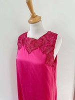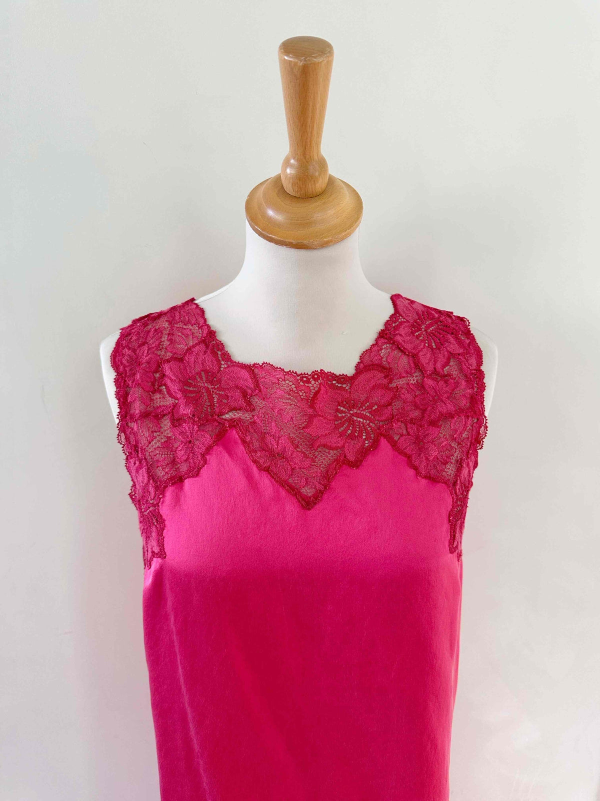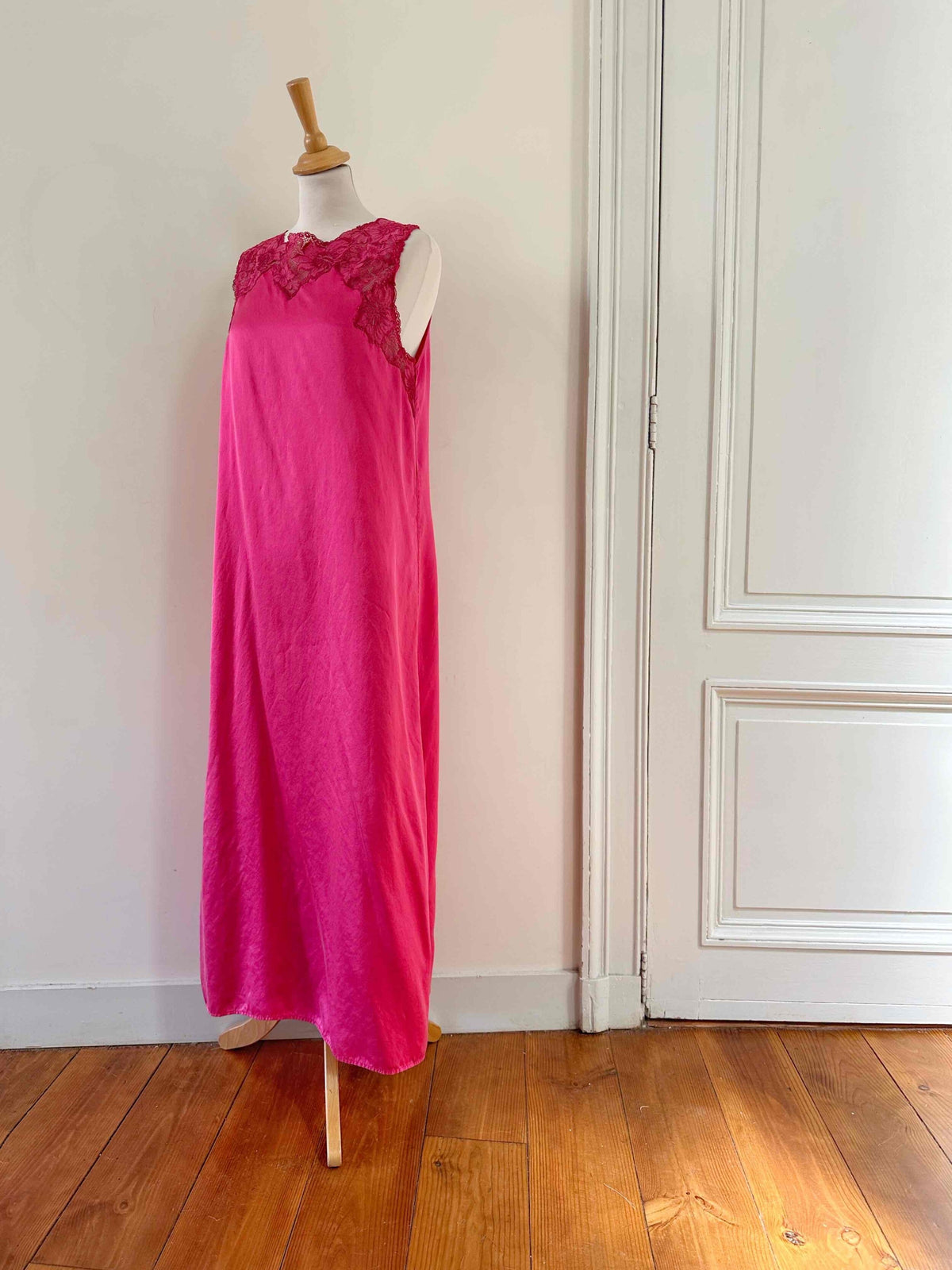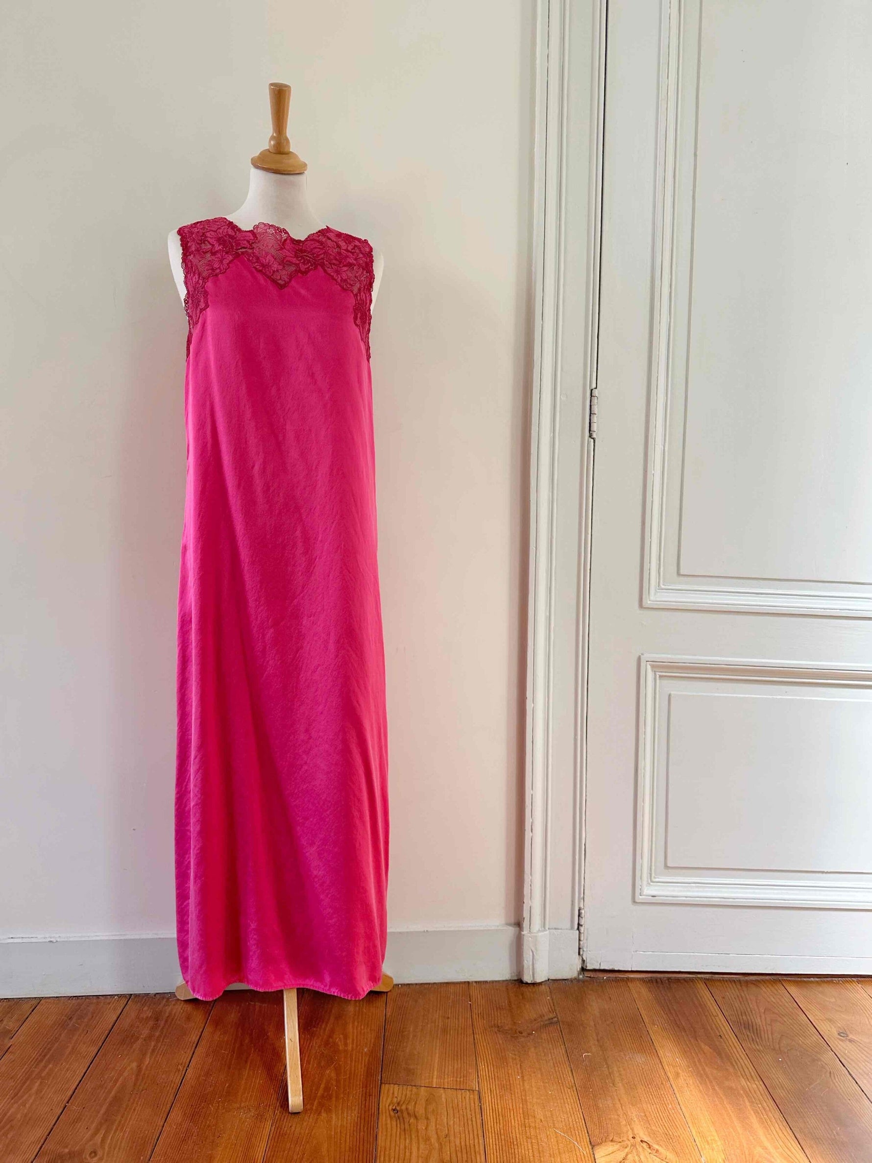 Prix unitaire parRobe nuisette en soie satin rouge framboise, encolure ajourée de dentelle, forme vestale droite, et taillée en biais, fente au dos, fabriquée en Italie, groupe La Perla, convient aux tailles 36 et 38 portée ici sur un mannequin T36, aisselles 44cm.