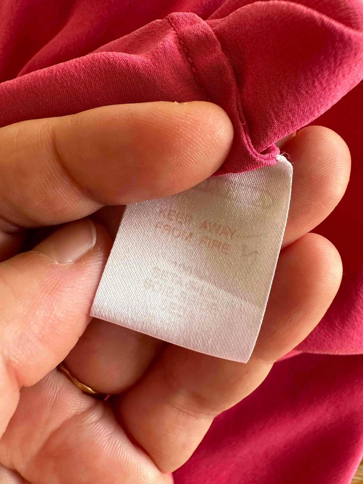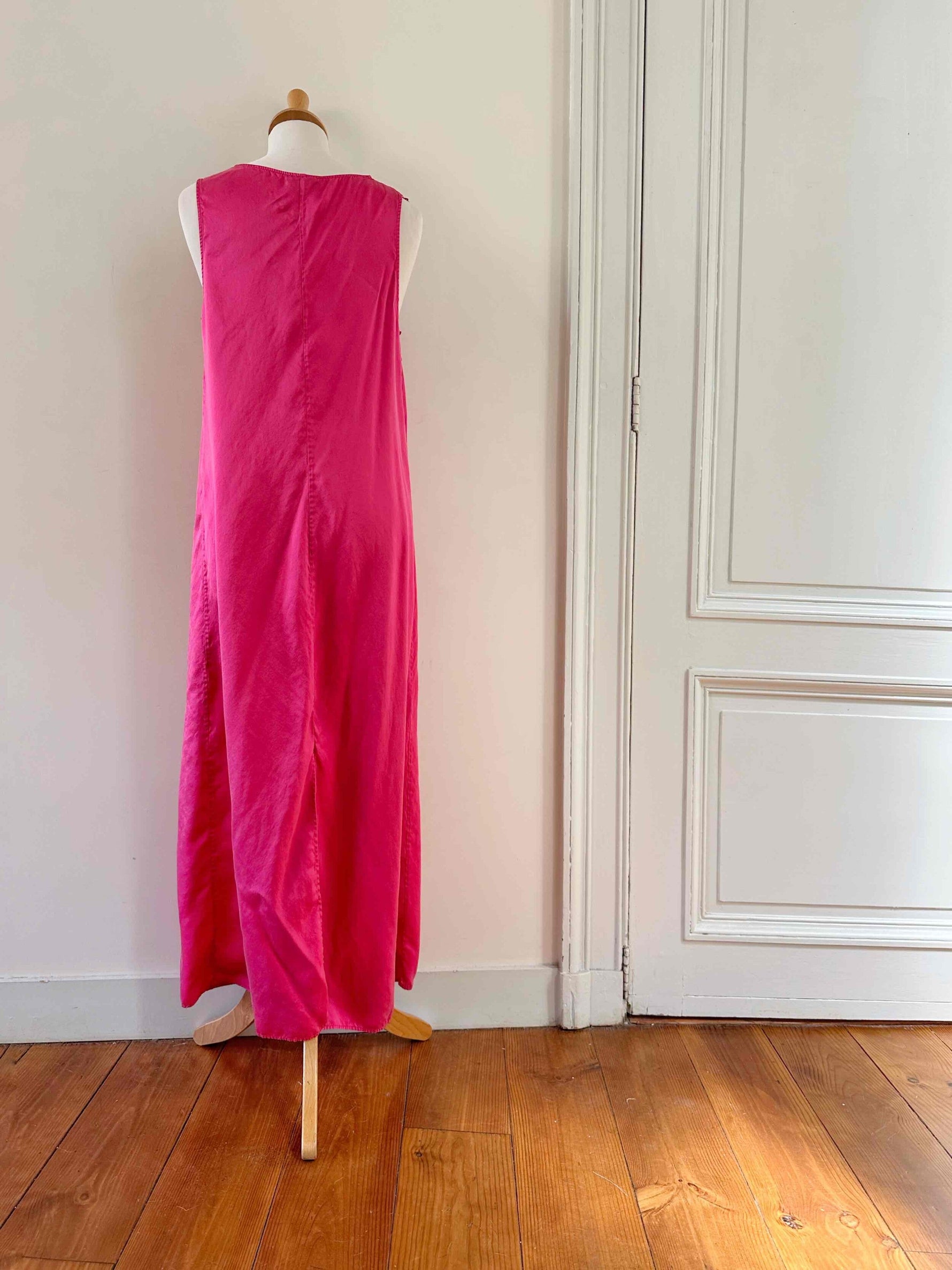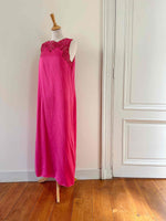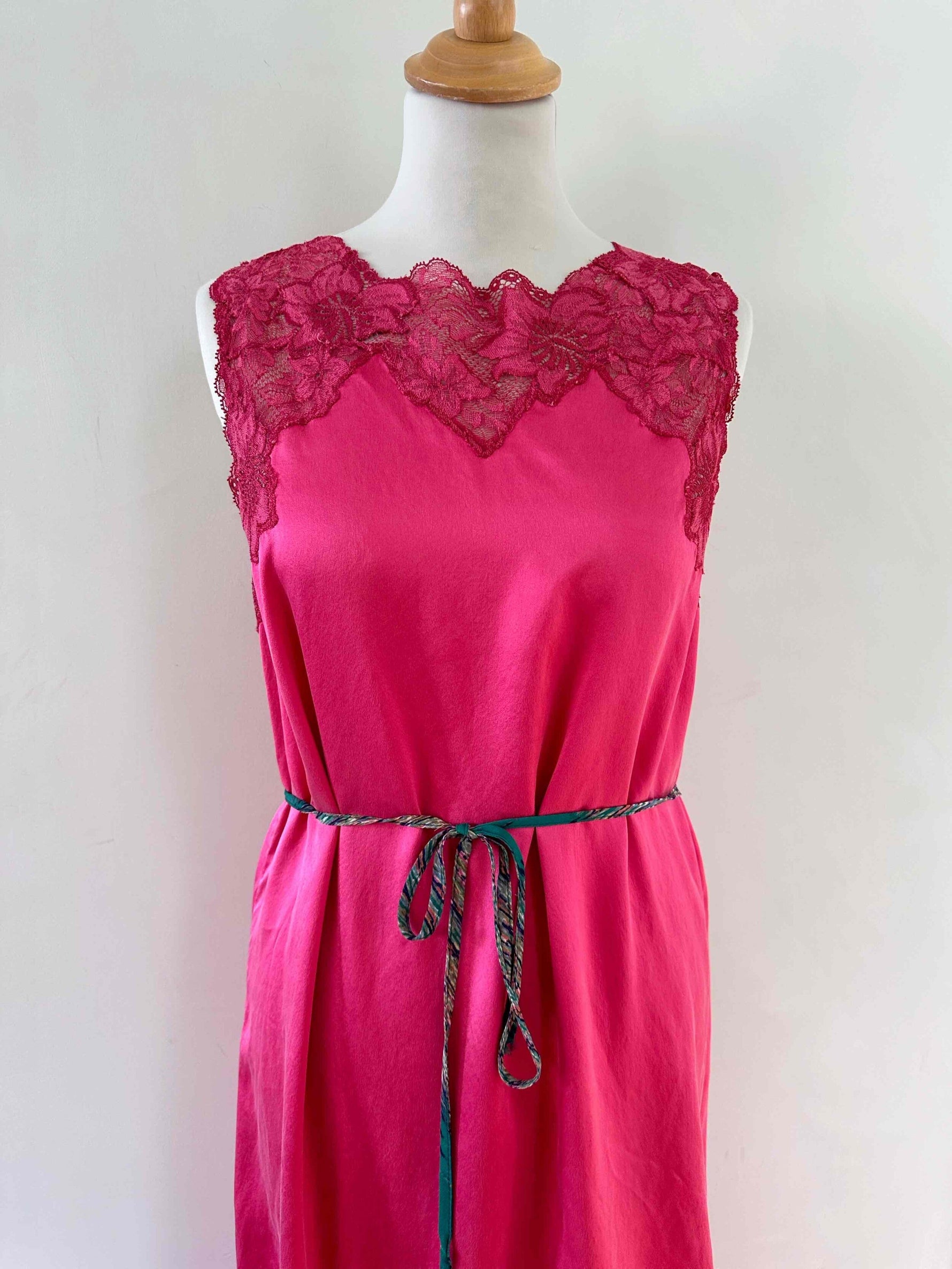 Prix unitaire parRobe nuisette en soie satin rouge framboise, encolure ajourée de dentelle, forme vestale droite, et taillée en biais, fente au dos, fabriquée en Italie, groupe La Perla, convient aux tailles 36 et 38 portée ici sur un mannequin T36, aisselles 44cm.