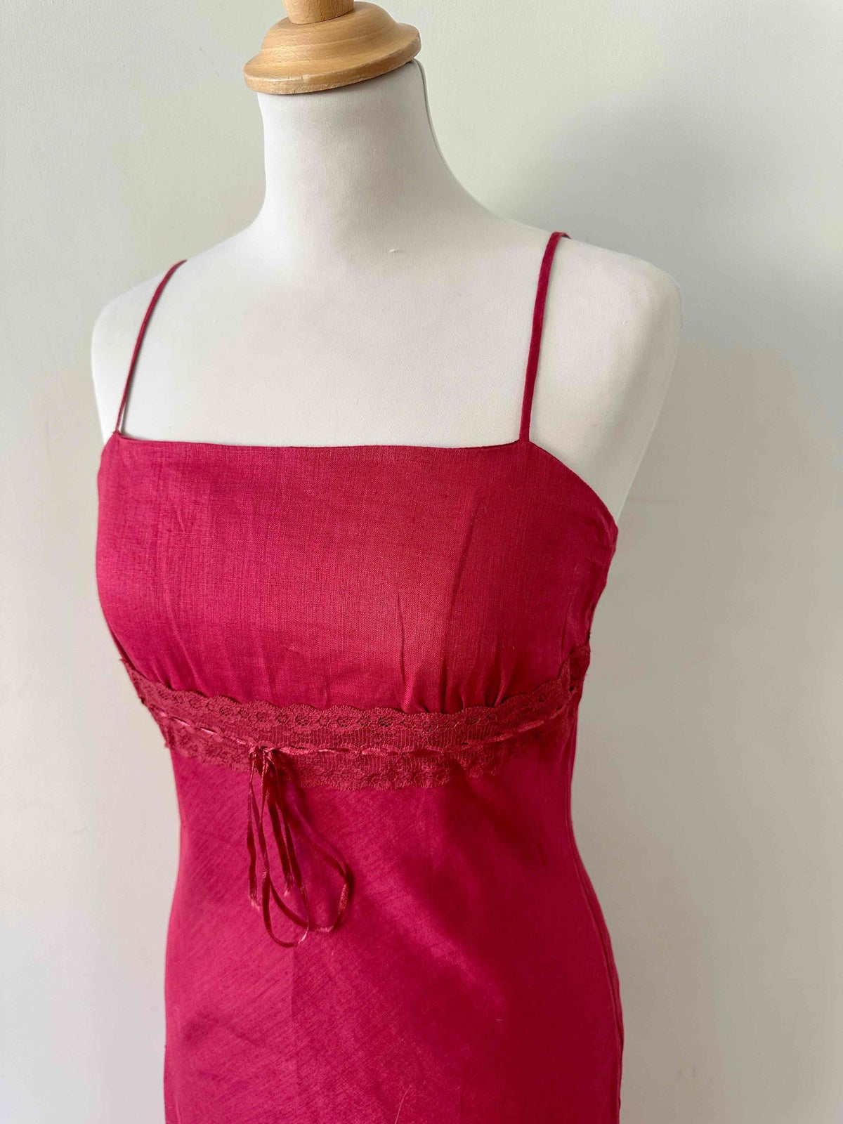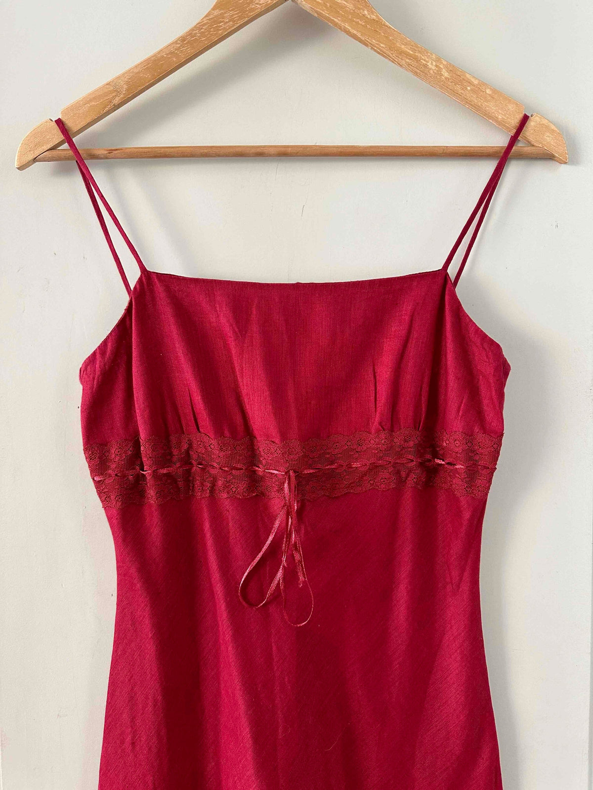 Prix unitaire parRobe nuisette en lin rouge cerise, bretelles spaghettis, poitrine brodé de dentelle, à froncer et à nouer par un ruban en satin, taillée en biais, fabriquée en France, taille 36 portée ici sur un mannequin T36, aisselles 43cm.