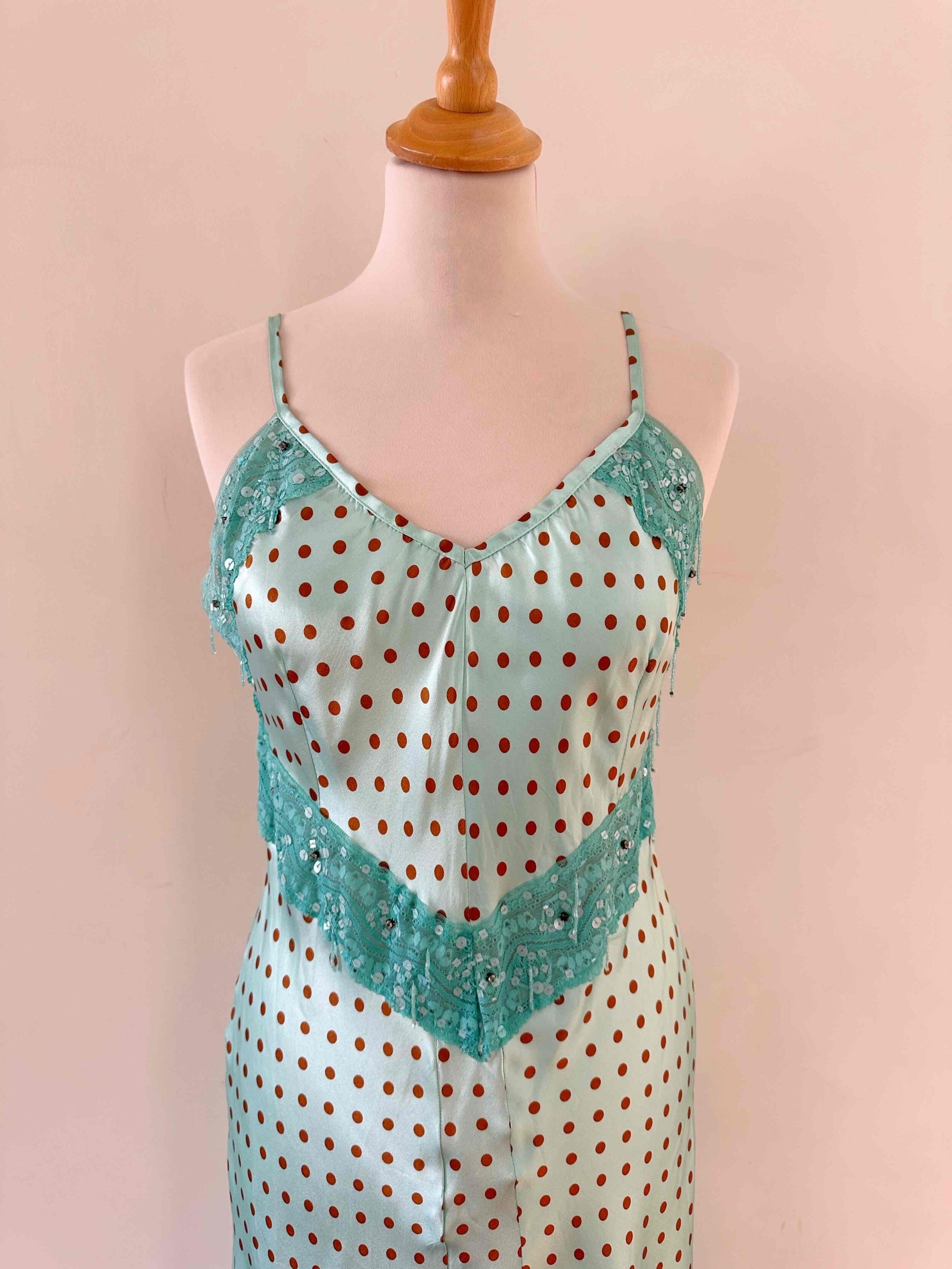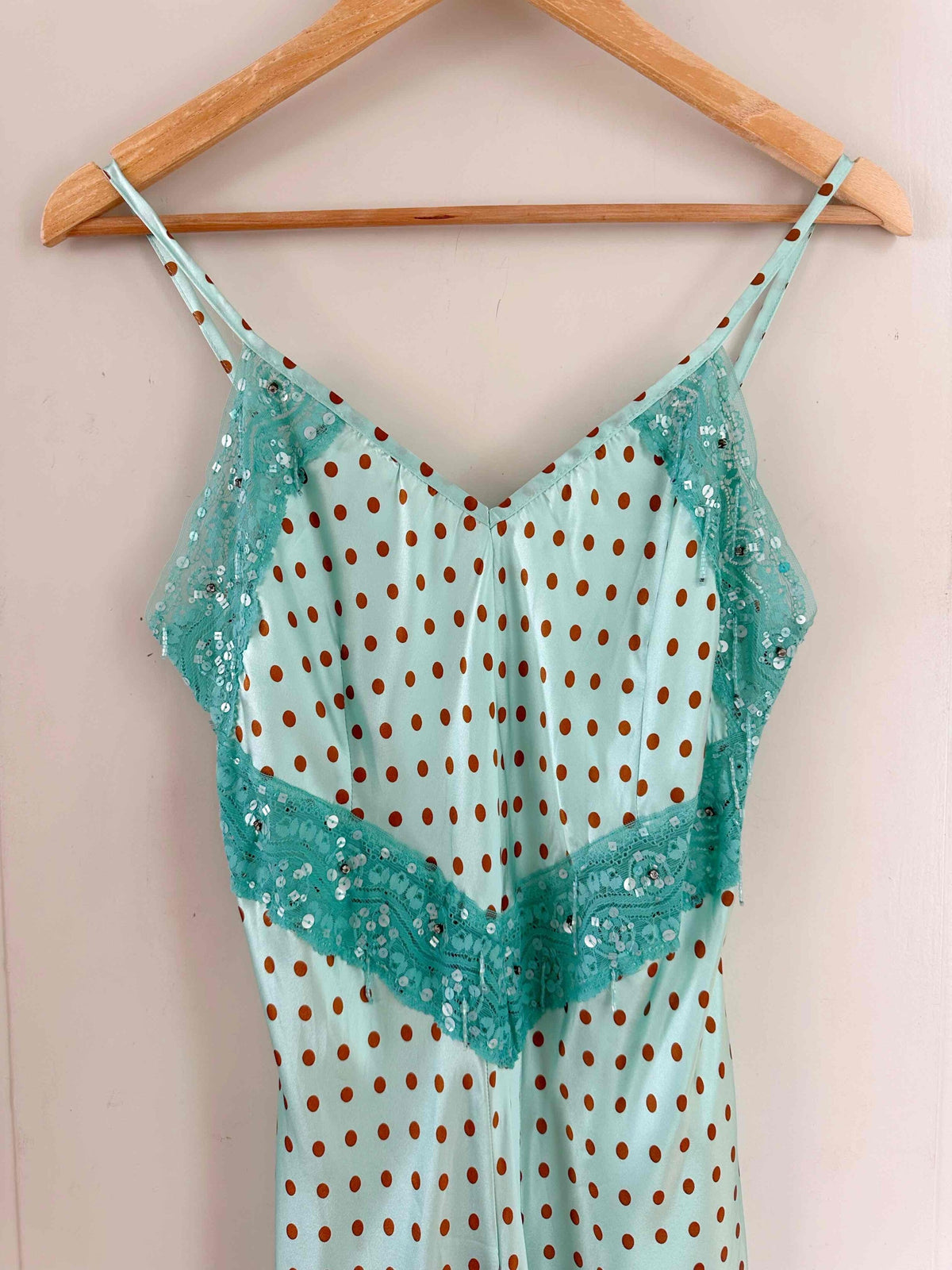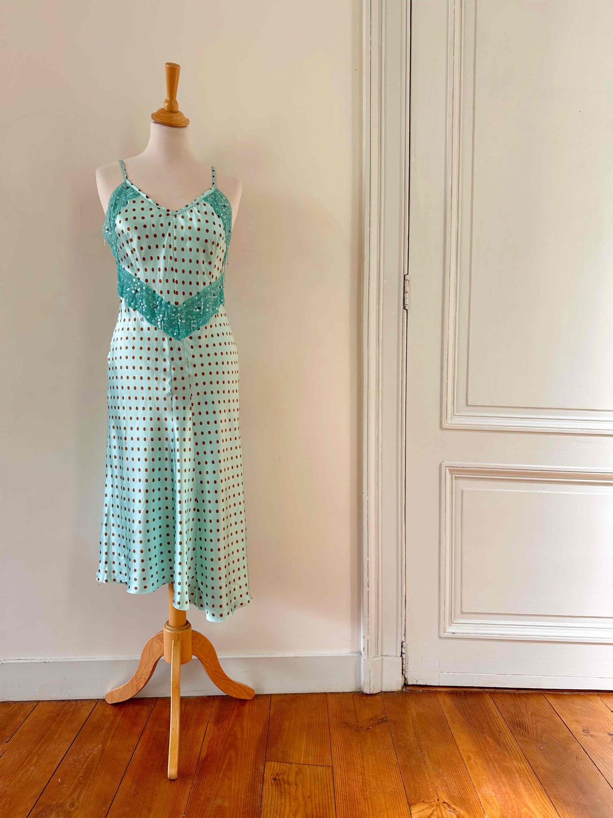 Robe nuisette en satin de soie bleu ciel turquoise imprimée pois marrons, encolure et taille brodés de dentelles beiges, sequins et perles en pampilles, bretelles spaghettis, fabriquée en Italie, taille 36 portée ici sur un mannequin T36, 43cm.