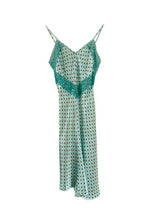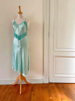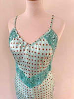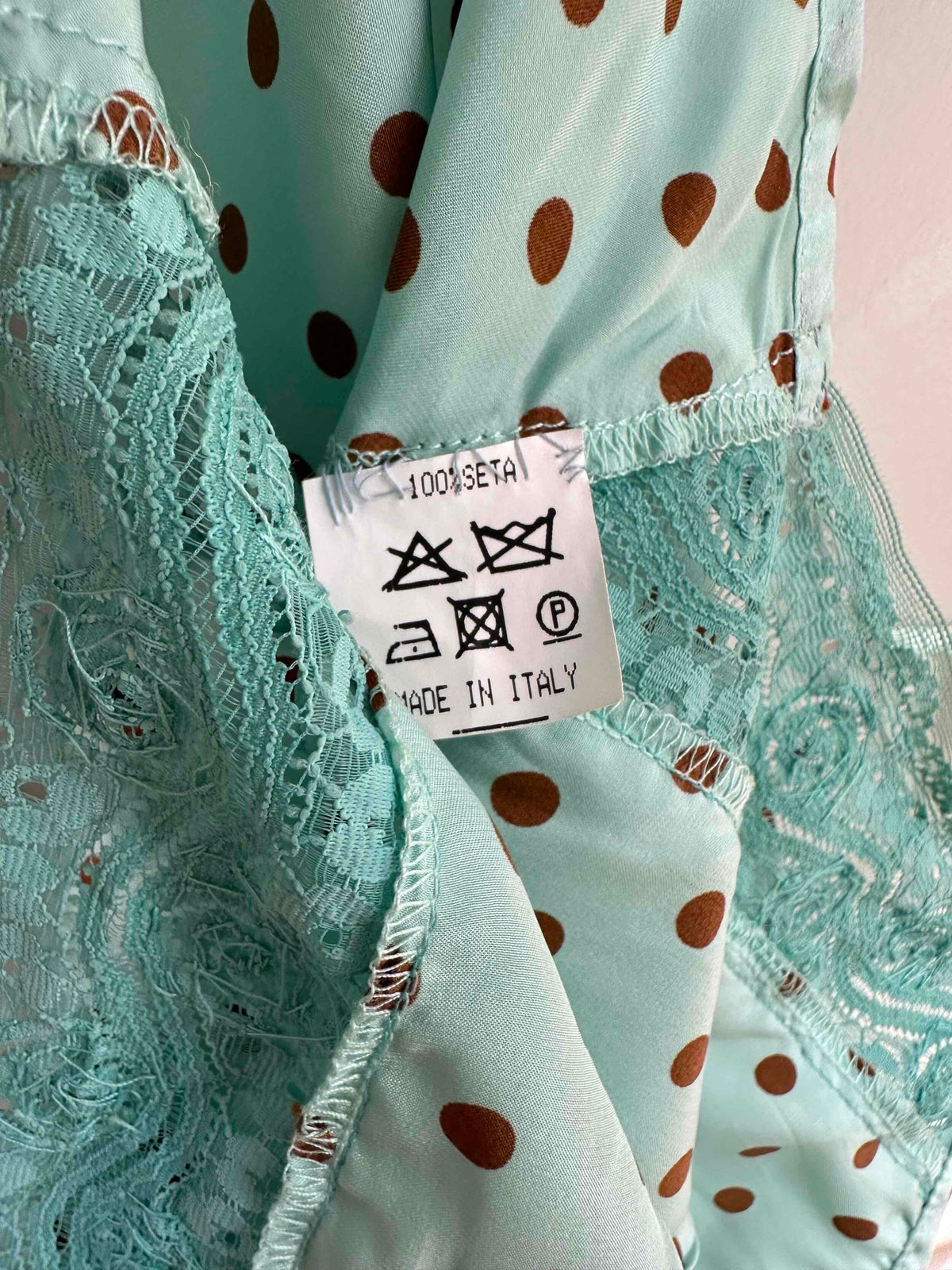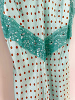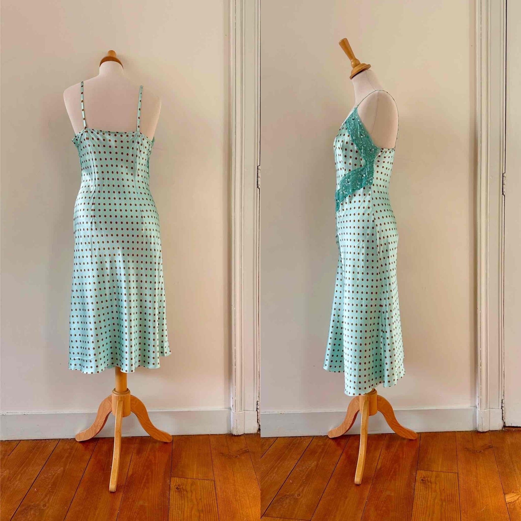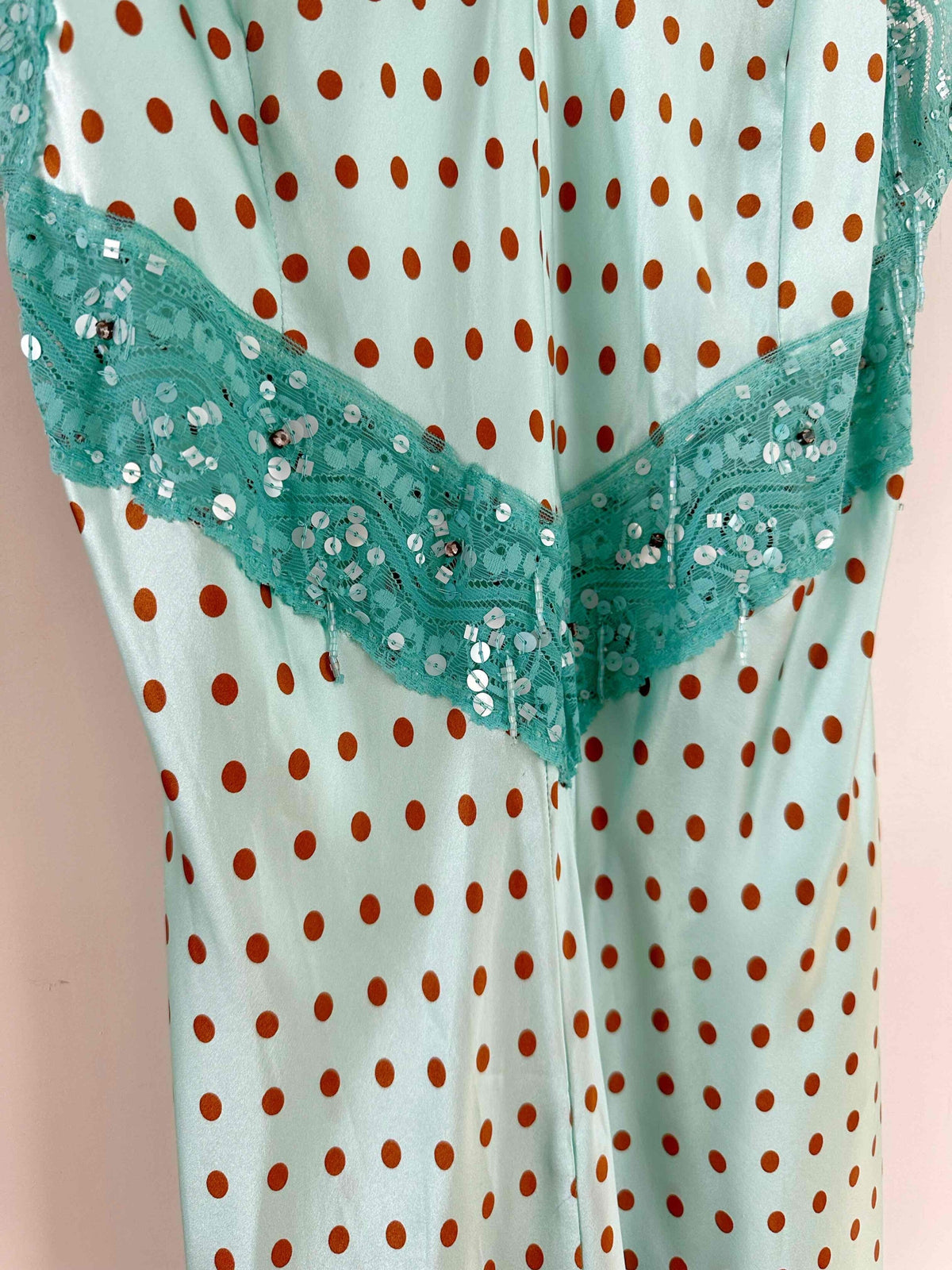 Robe nuisette en satin de soie bleu ciel turquoise imprimée pois marrons, encolure et taille brodés de dentelles beiges, sequins et perles en pampilles, bretelles spaghettis, fabriquée en Italie, taille 36 portée ici sur un mannequin T36, 43cm.