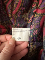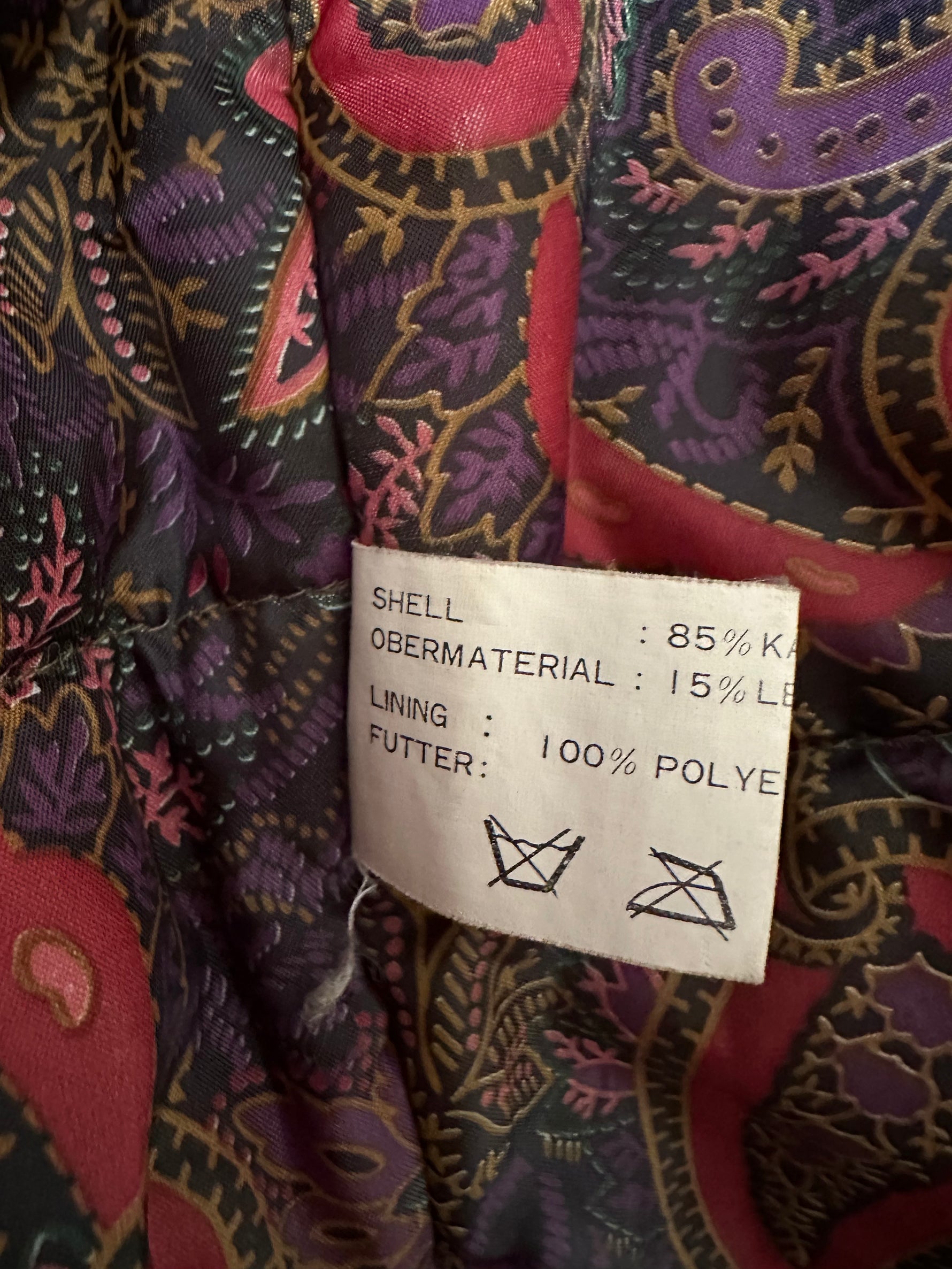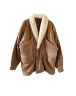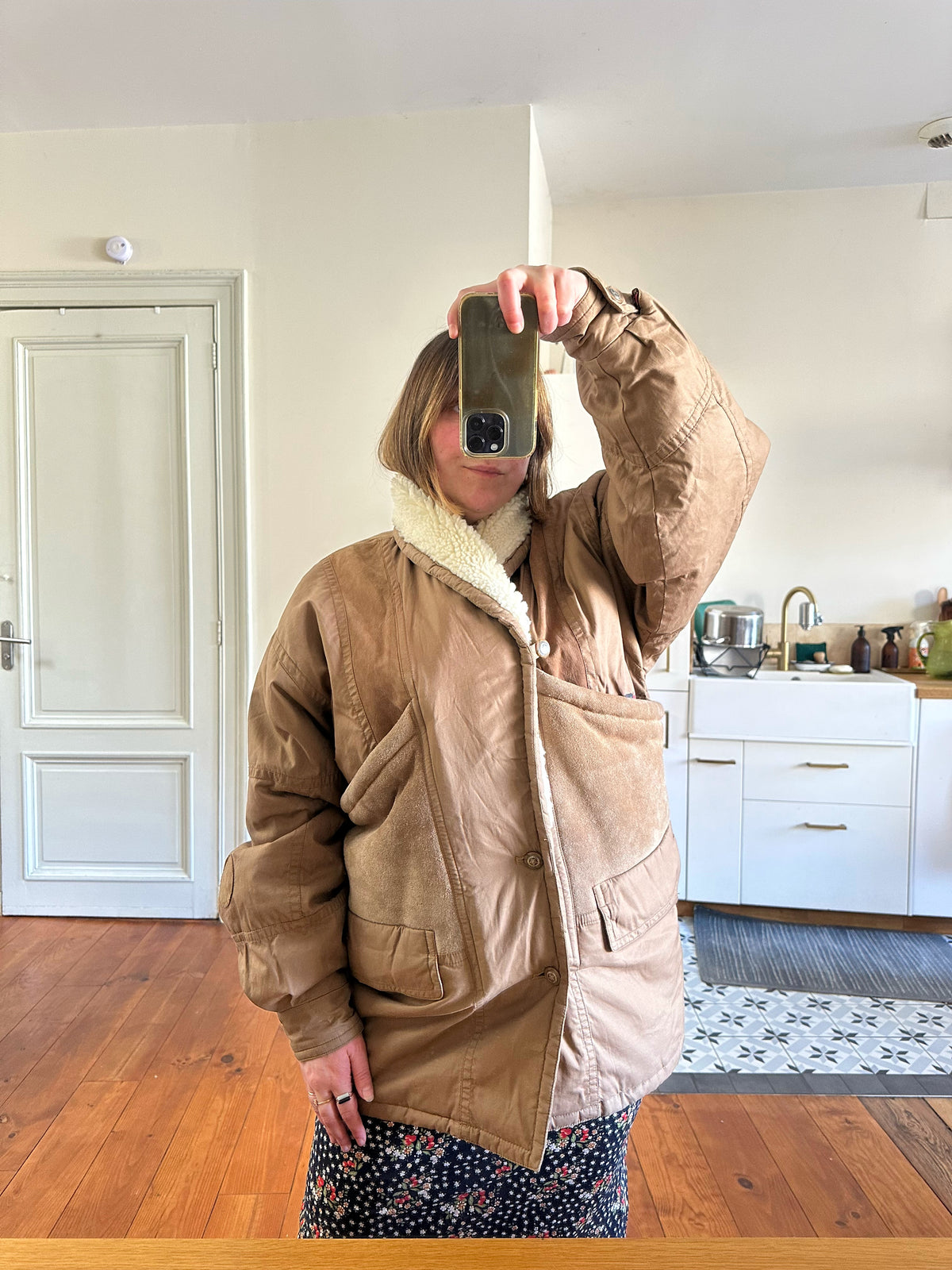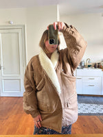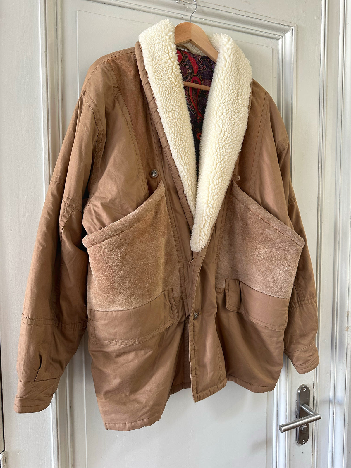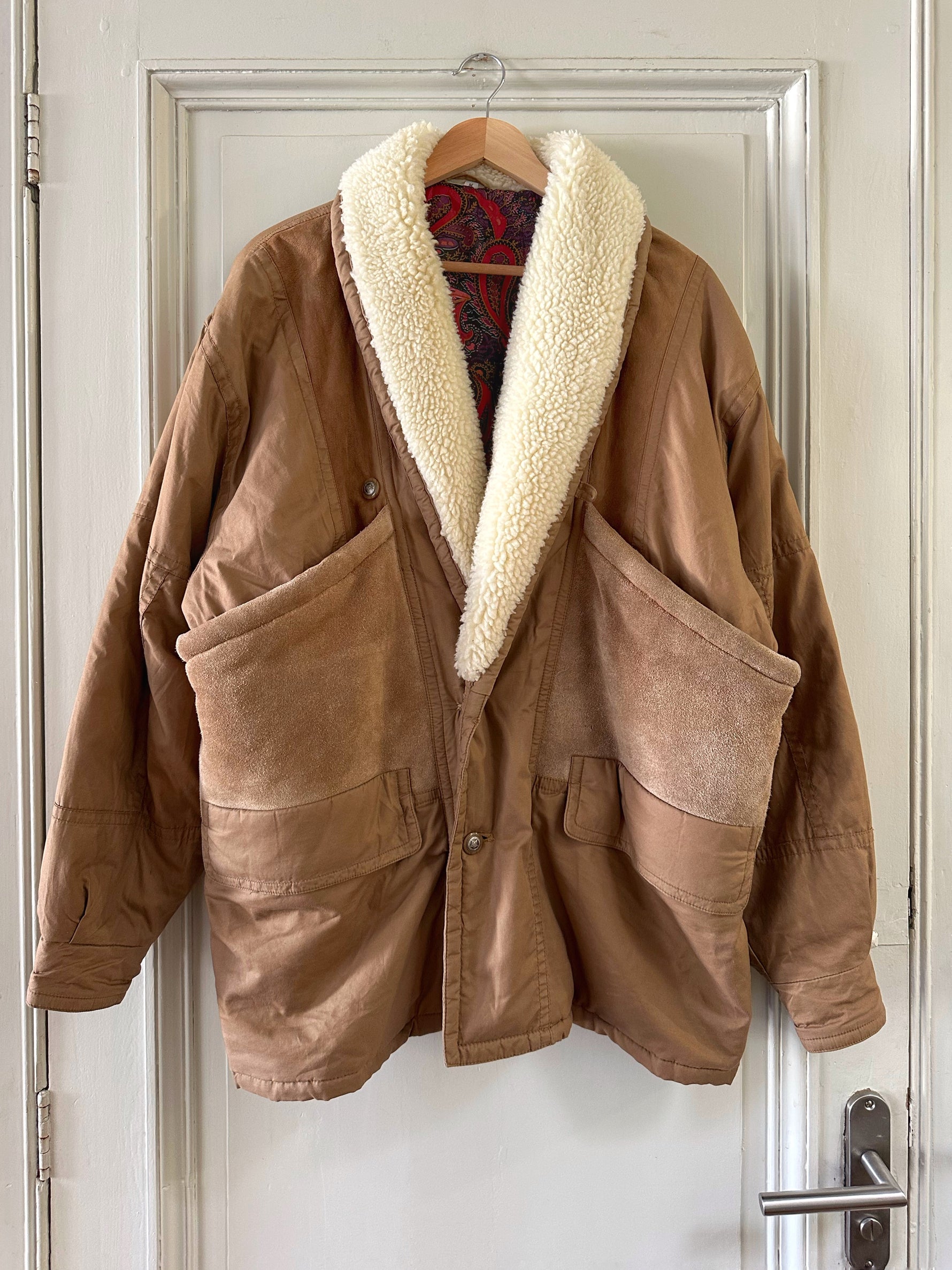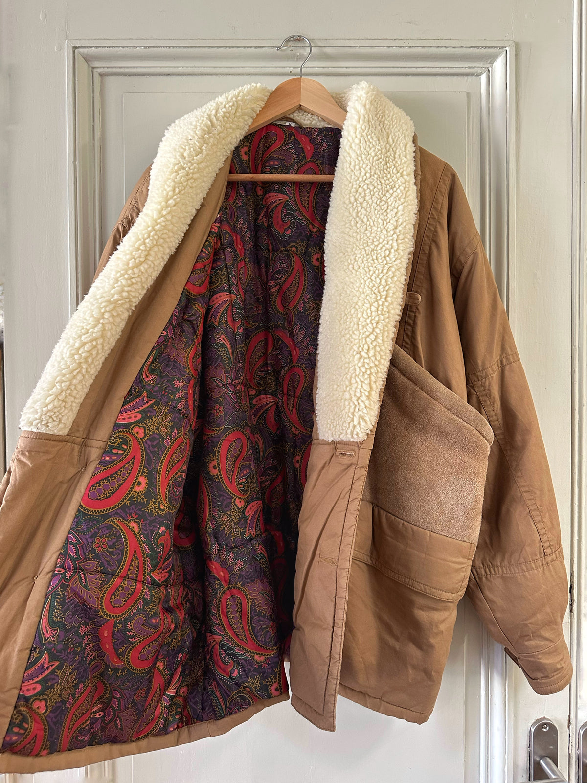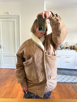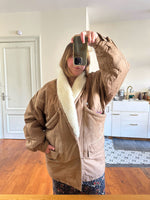 Parka peau lainée, en toile de coton camel, empiècements en cuir, daim et mouton retourné. Doublure imprimé paisley. Col châle sherpa. Années 80s. Taille 40 porté ici sur une personne T40. Aisselles 55cm Longueur 80cm