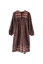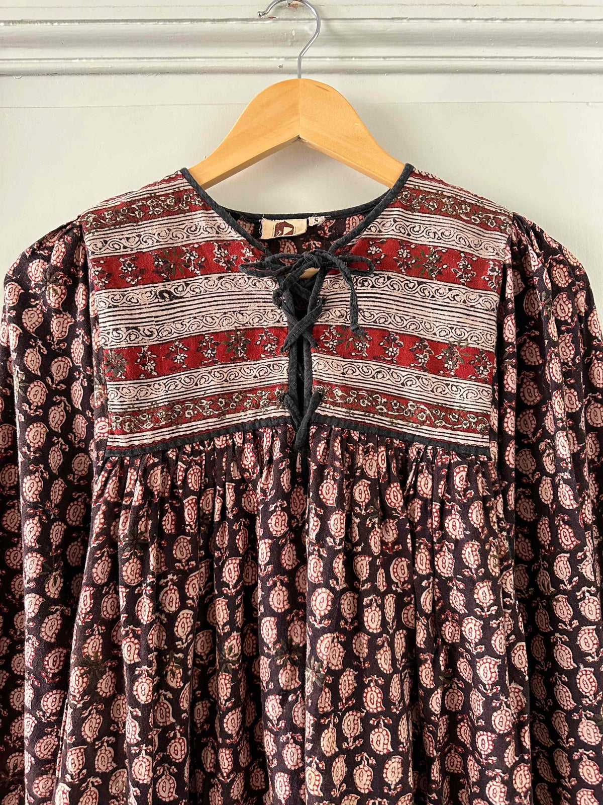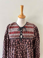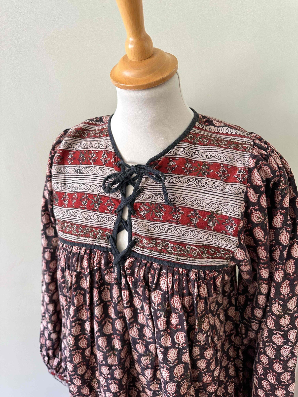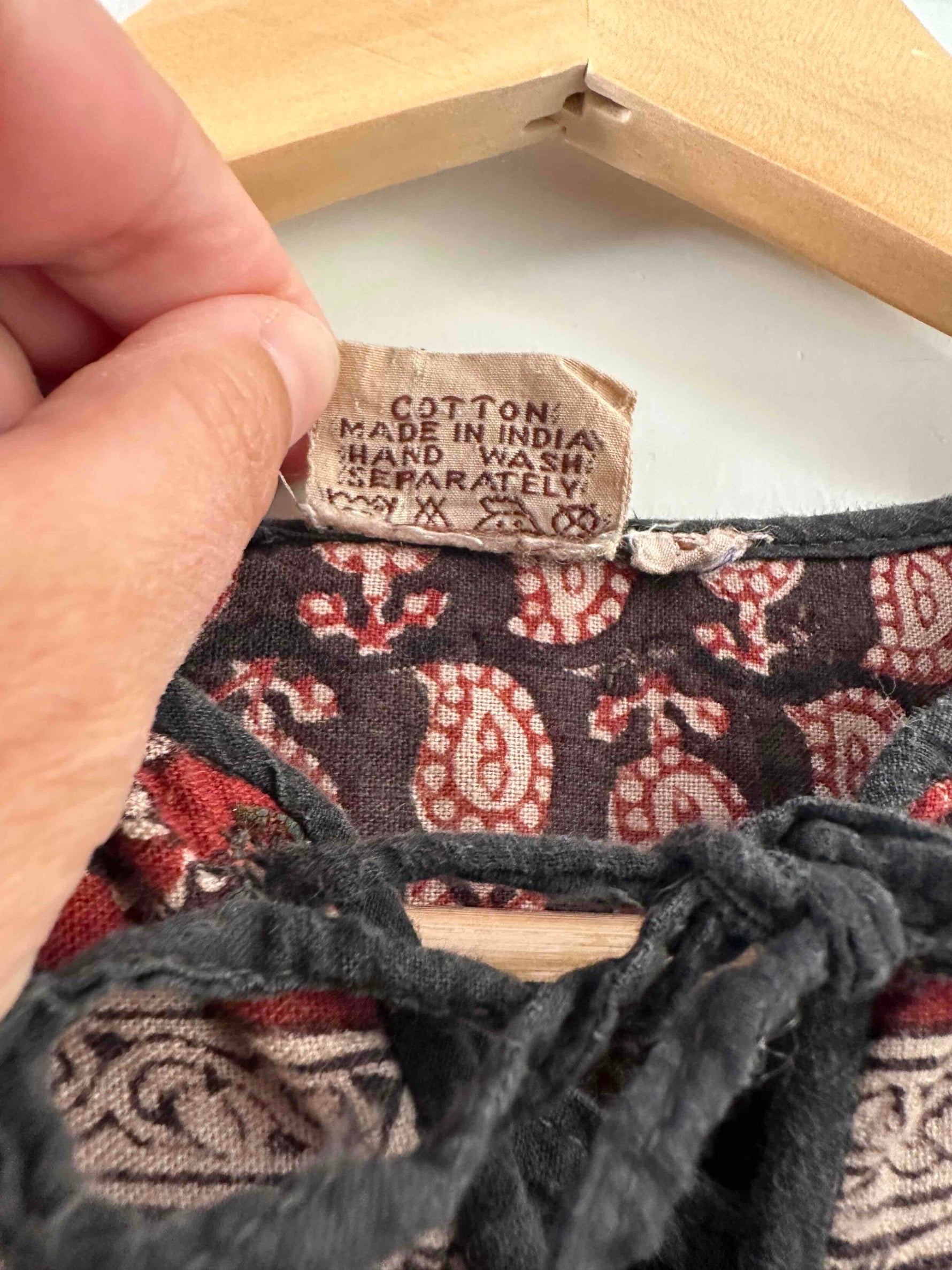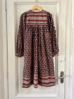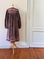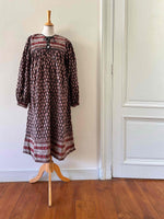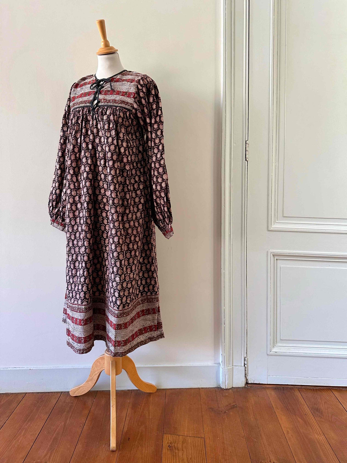 Prix unitaire parRobe paisley 70s, en 100% coton motifs paisley indiens dans les tons violet prune, grenats, chocolat et beiges, encolure a lacets, manches ballons, fabriquée en Indes dans les années 70s, taille 36 portée ici sur un mannequin T36, aisselles 45cm.