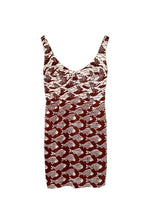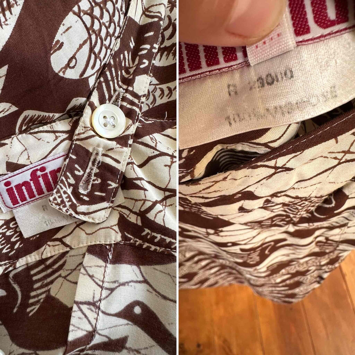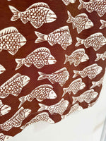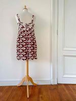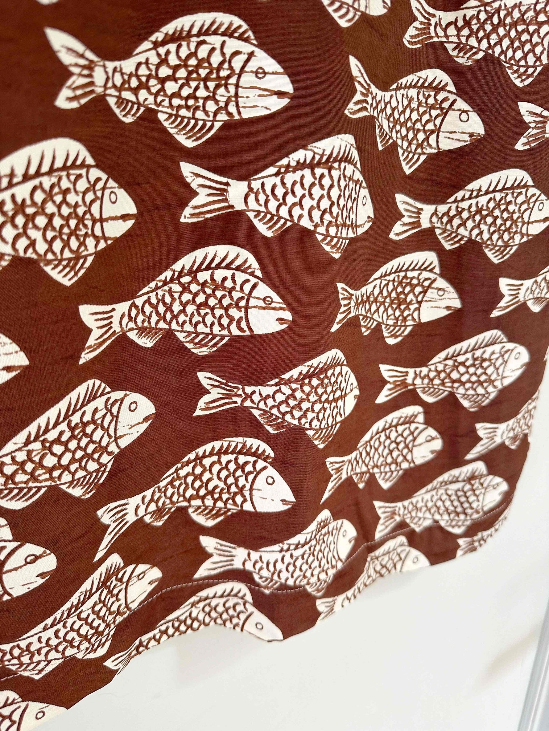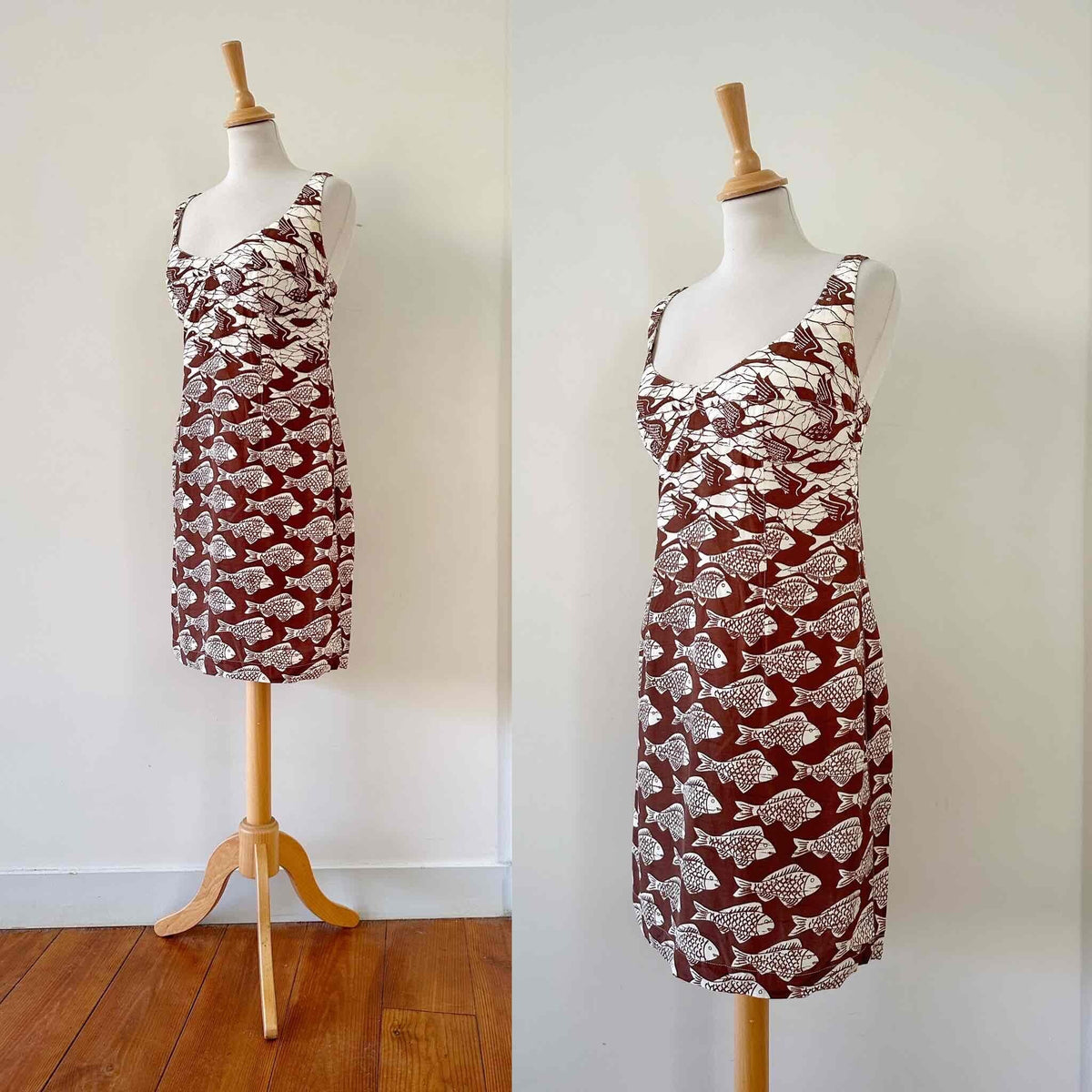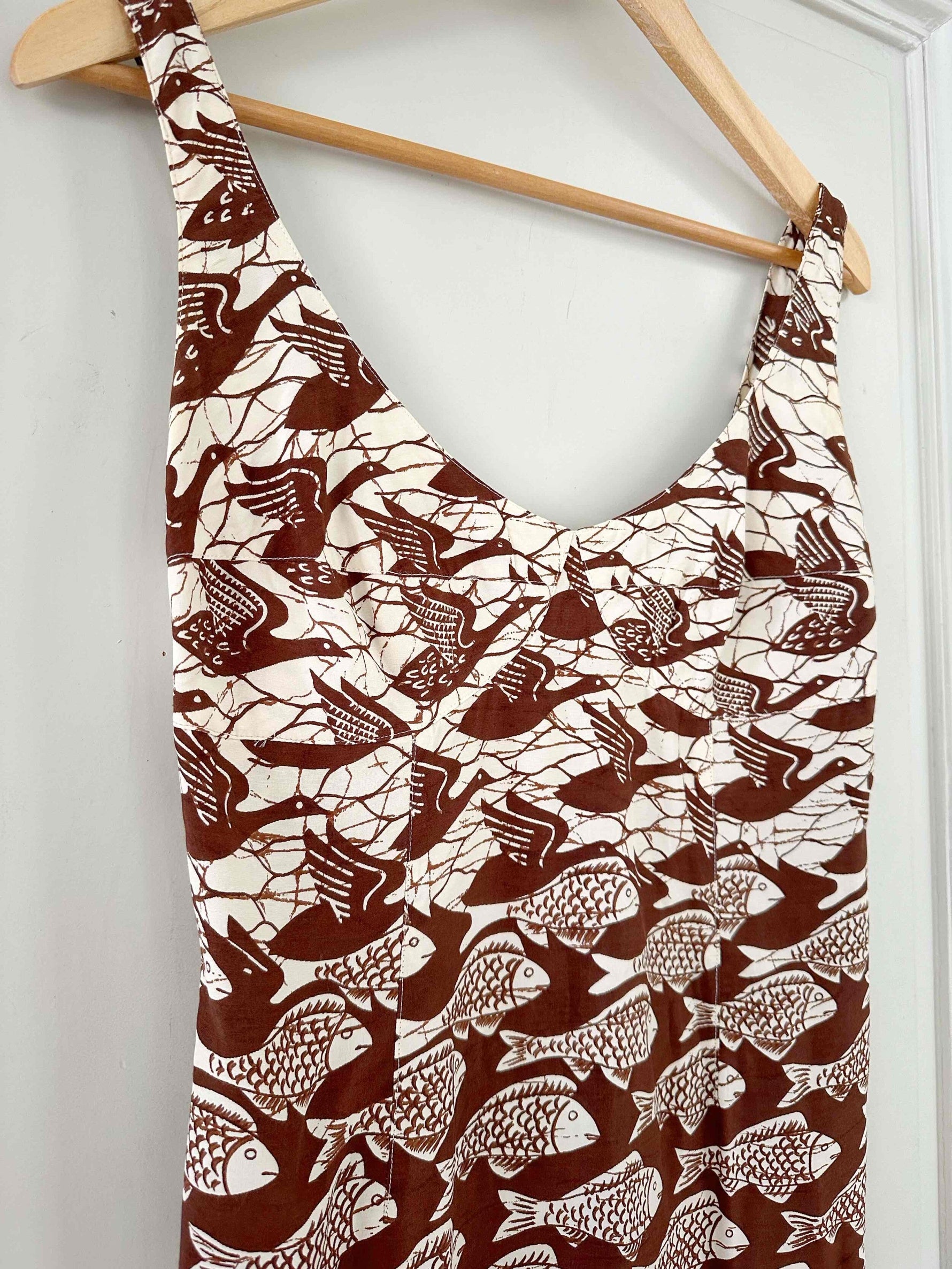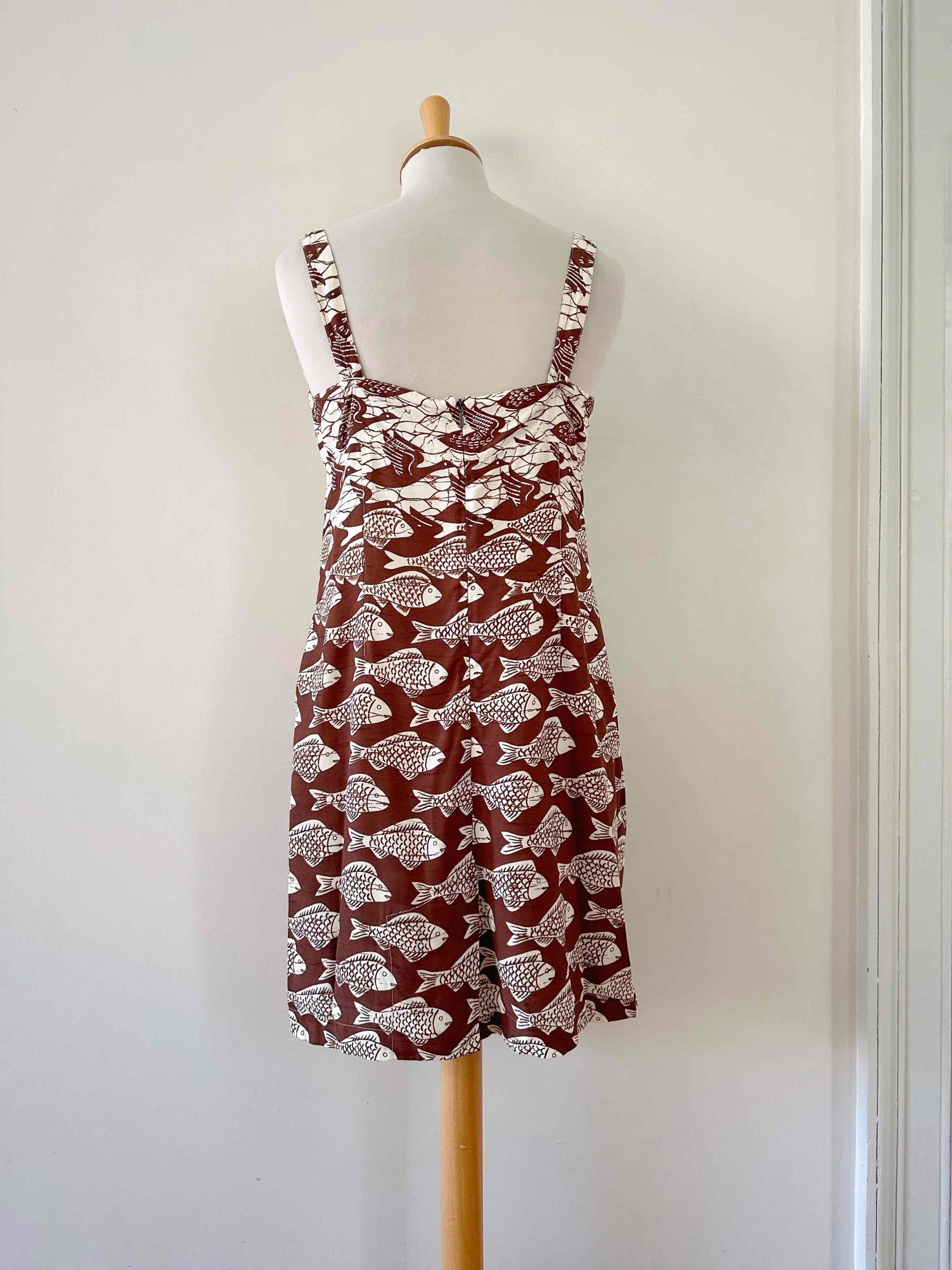 Robe motifs poissons, en viscose marron imprimée poissons dégradé se transformant en oiseaux, motifs esprit wax, bretelles réglables par des boutons au dos, découpes sous poitrines, fabriquée en France, taille 36, portée ici sur un mannequin T36.