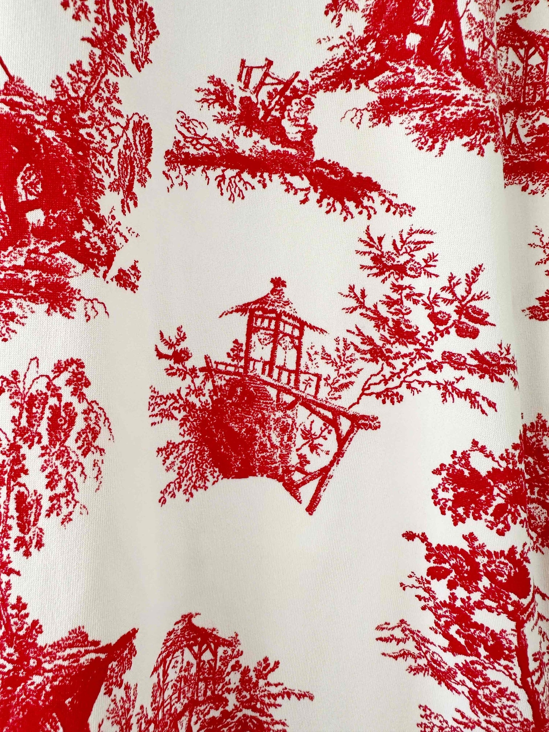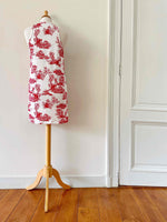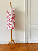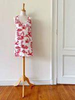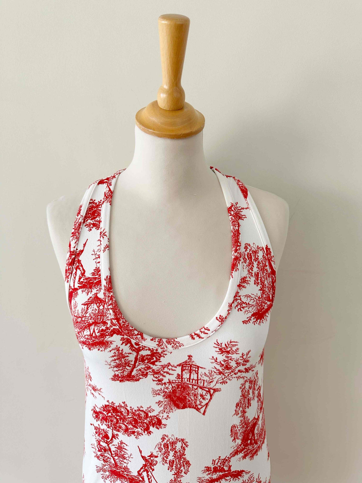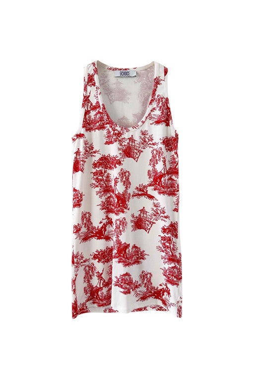 Prix unitaire parRobe mini en toile de Jouy, en maille viscose élasthanne blanche imprimée toile de Jouy rouge, forme robe débardeur, fabriquée en Italie, taille 34 et 36, portée ici sur un mannequin T36.