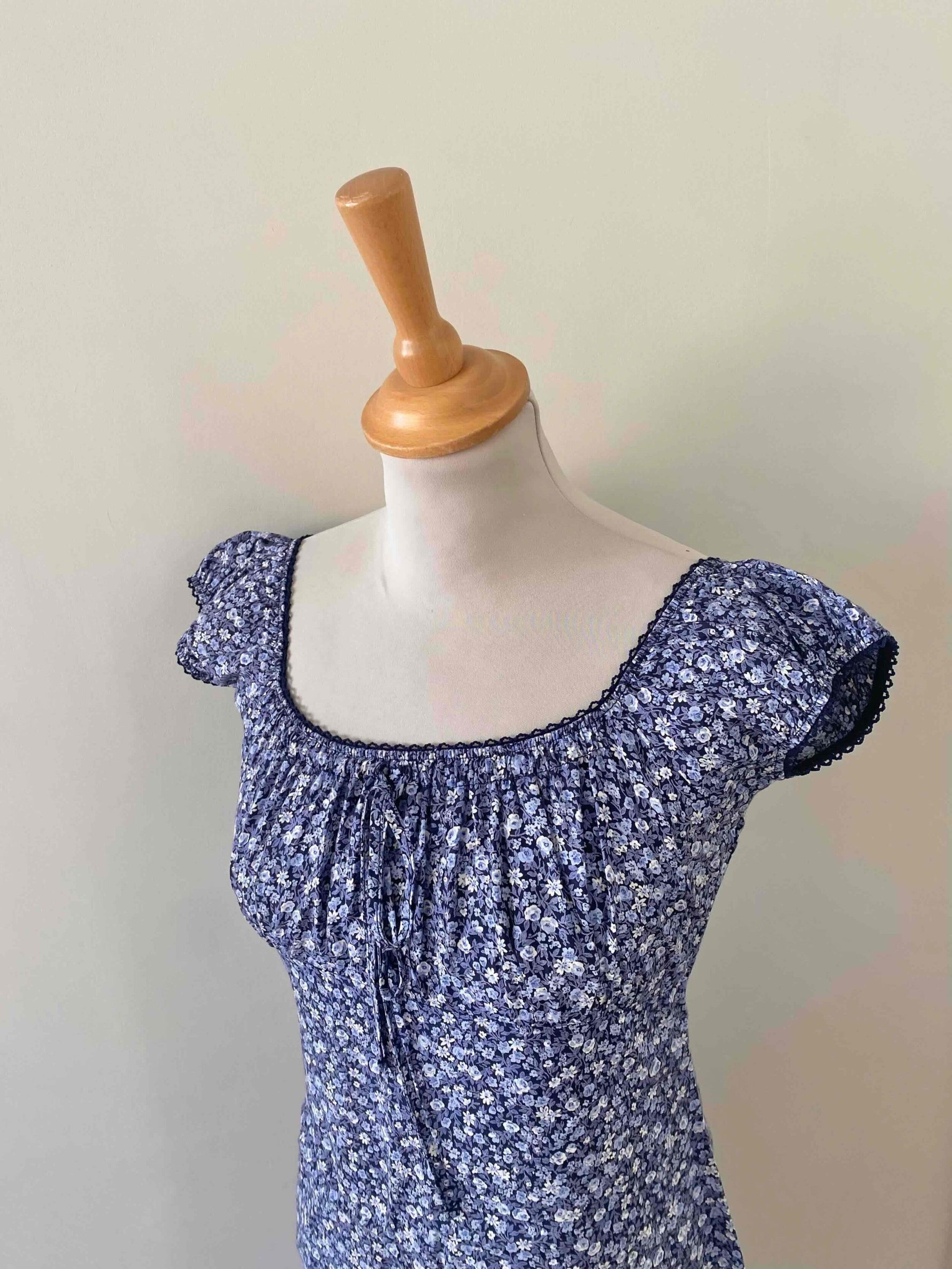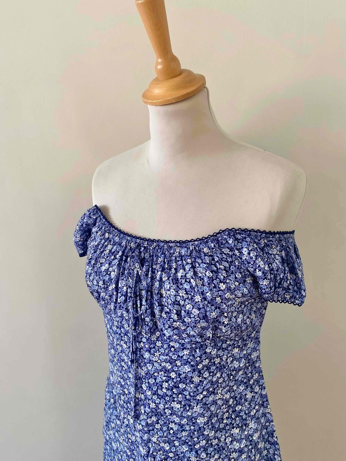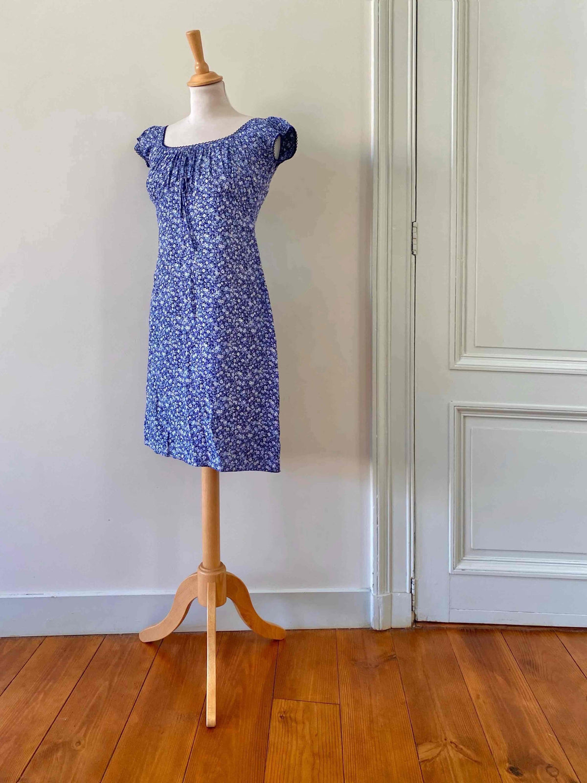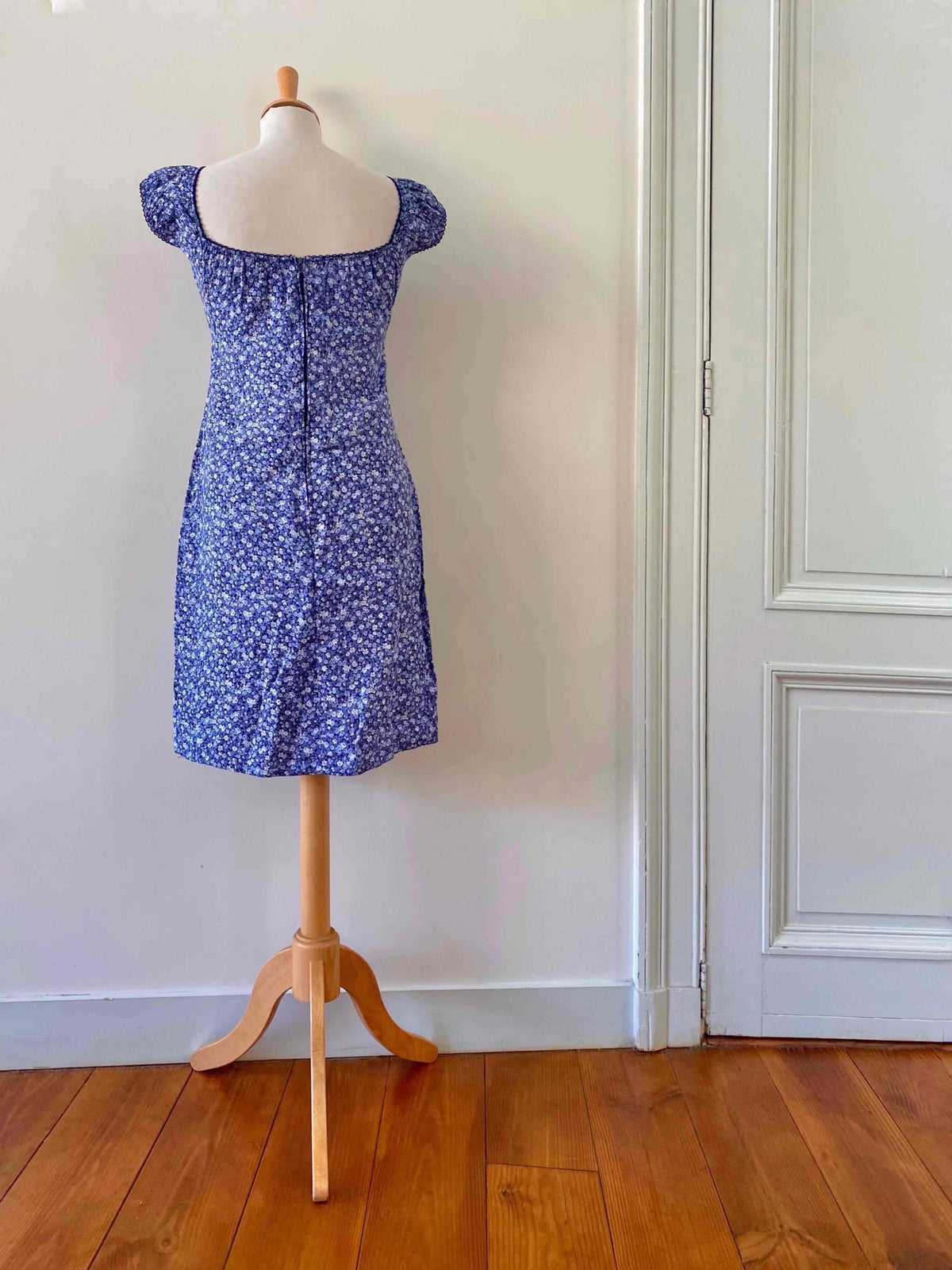 Prix unitaire parMini robe à fleurs en viscose bleue imprimé petites fleurs bleues ciel, marine, blanches, encolure corsage et manches ballons élastiques dentelle à porter open-shoulder, fabriquée en France, taille 36 portée ici sur un mannequin T36, aisselles 43cm