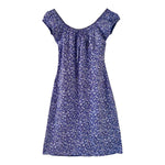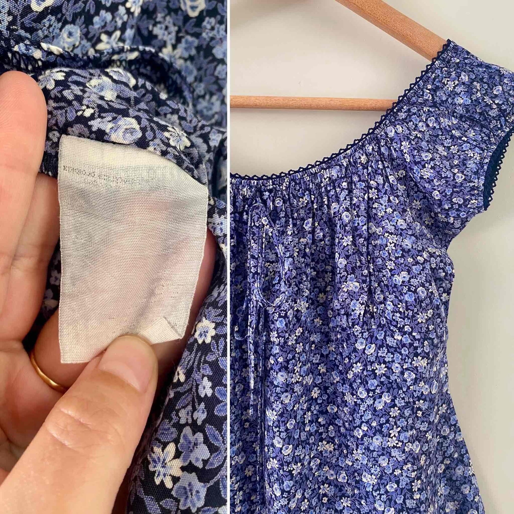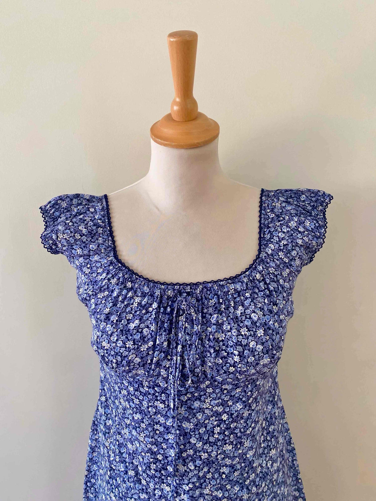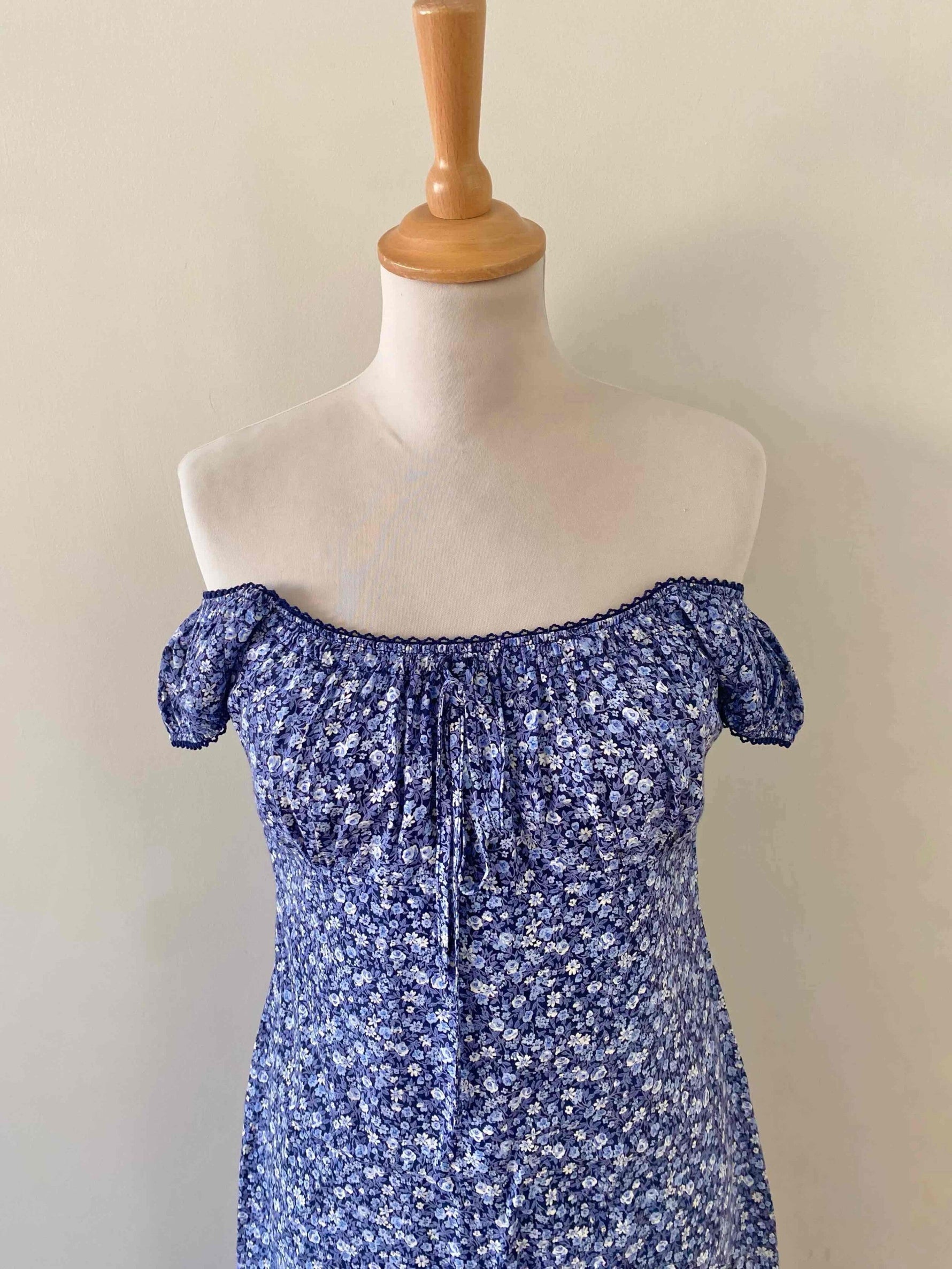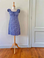 Prix unitaire parMini robe à fleurs en viscose bleue imprimé petites fleurs bleues ciel, marine, blanches, encolure corsage et manches ballons élastiques dentelle à porter open-shoulder, fabriquée en France, taille 36 portée ici sur un mannequin T36, aisselles 43cm