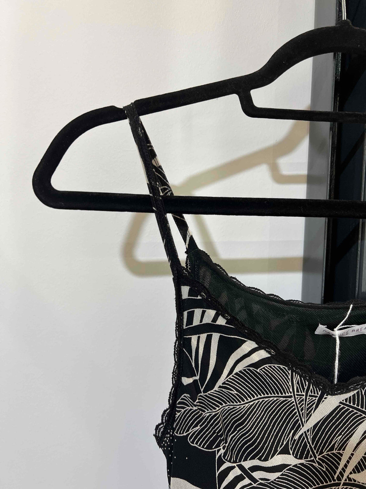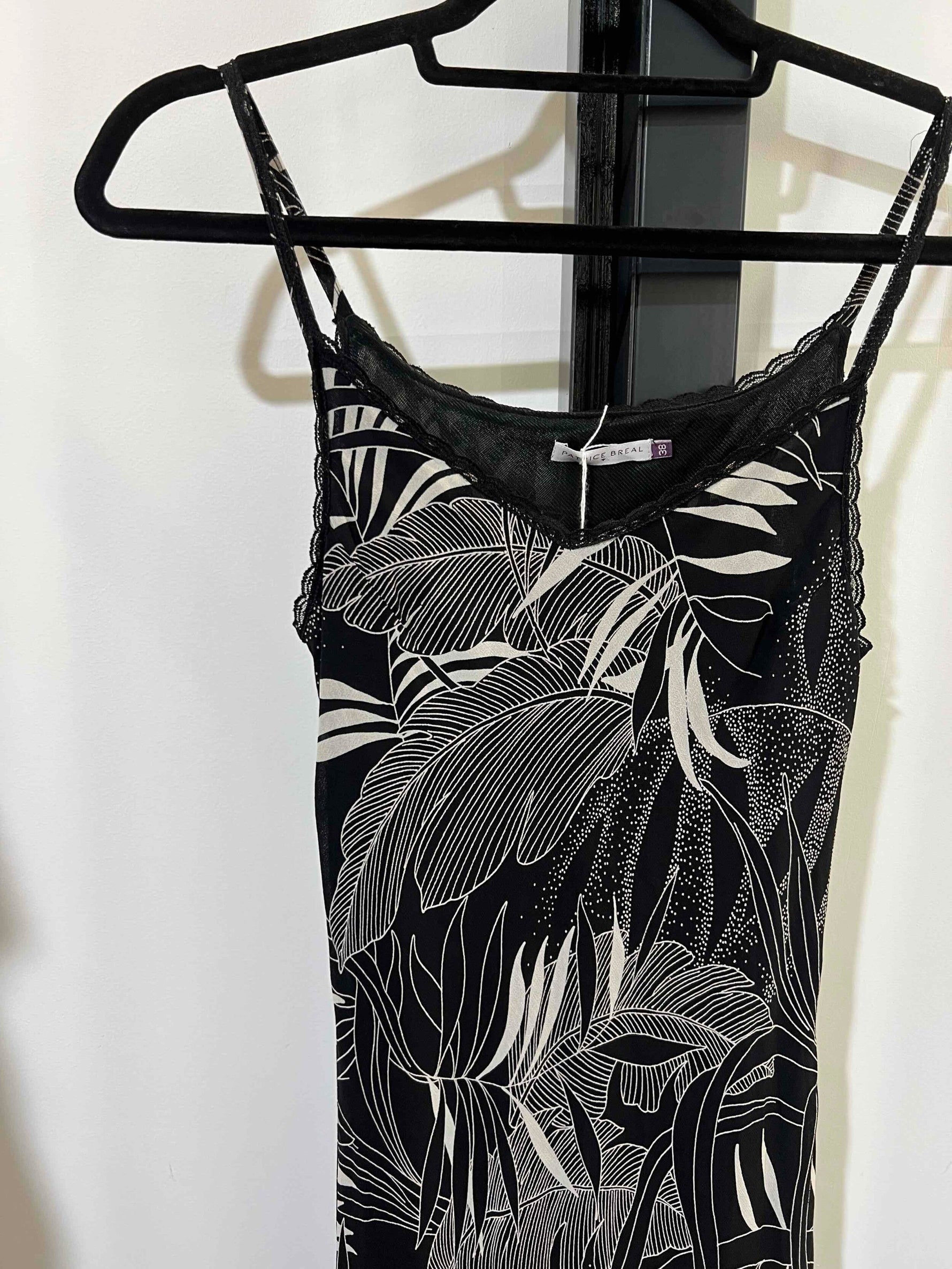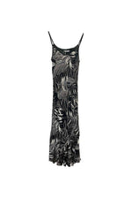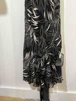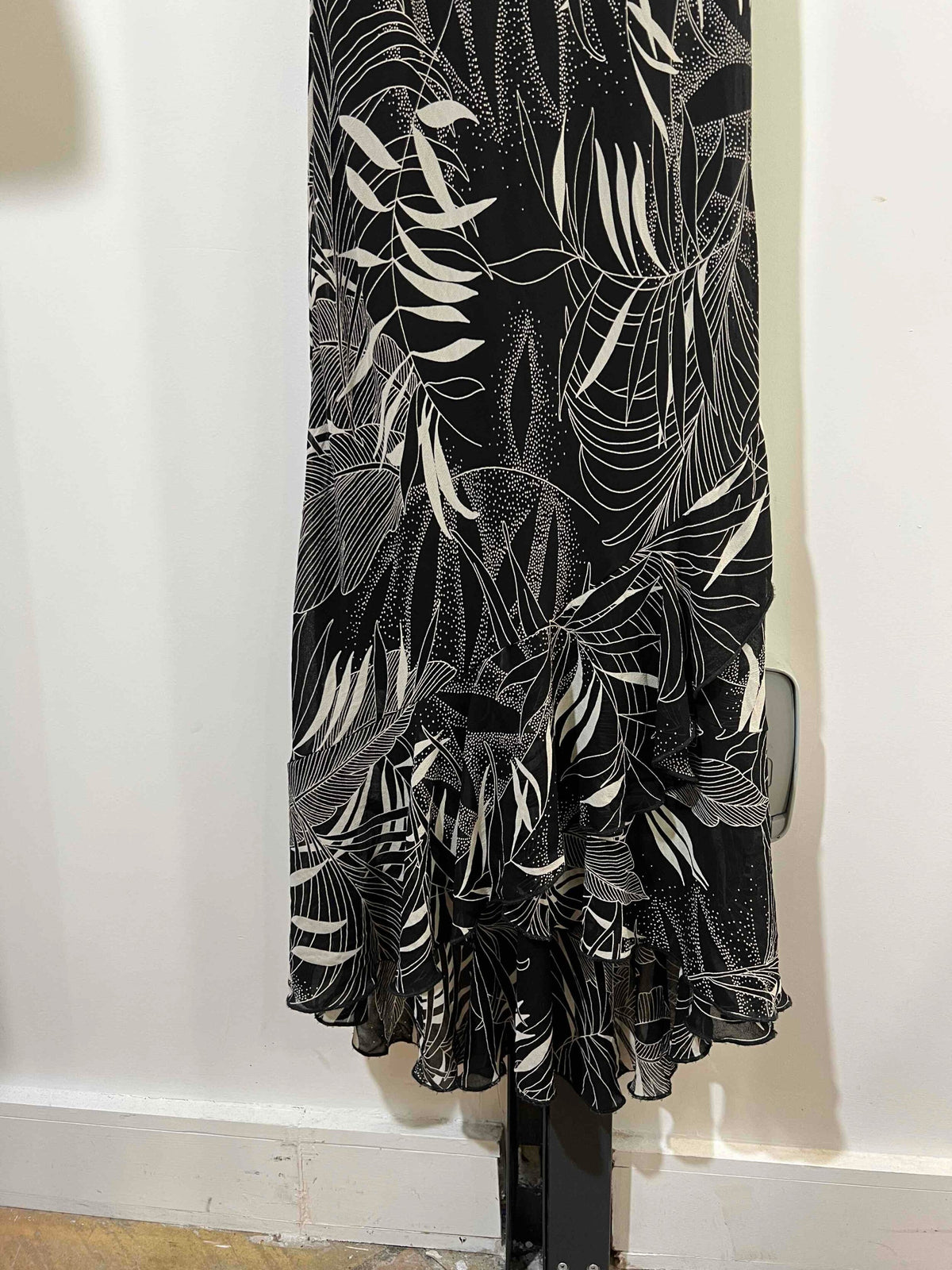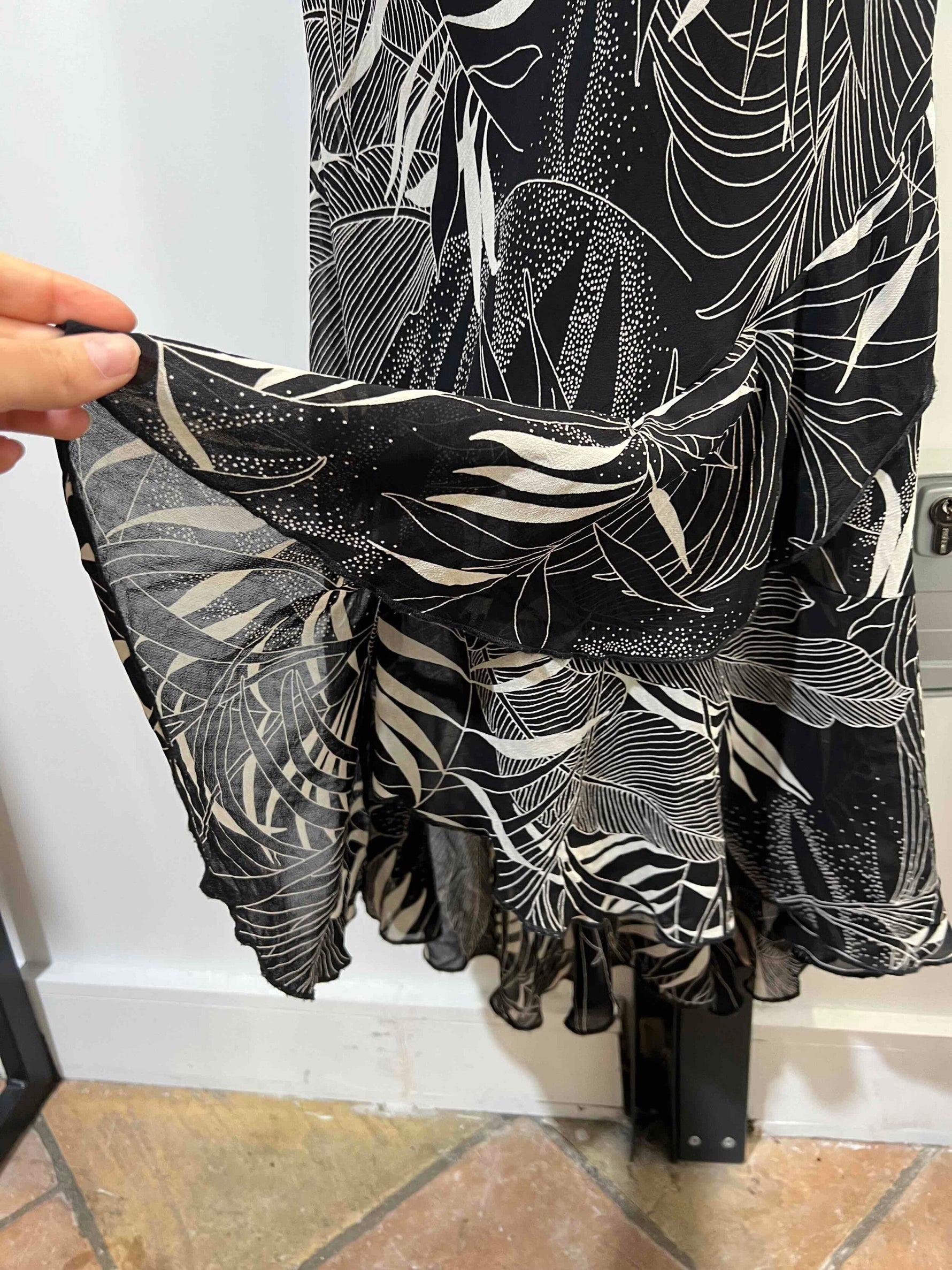Robe spaghettis longue en viscose noire à motif blanc. Taille 38. Coupe fit and flare. Excellent état. Années 90s.