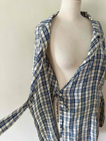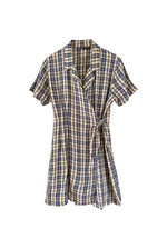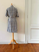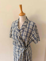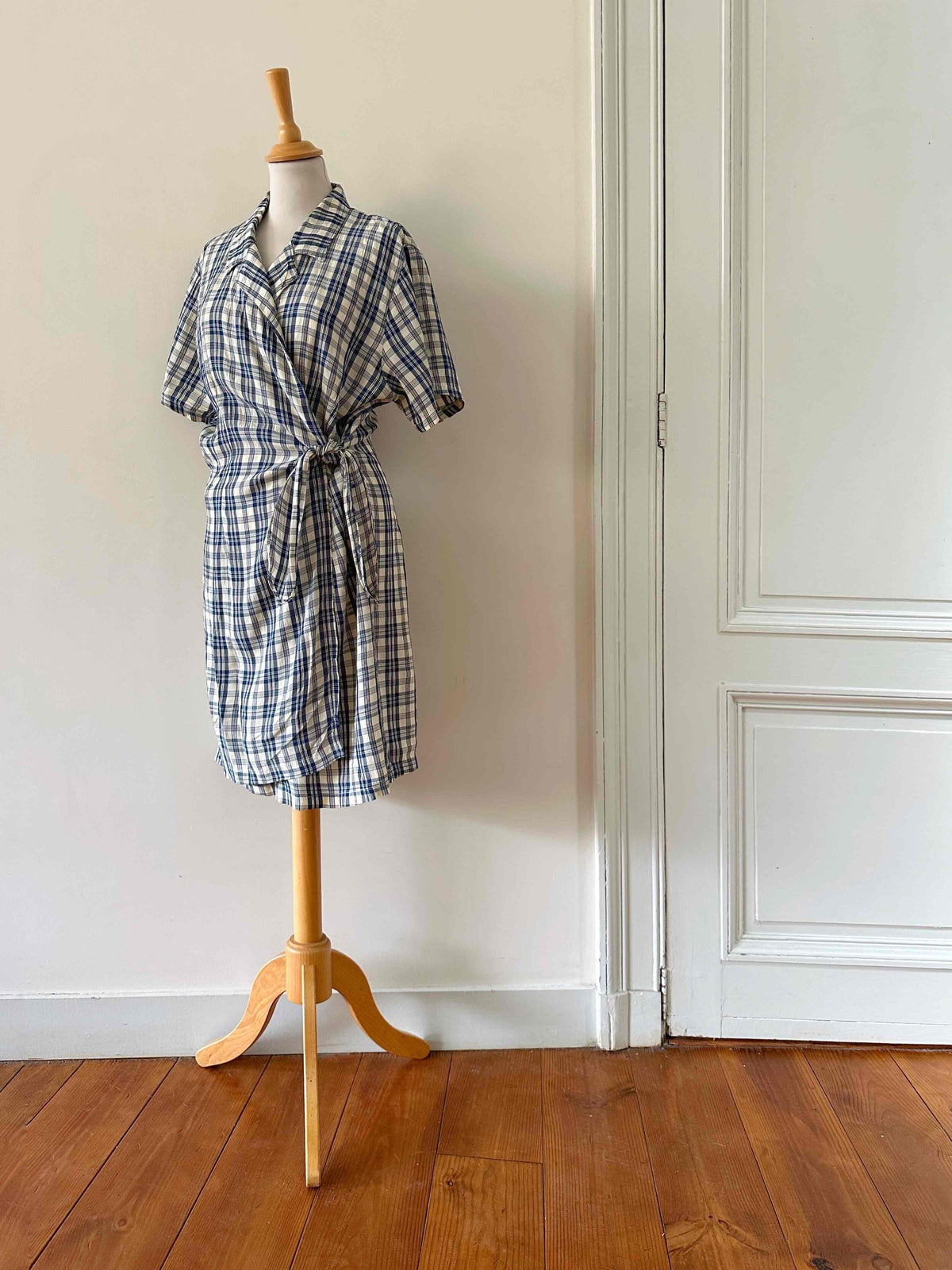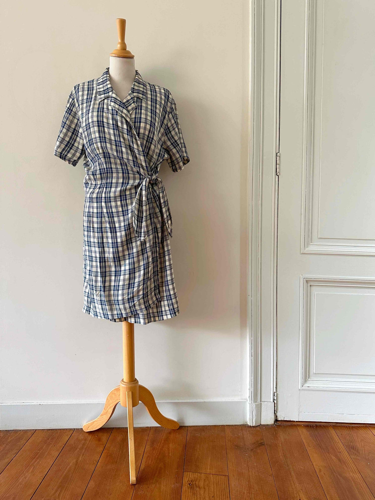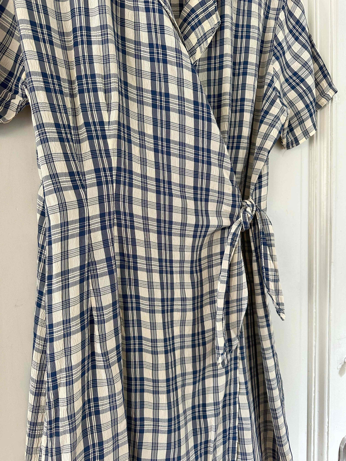 Prix unitaire parRobe portefeuille vichy, en viscose crêpe à carreaux vichy bleu marine et écrus, taille à croiser et à nouer, intérieur et extérieur à draper, col chemisier, fabriquée en France, s'adapte aux tailles 36 et 38, portée ici sur un mannequin T36, aisselles 46 cm.