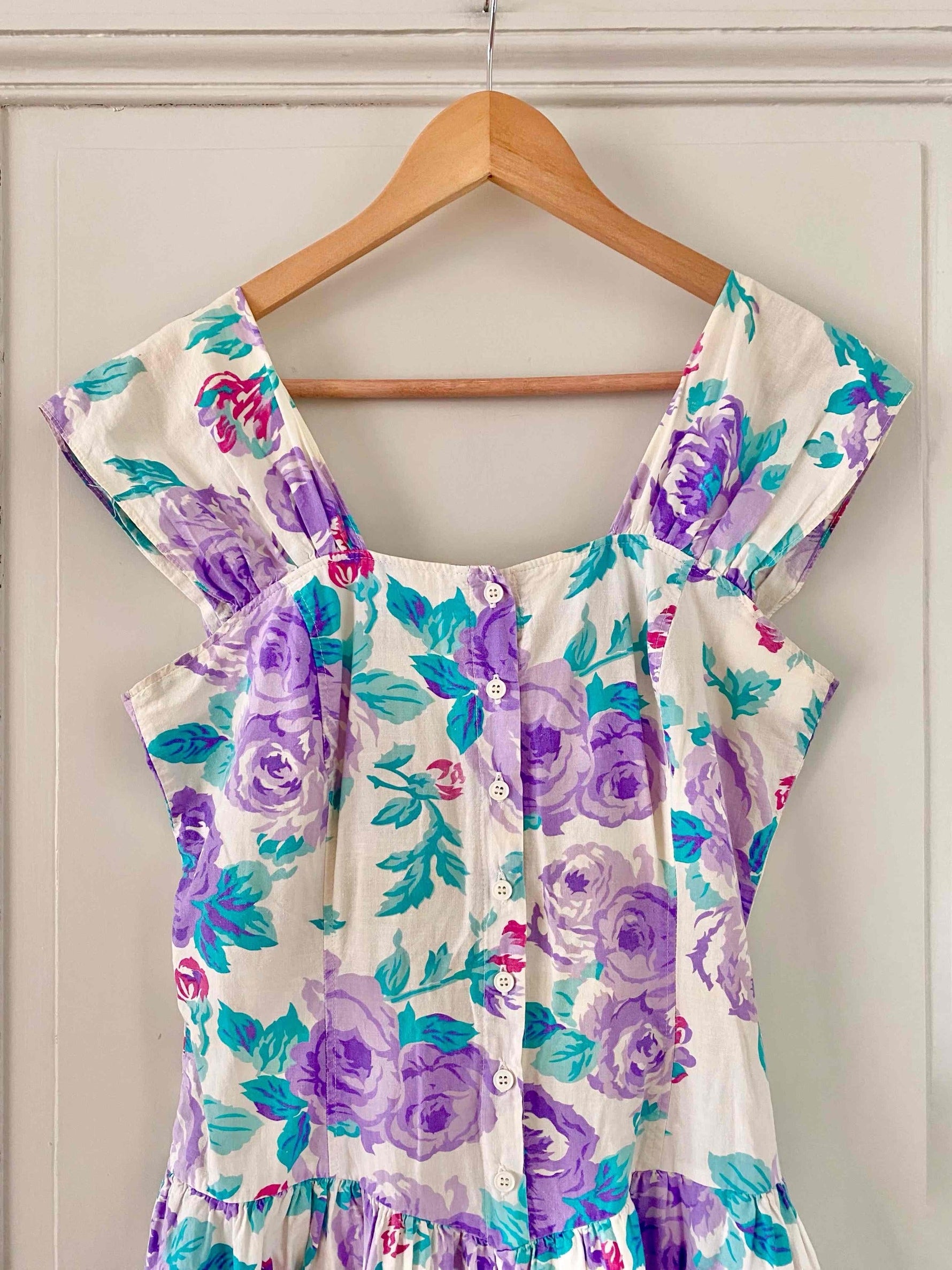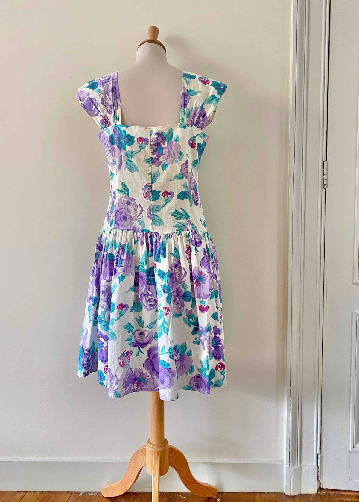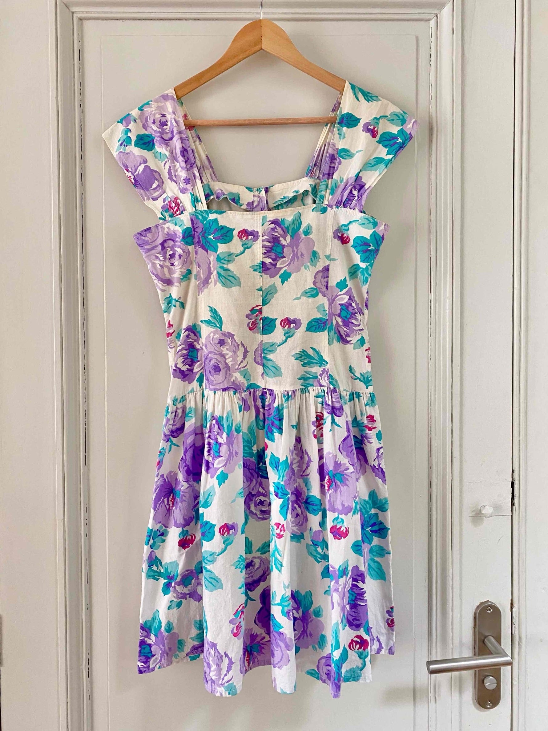 Prix unitaire parRobe à fleurs en coton, blanc imprimé floral lilas, violet et bleu, bretelles larges froncées, boutonnée, fabriquée en France. Aisselles 45cm