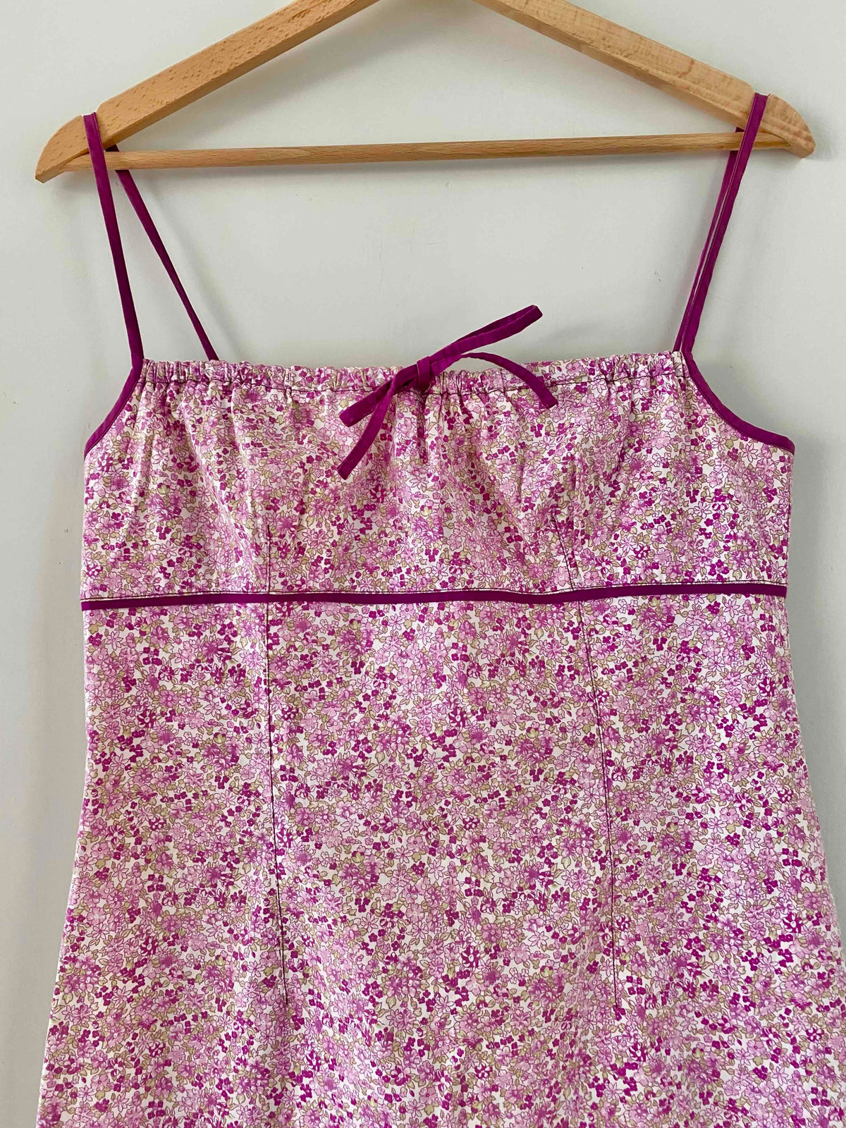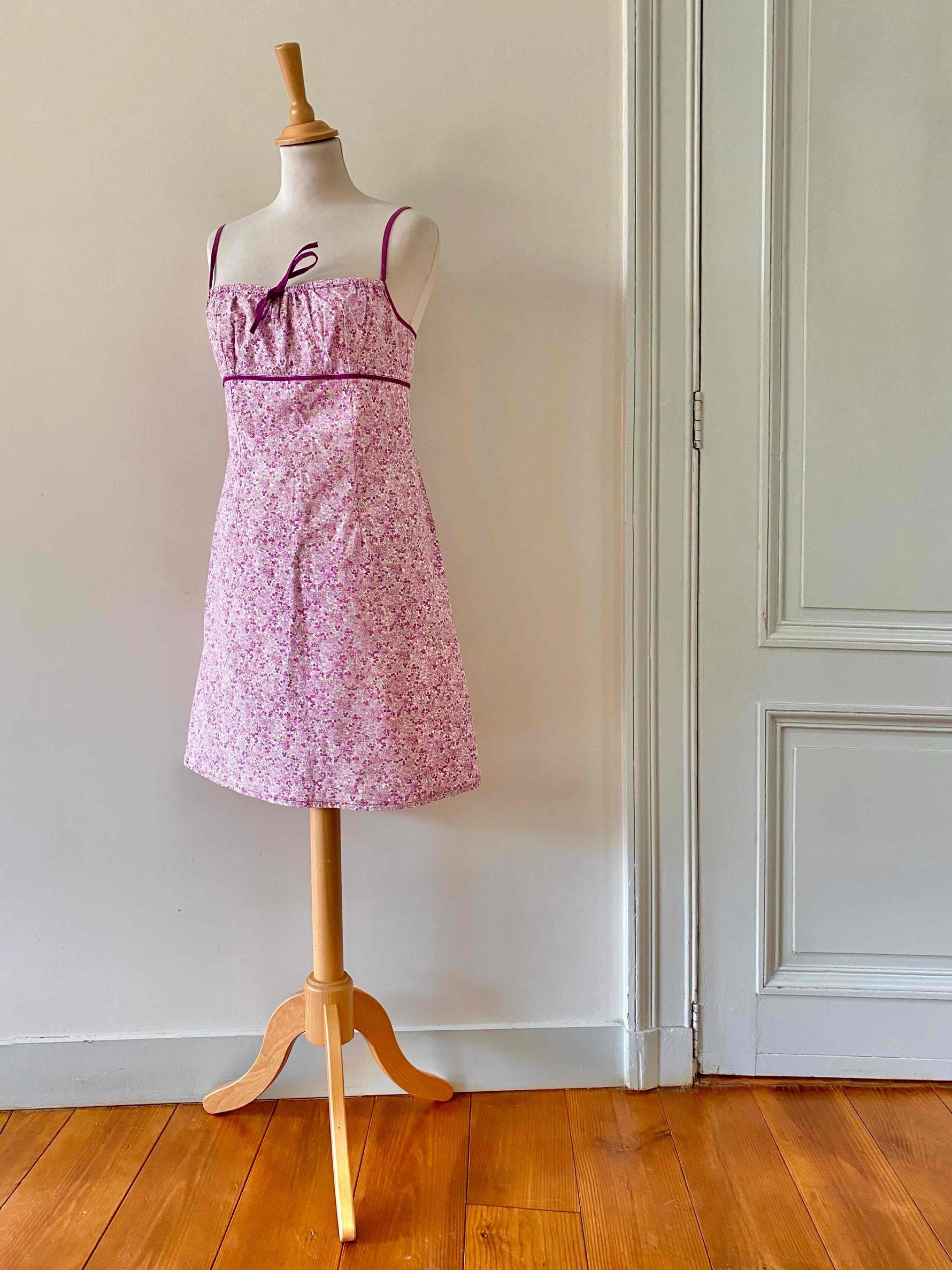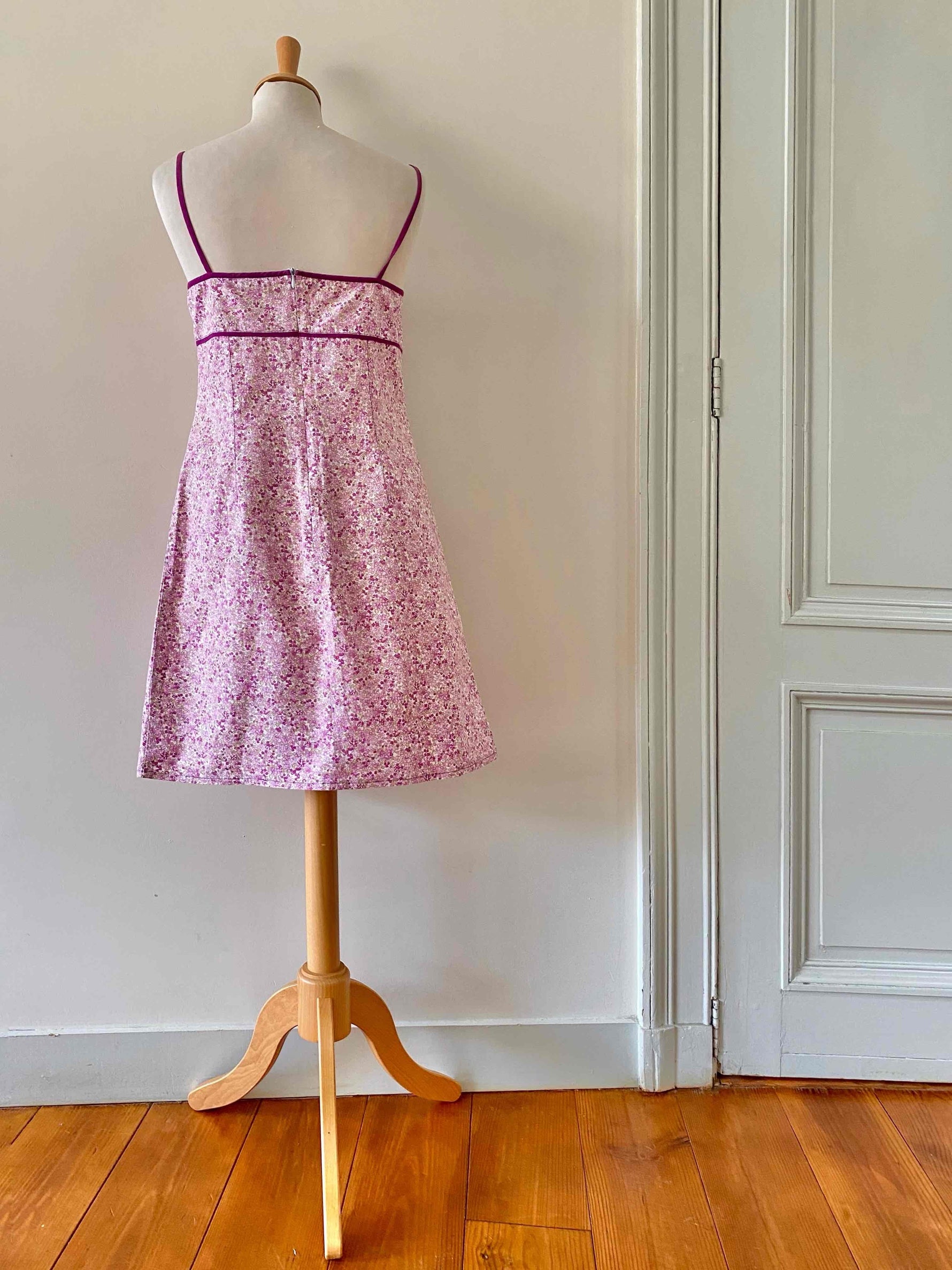 Prix unitaire parRobe à fleurs, en coton élasthanne matière gainante, blanche imprimée fleurs liberty, grenats, lilas, roses et vertes, bretelles spaghettis, poitrine froncée à nouer, fabriquée en France, taille 36 portée ici sur un mannequin T36, aisselles 43cm.