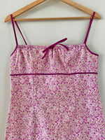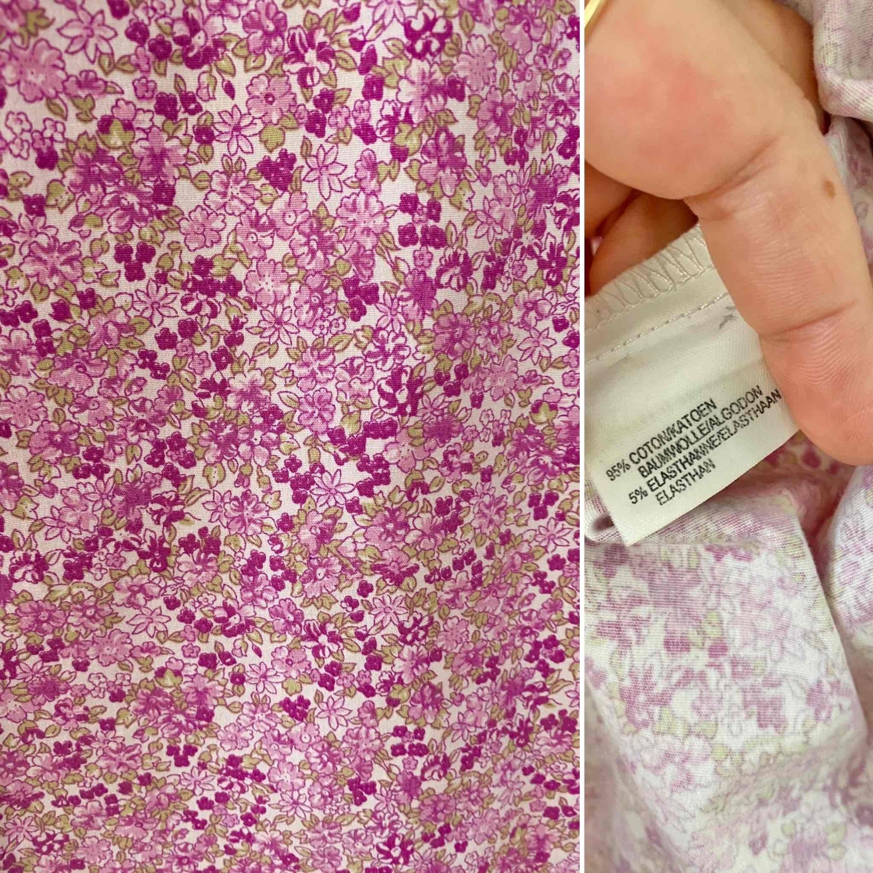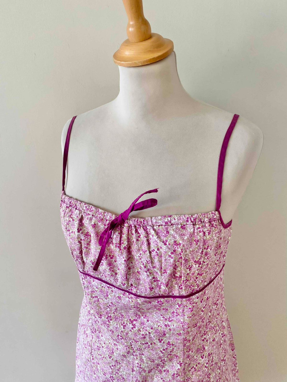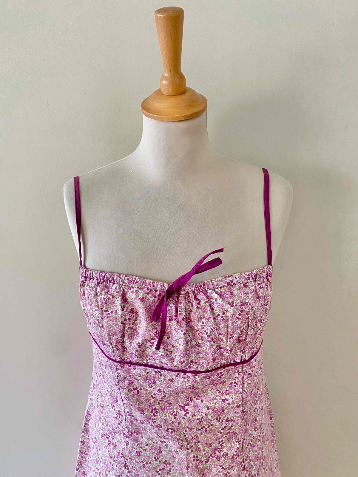 Prix unitaire parRobe à fleurs, en coton élasthanne matière gainante, blanche imprimée fleurs liberty, grenats, lilas, roses et vertes, bretelles spaghettis, poitrine froncée à nouer, fabriquée en France, taille 36 portée ici sur un mannequin T36, aisselles 43cm.