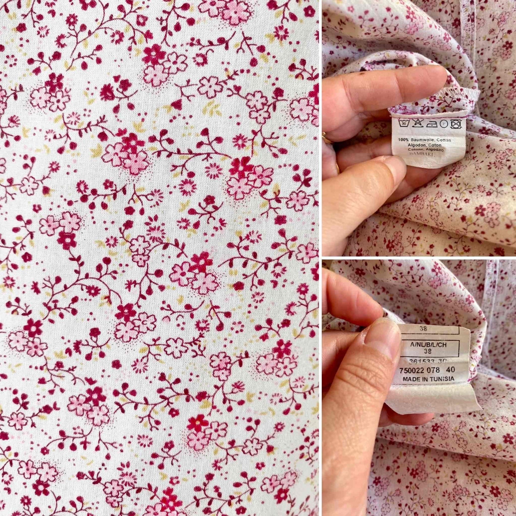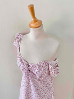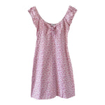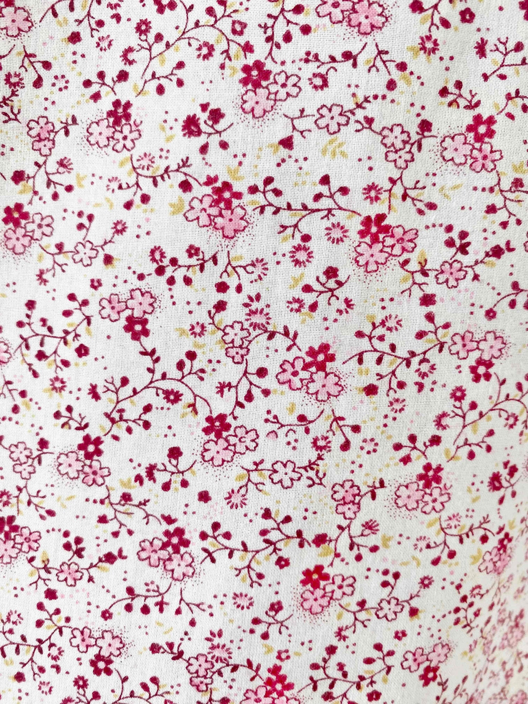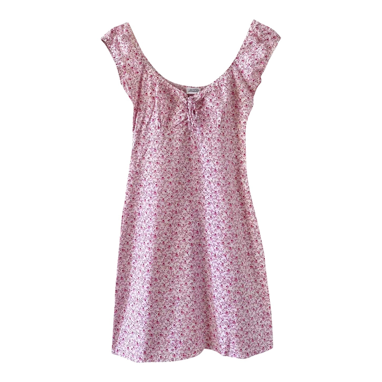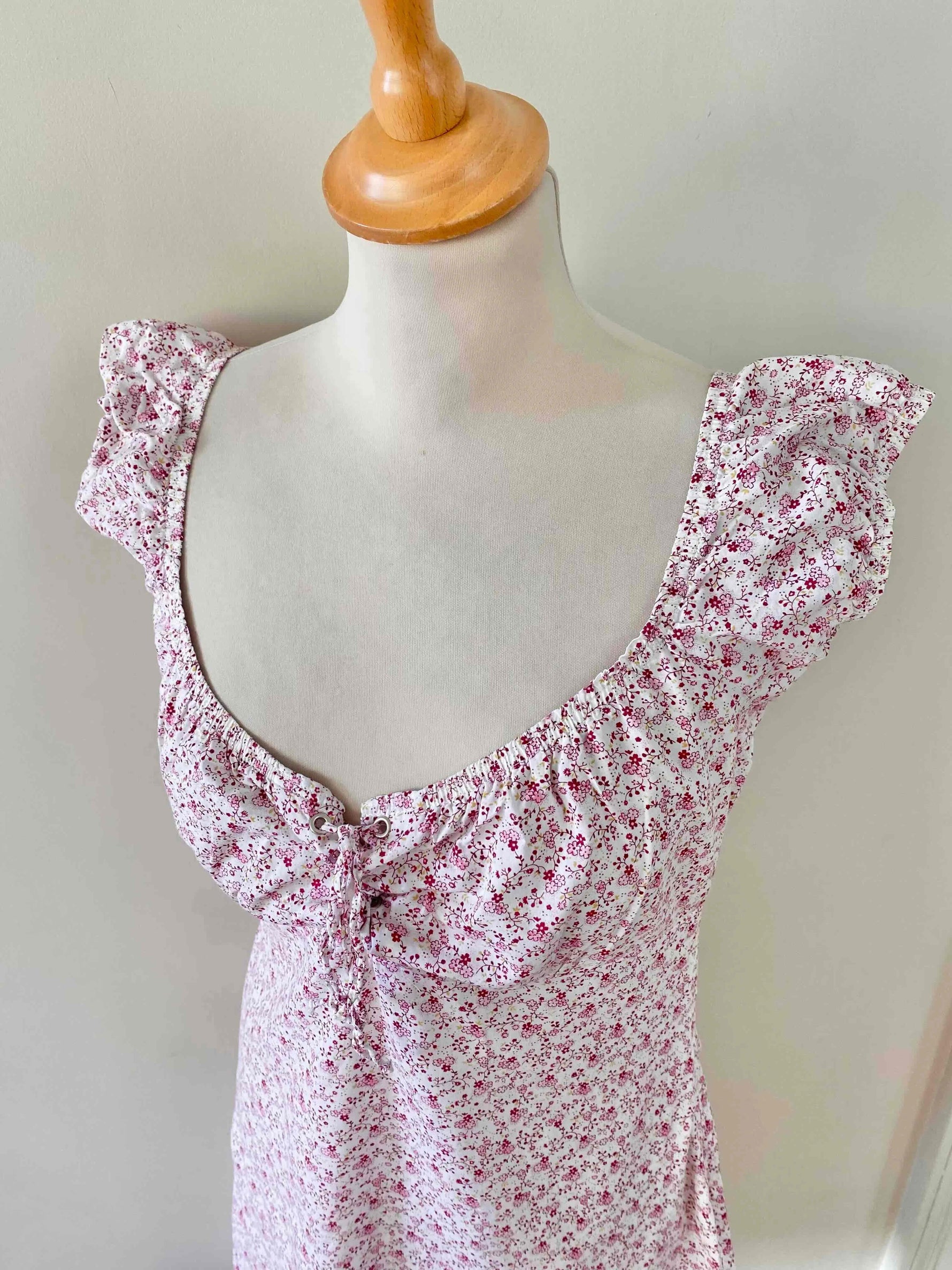 Prix unitaire parMini robe à fleurs en 100% coton blanc imprimée minis fleurs liberty roses, fuschias et citrons vert, poitrine froncée à nouer par un laçage à oeillets, manches élastique à porter open shoulder, années 90's, taille 36 actuelle portée ici sur un mannequin T36, aisselles 43cm.