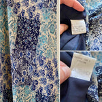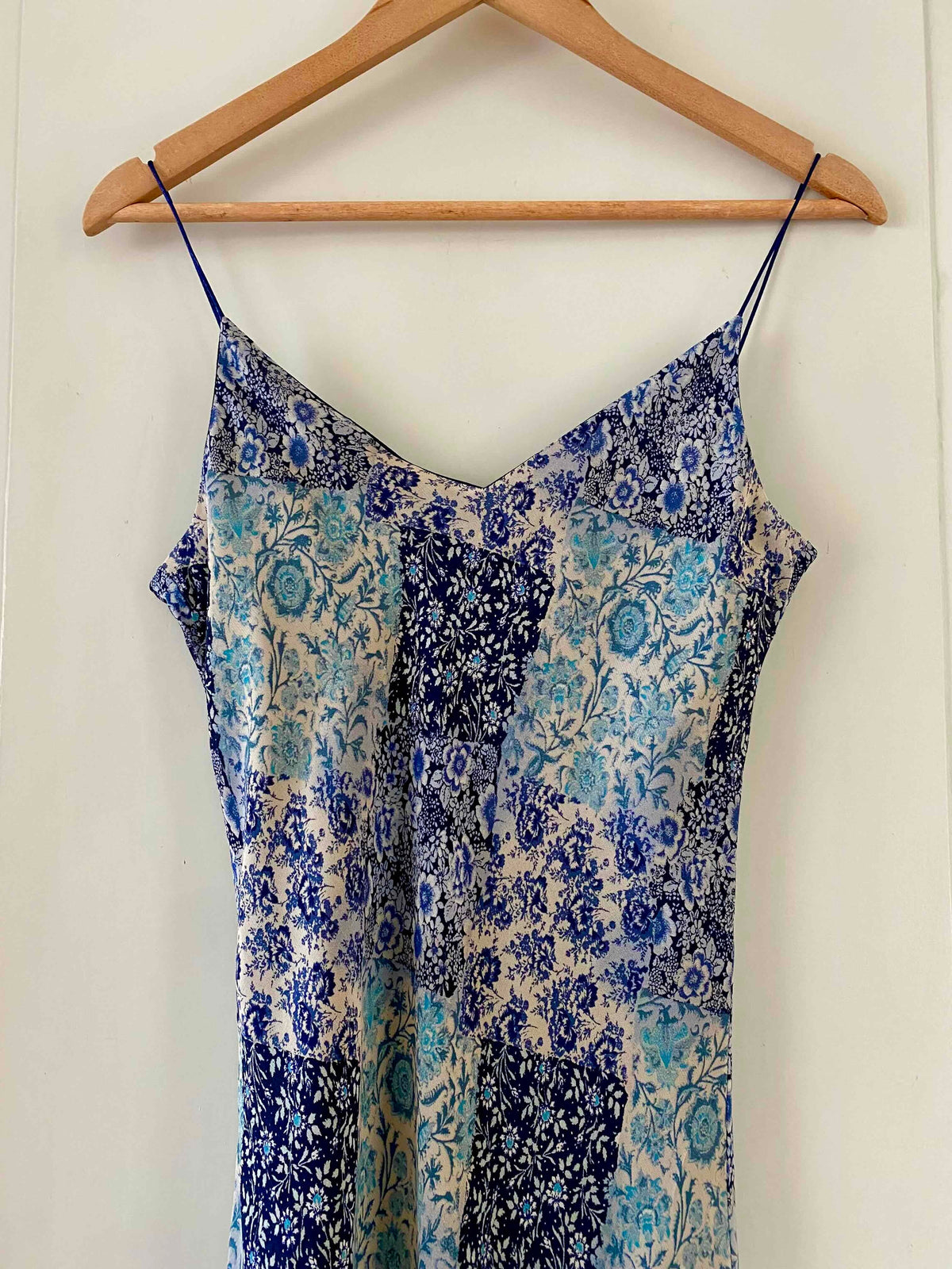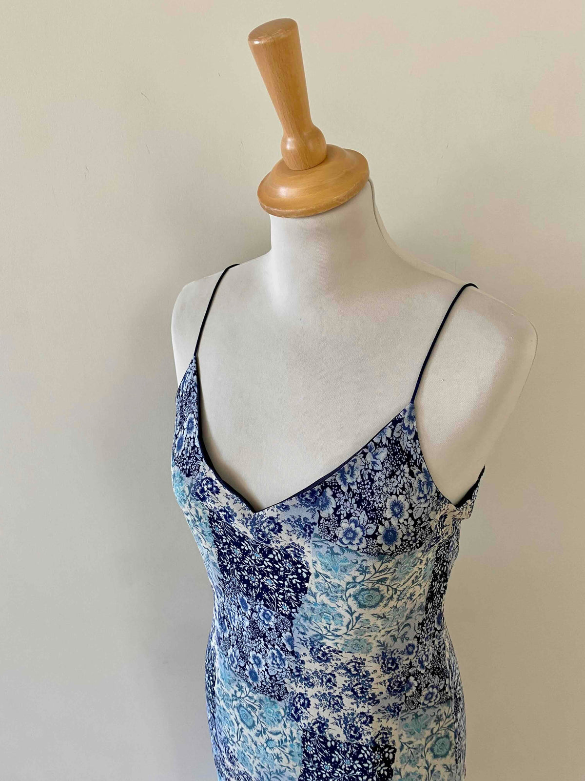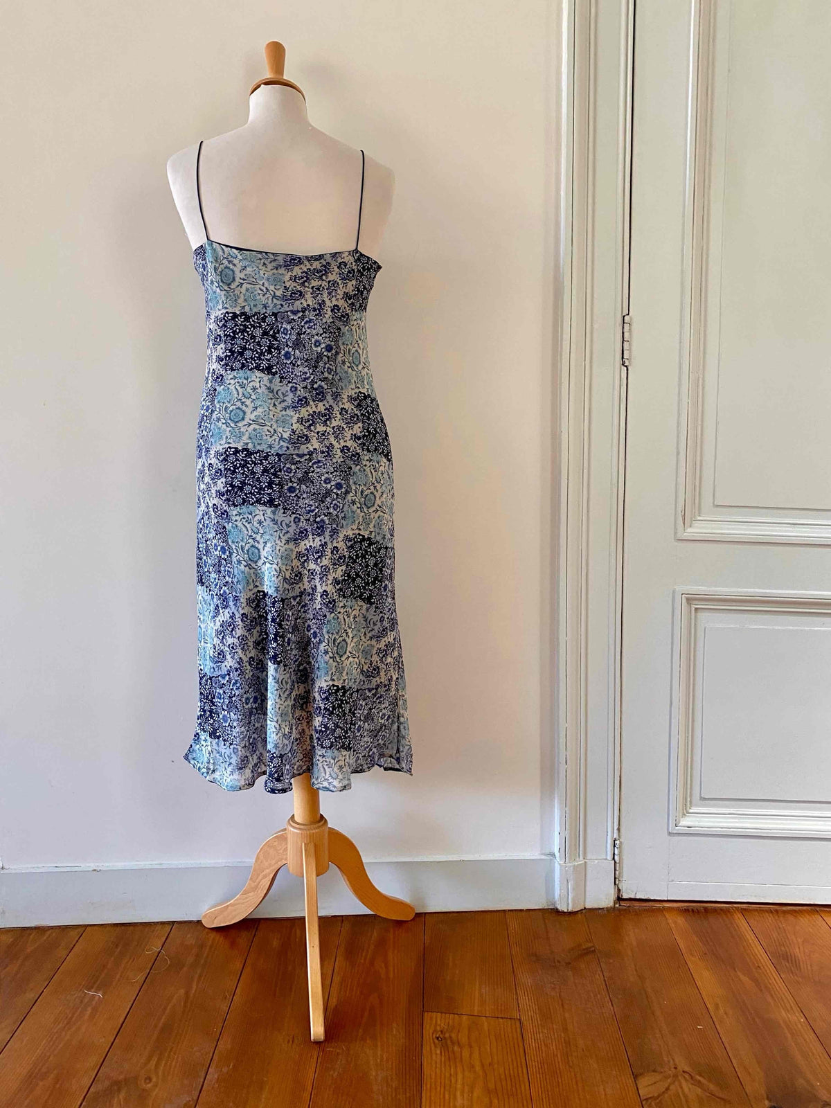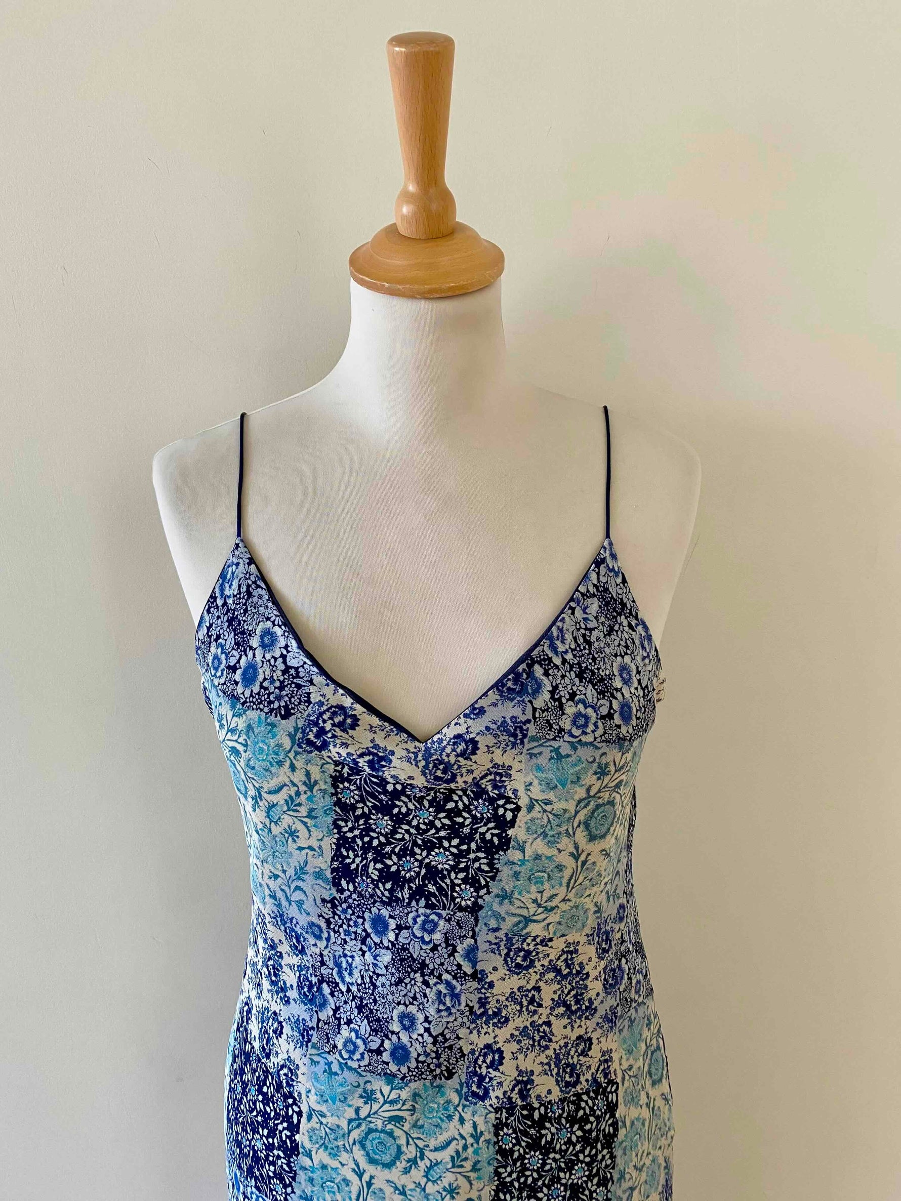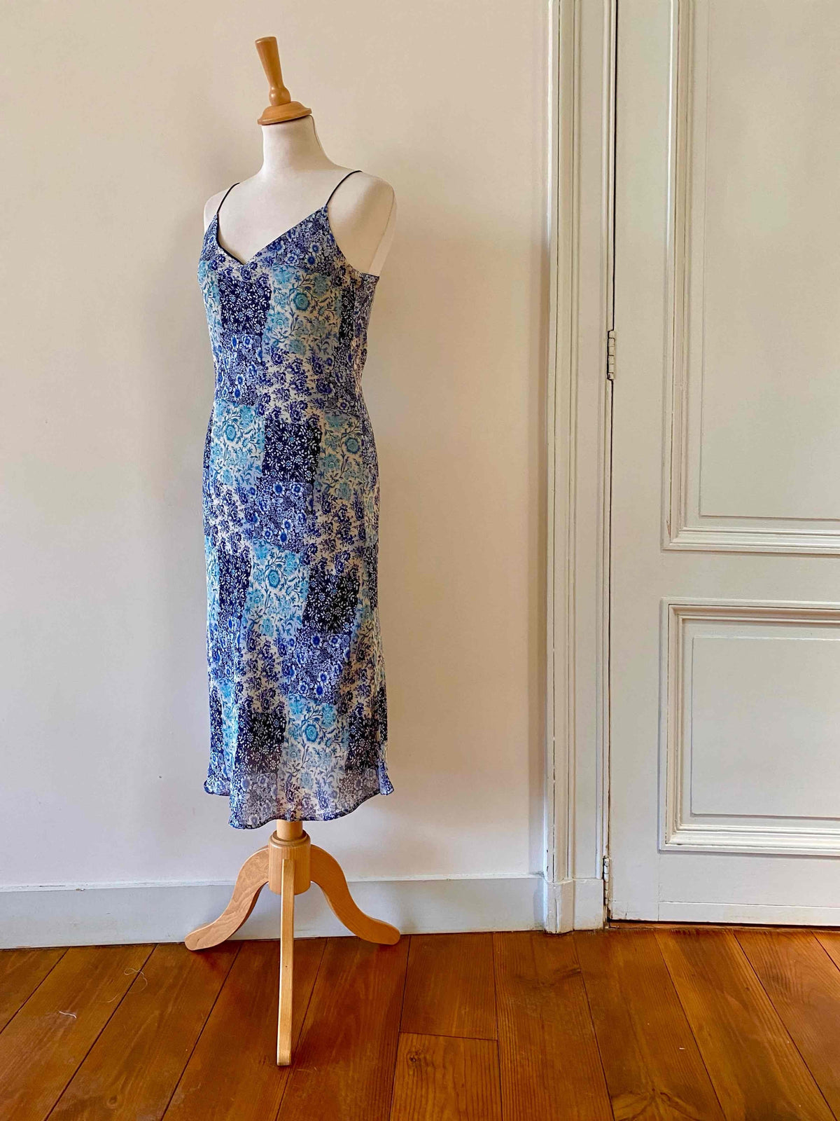 Robe nuisette patchwork, en voile viscose doublée imprimée patchwork fleuris dans les tons de bleus, bretelles spaghettis satinées, longueur midi et forme fit and flare en biais, fabriquée en France, taille 36 portée ici sur un mannequin T36, aisselles 43cm.