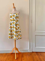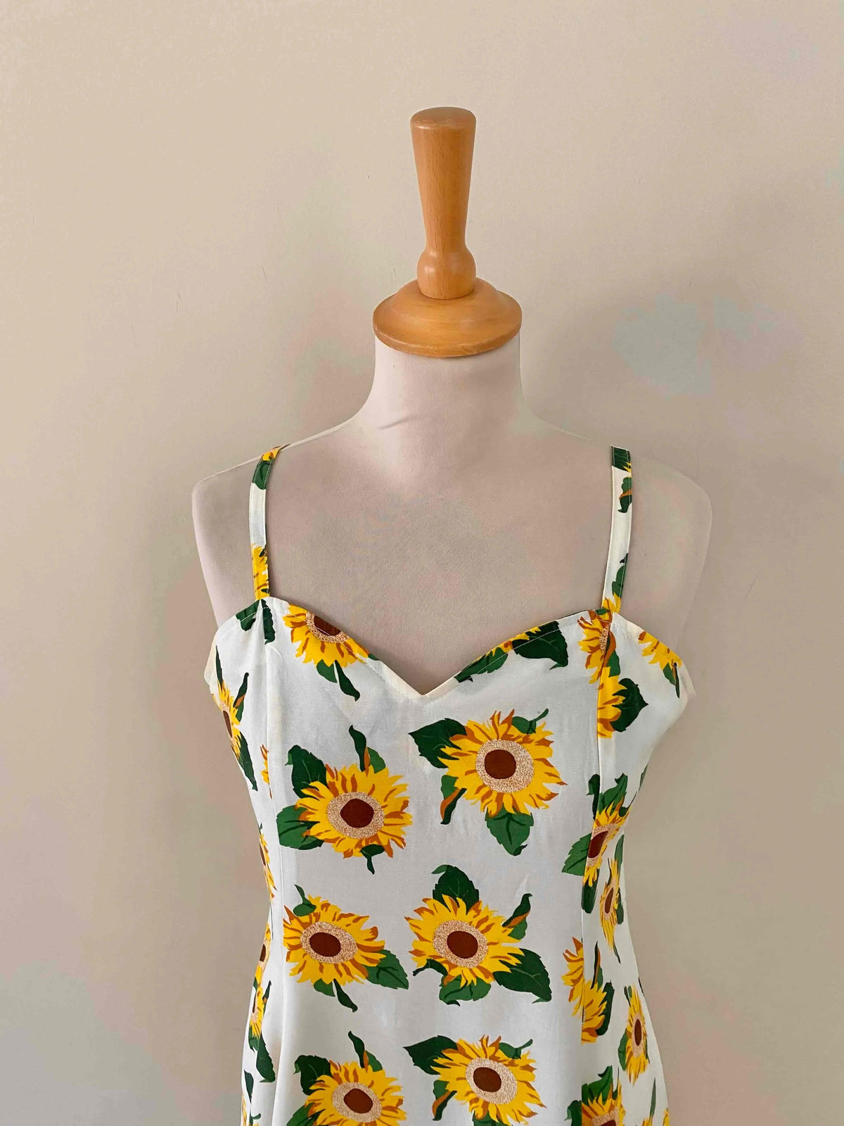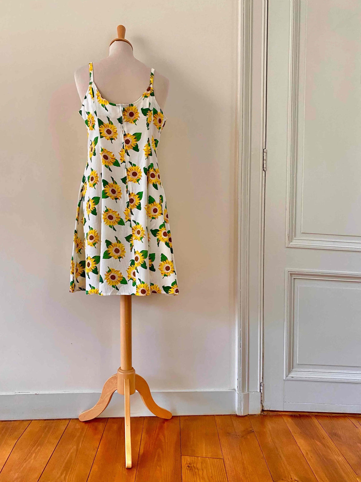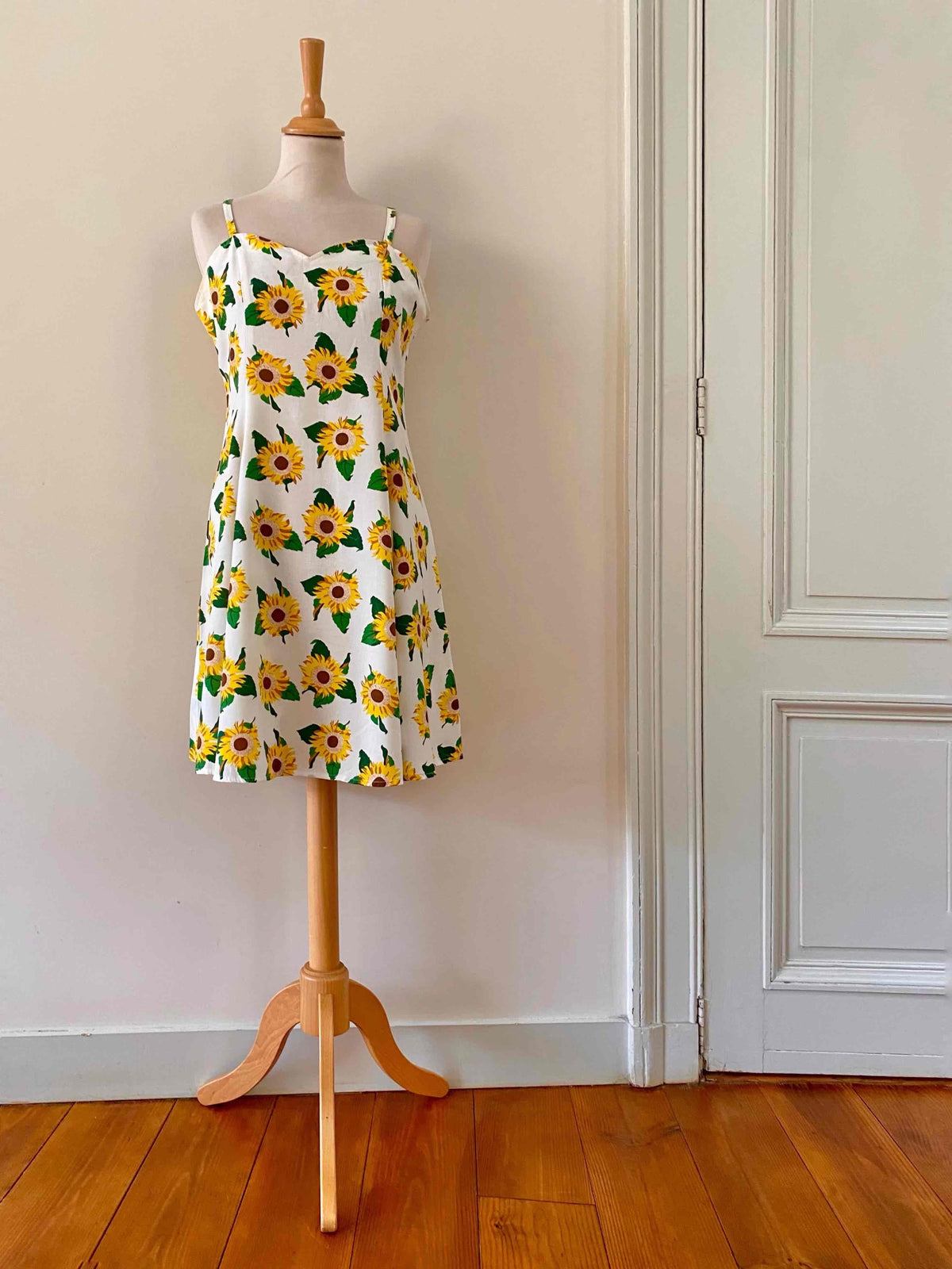 Prix unitaire parMini robe en viscose mélangée blanche imprimée tournesols jaunes et verts, bretelles spaghettis, encolure en coeur, forme fit and flare, fabriquée en France, taille 36 et petit 38 portée ici sur un mannequin T36, aisselles 44cm.