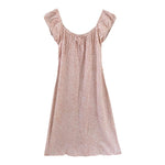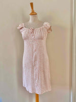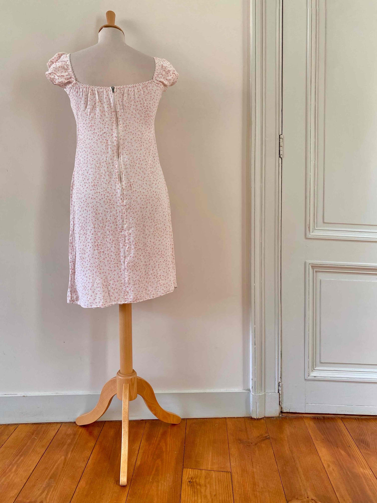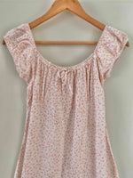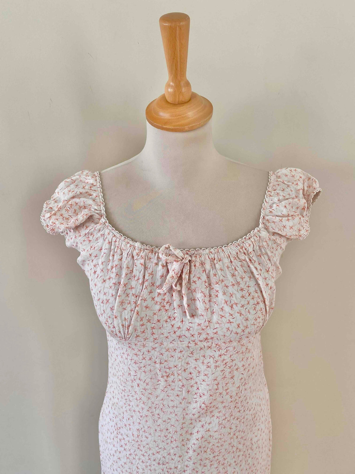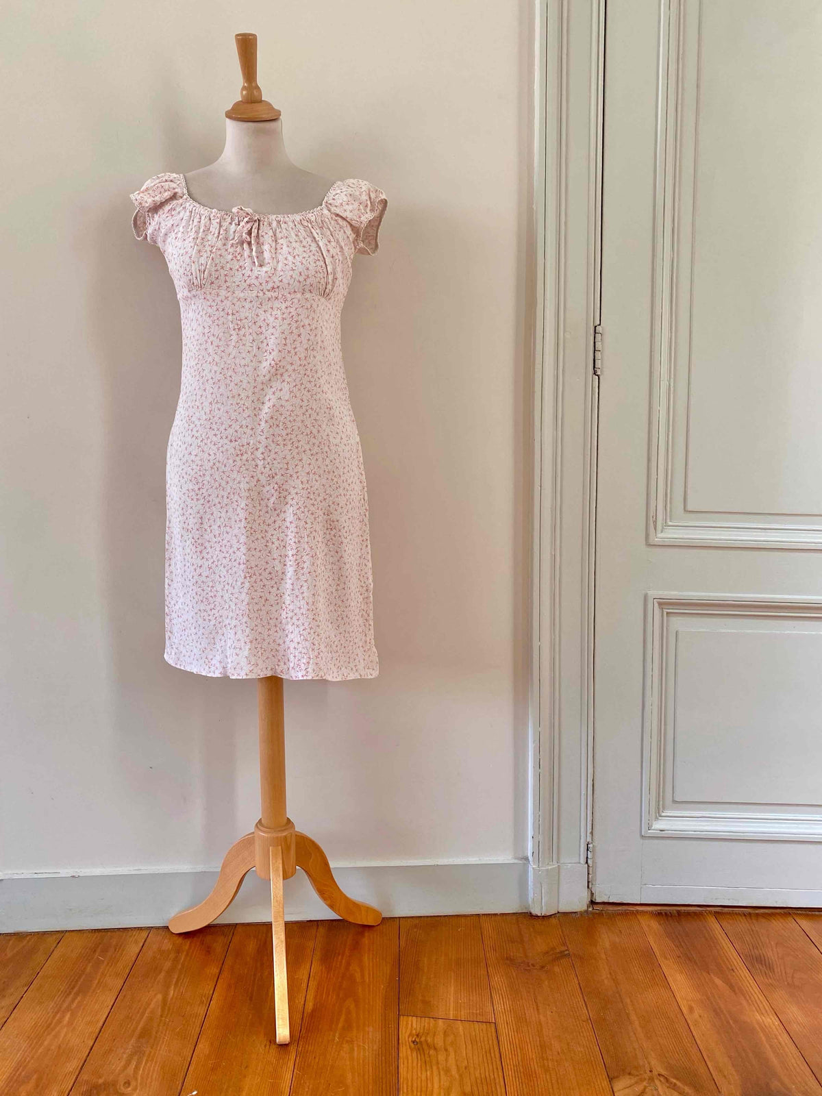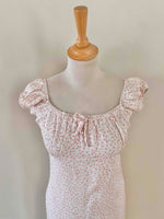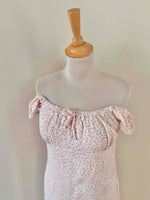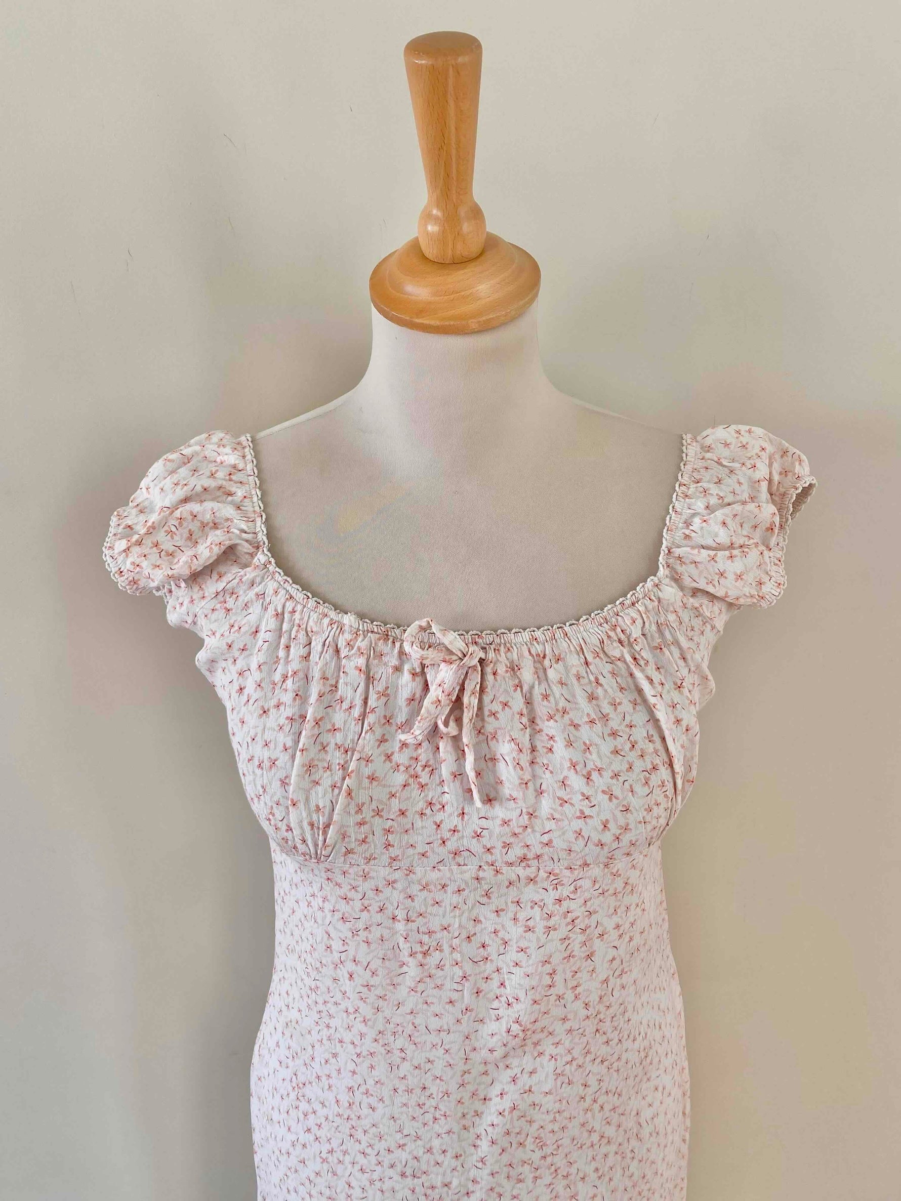 Prix unitaire parMini robe à fleurs, en viscose blanche, imprimée petites fleurs roses, encolure et manches ballons élastiques à porter open shoulders, poitrine froncée à nouer, taille 36 portée ici sur un mannequin T36, aisselles 43cm.