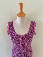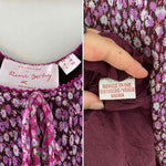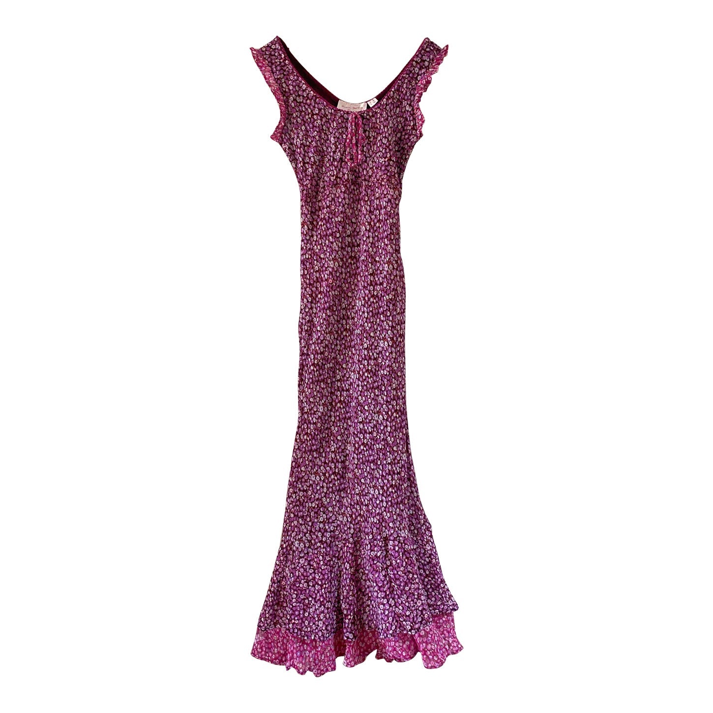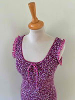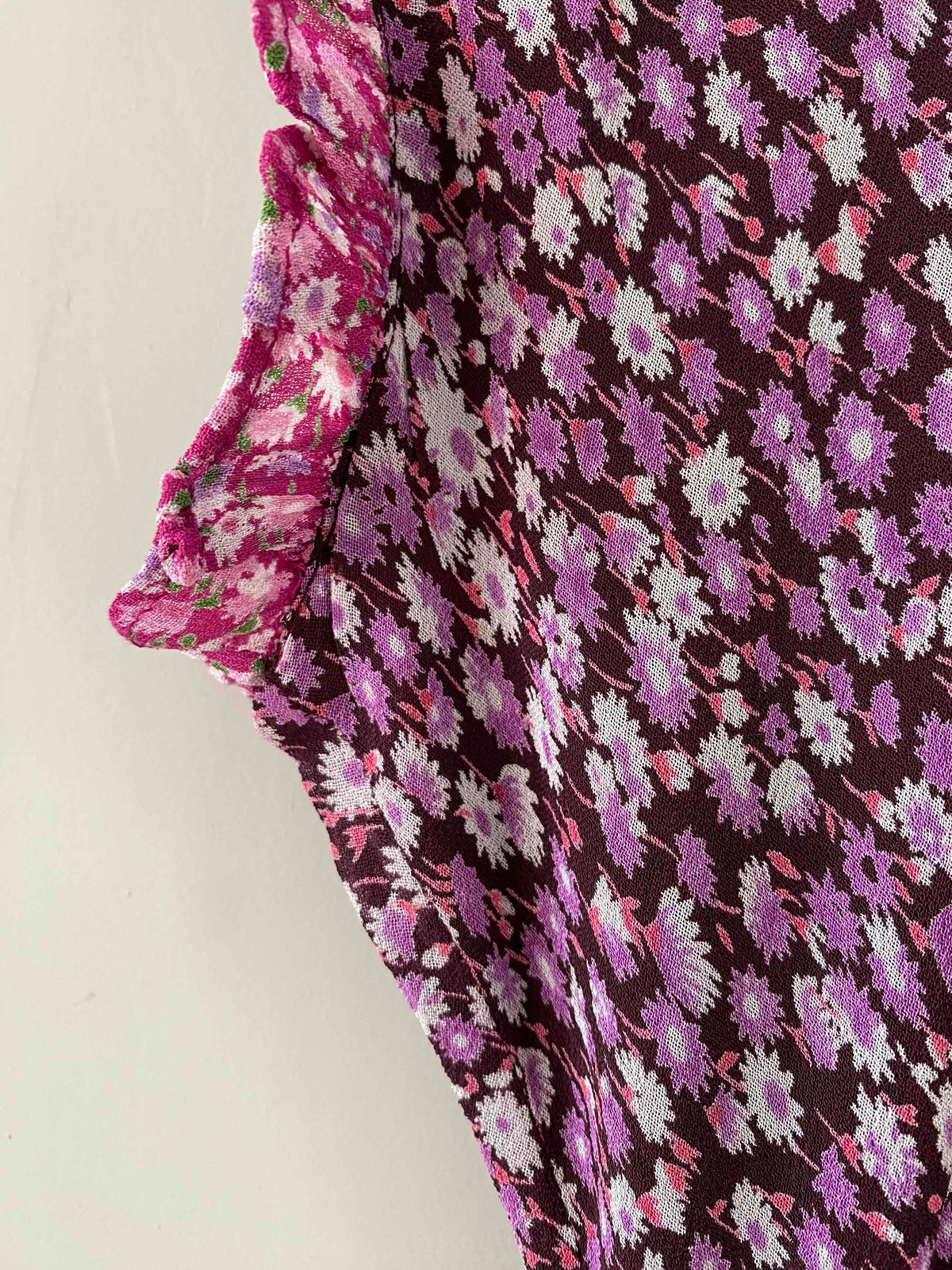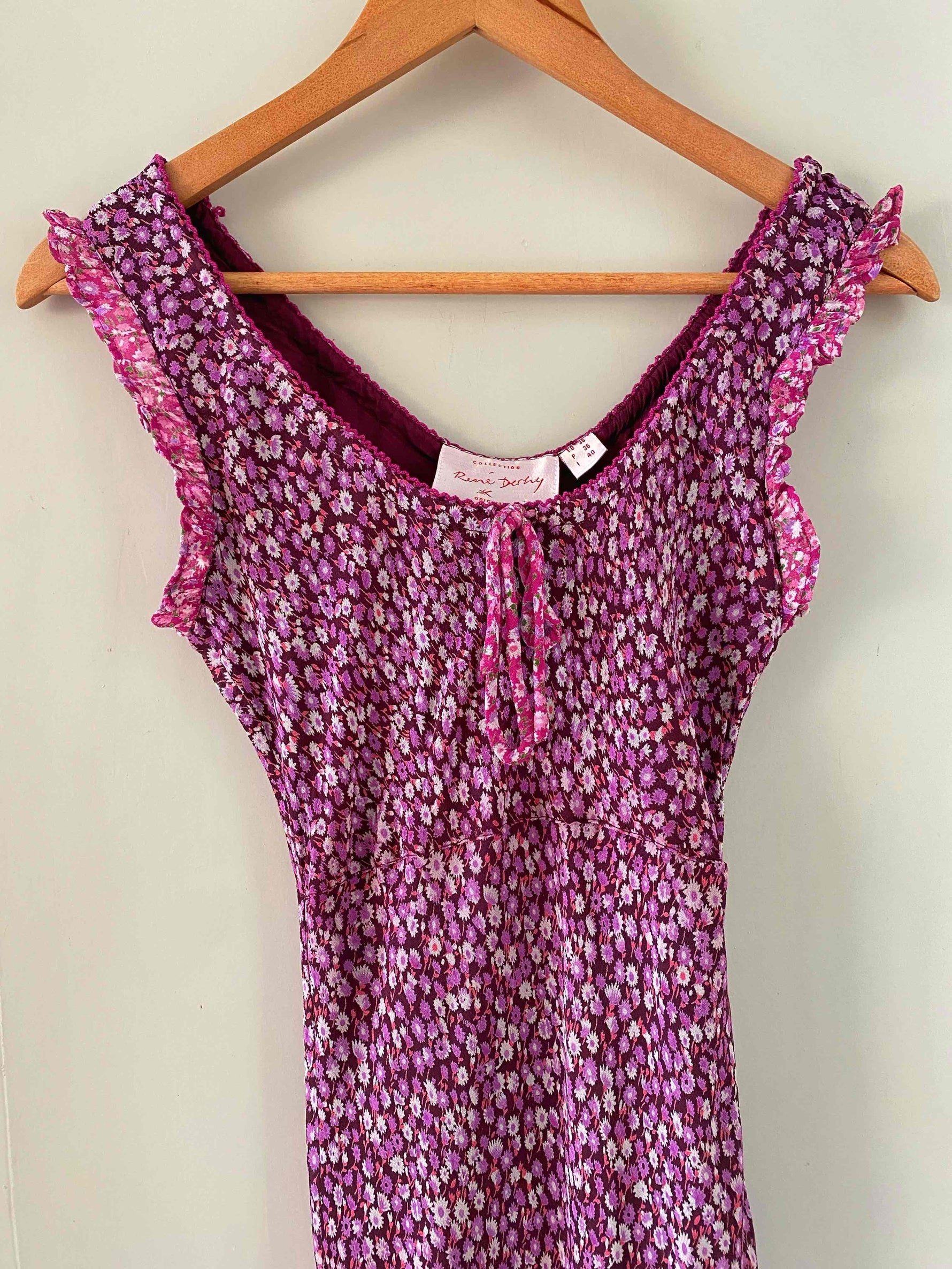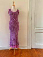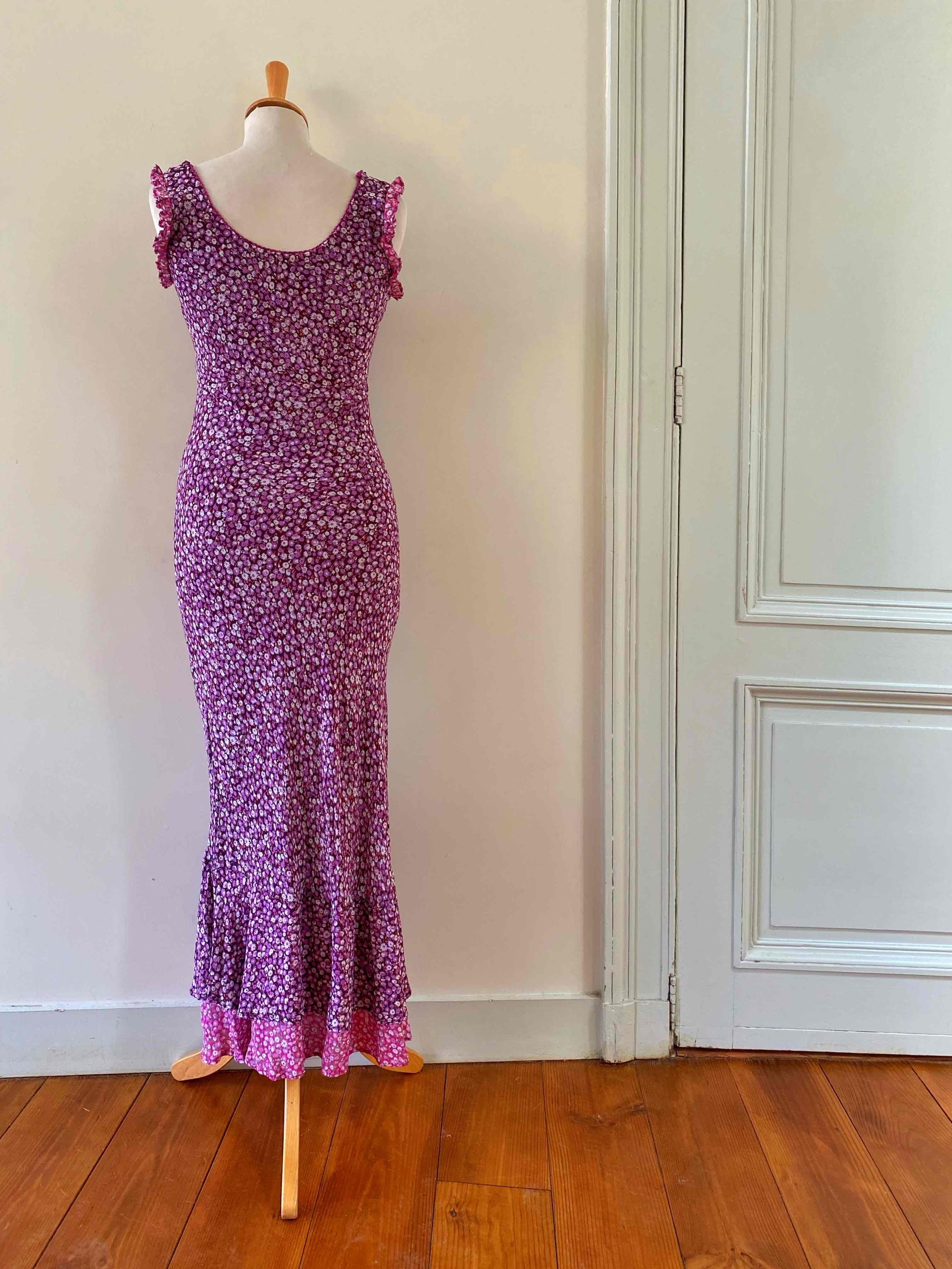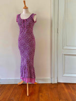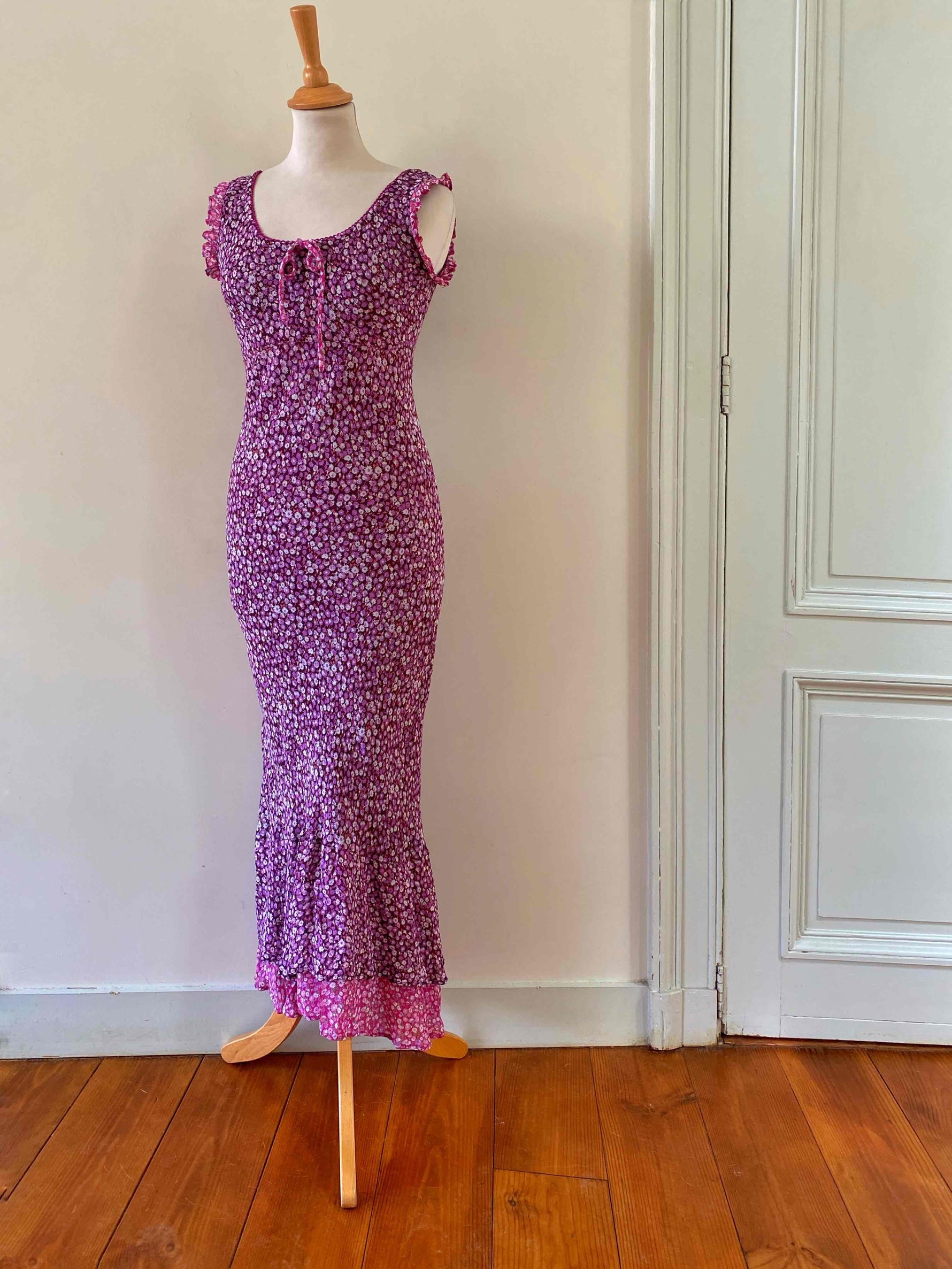Prix unitaire parRobe longue à fleurs en voile viscose doublée violet imprimée petites fleurs lilas et patchwork rose fuschia fleurie, encolure bordée de dentelle et poitrine froncée à nouer, petit volants aux emmanchures, forme fit and flare en biais, René Derhy 90's, taille 34 et 36 portée ici sur un mannequin T36, aisselles 43cm.