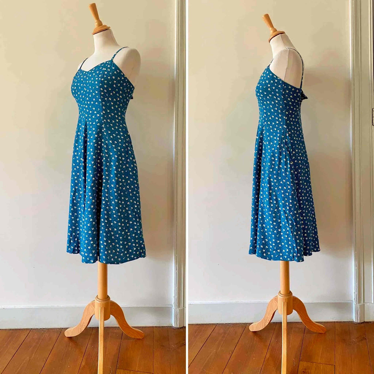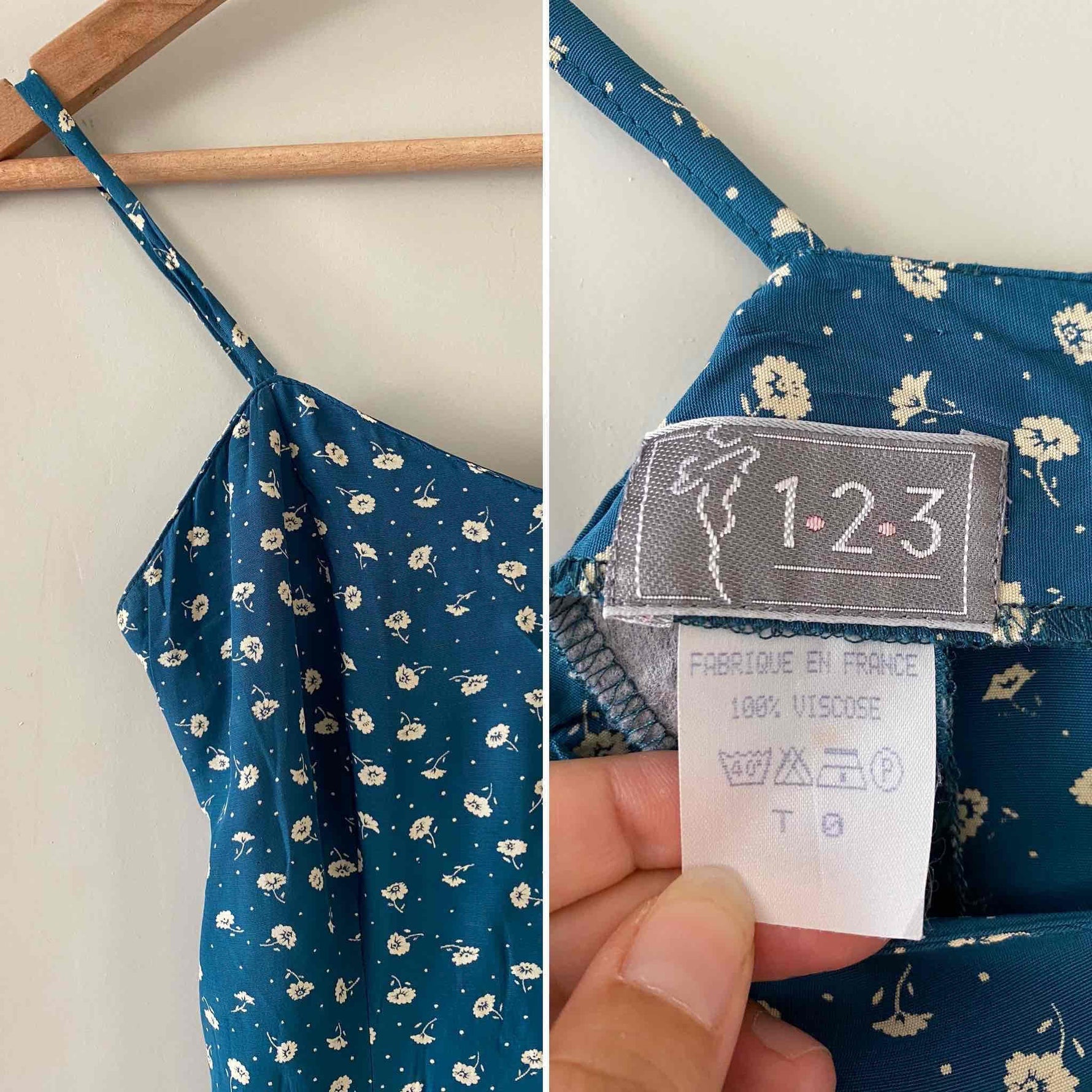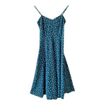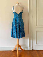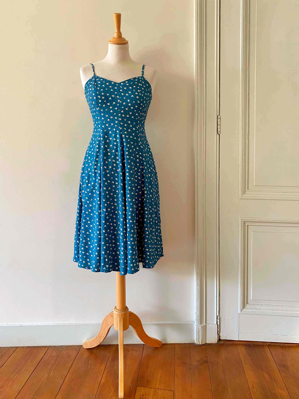 Mini robe à fleurs, en viscose bleu vert canard imprimée petites fleurs et minis pois blancs et beiges, encolure corsage coeur, bretelles spaghettis, forme fit and flare, fabriquée en France, taille 34 portée ici serrée sur un mannequin T36, aisselles 41cm.