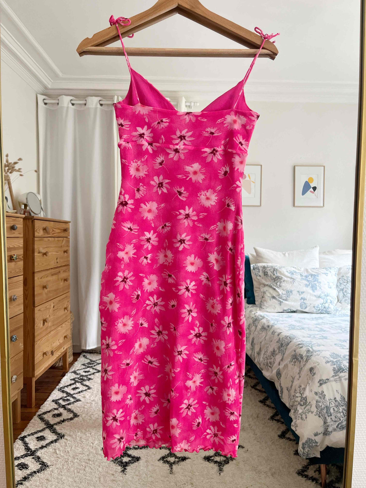 Prix unitaire parRobe rose à fleurs, longueur genoux, tissu doublé stretch et moulant, bretelles ajustable grâce à un noeud, décolleté en V. Portée ici sur une T36 pour 1m64.