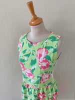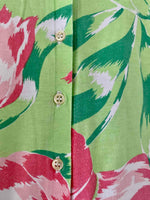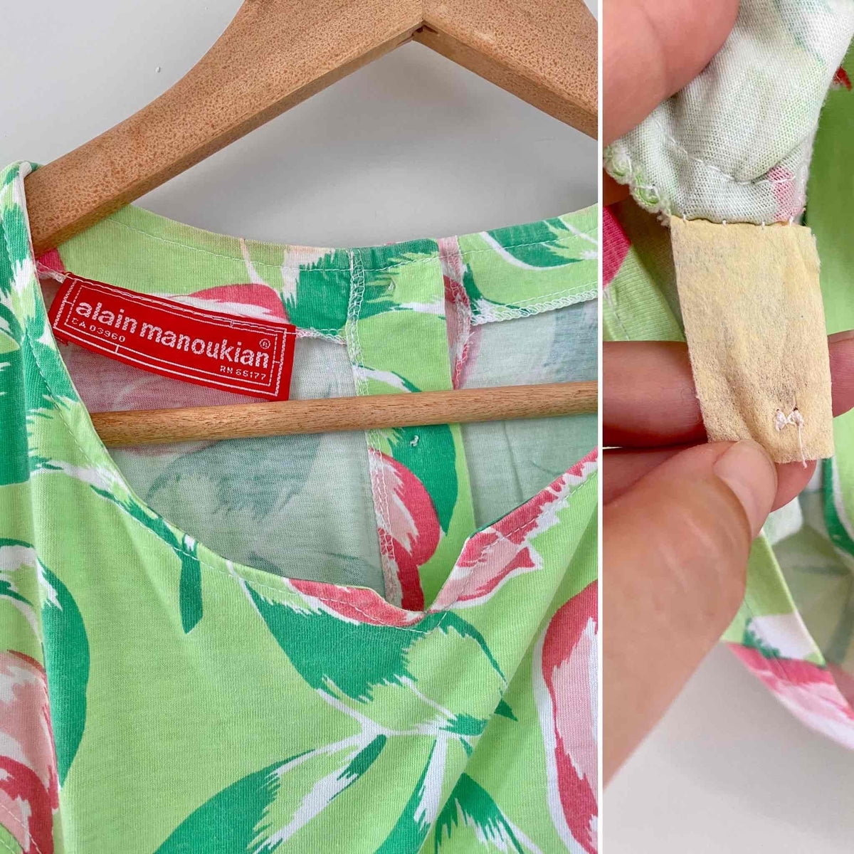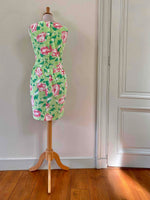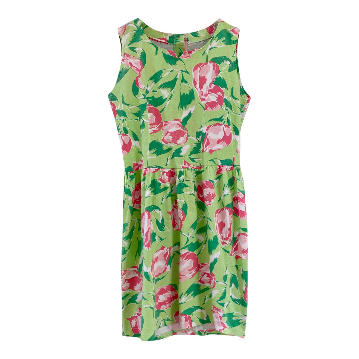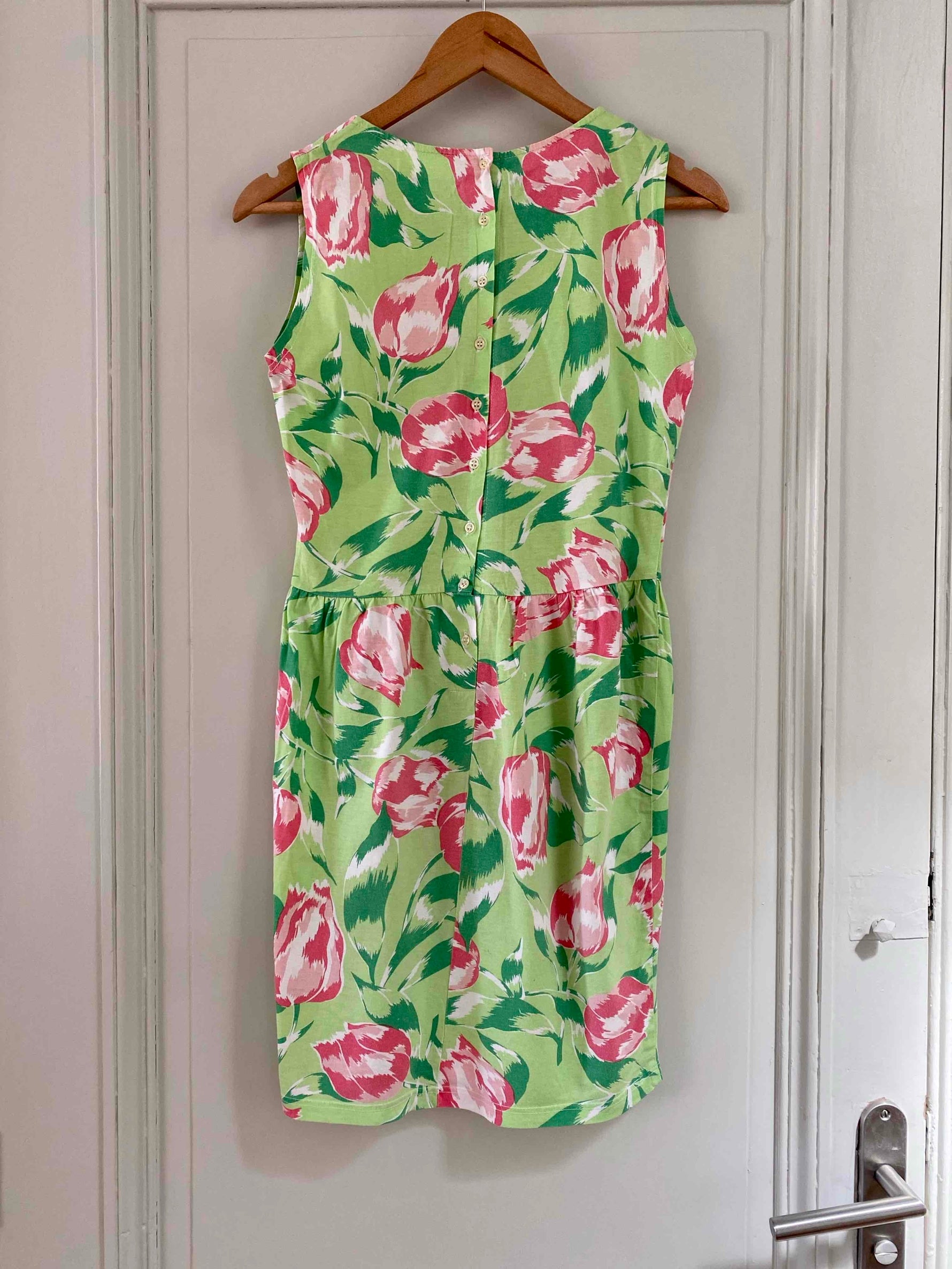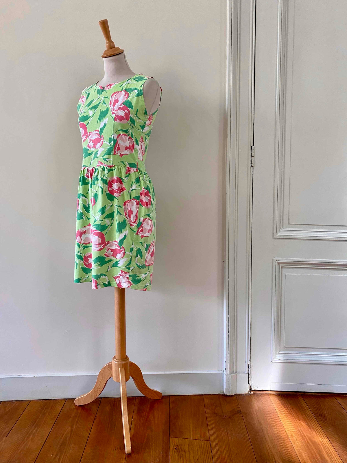 Prix unitaire parRobe t-shirt à fleurs, en jersey de coton élasthanne vert pistache imprimée tulipes roses, emmanchures américaines, dos boutonné, alain manoukian, Années 90's, fabriquée en France, taille 34 et 36 portée ici sur un mannequin T36, aisselles 43cm.