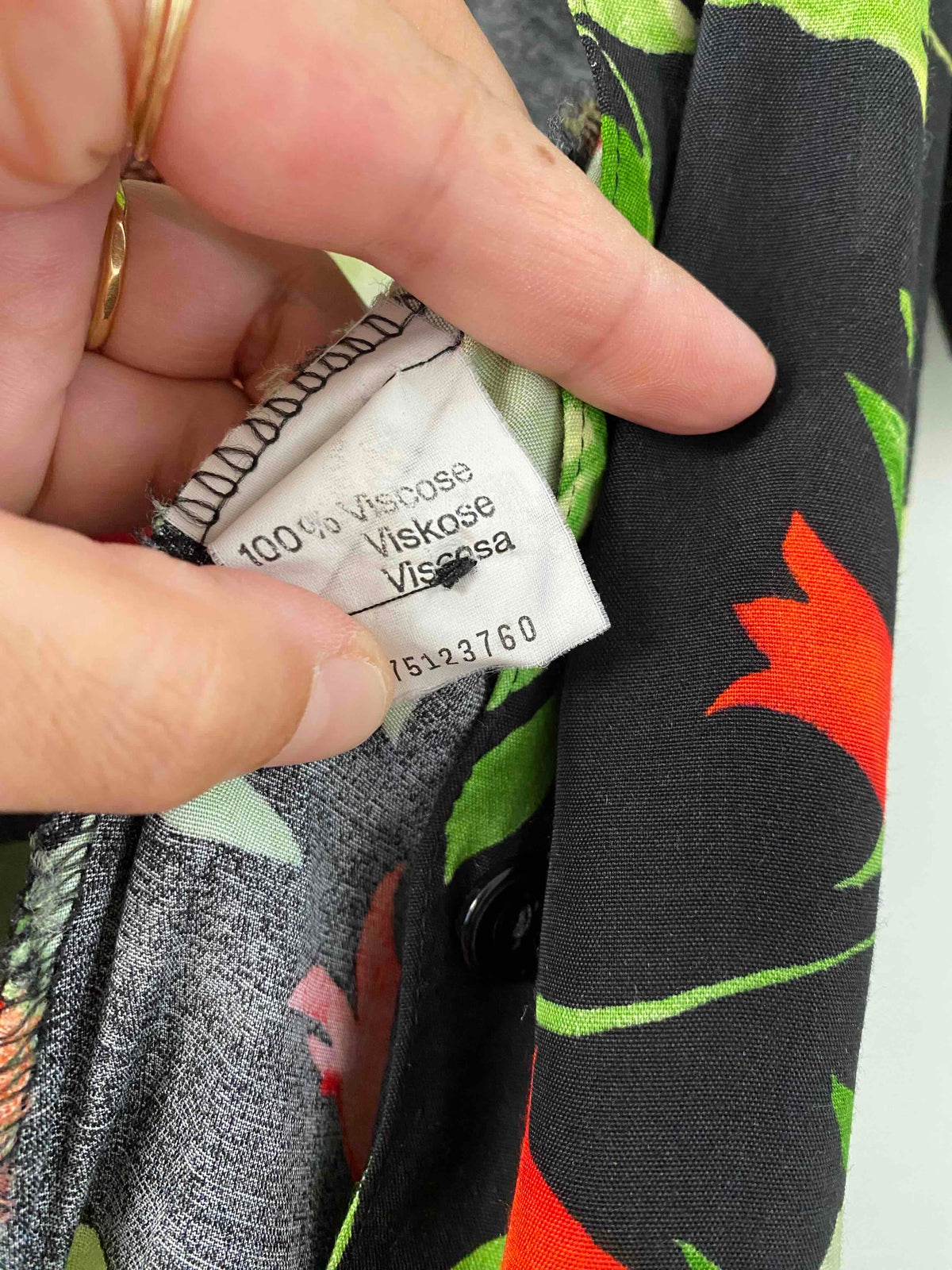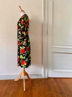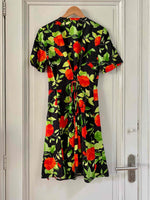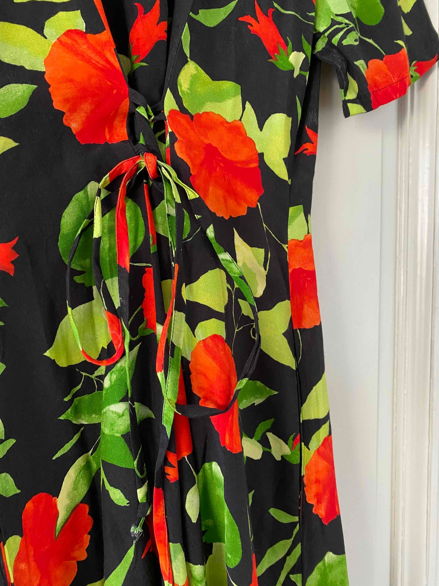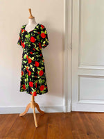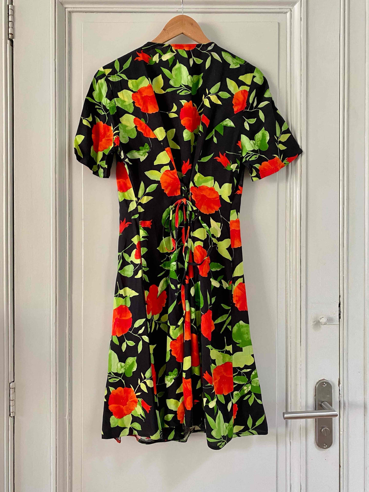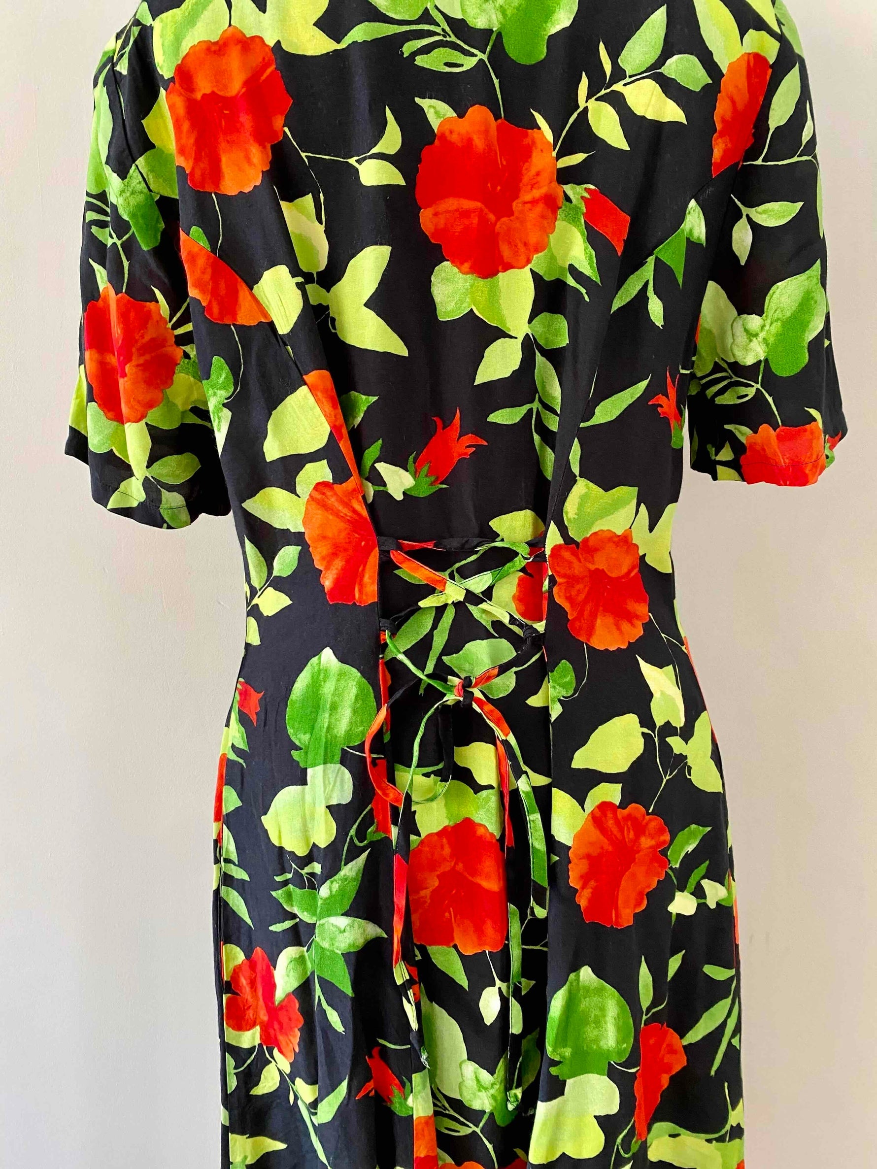 Robe à fleurs, en viscose noire imprimée grandes fleurs rouge vermillon et vert vif, boutonnée, dos à lacets esprit corsage, années 80’s/90’s, taille 38 portée ici sur un mannequin T36, aisselles 48cm.