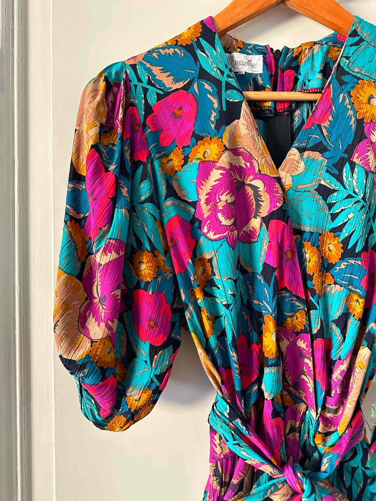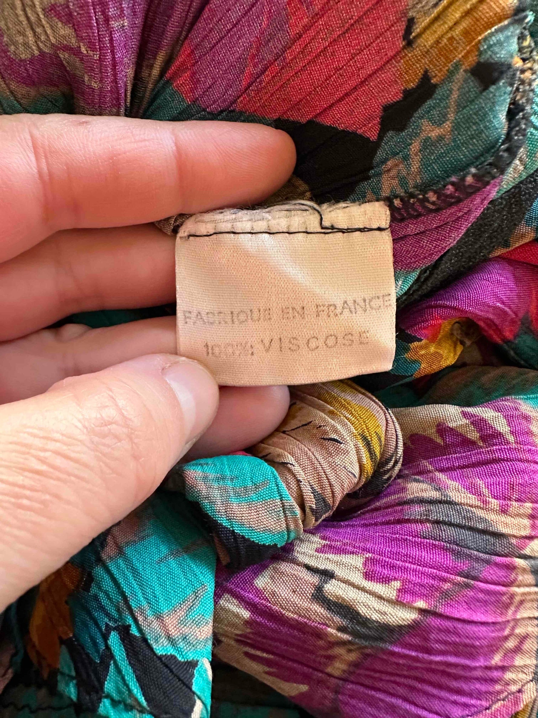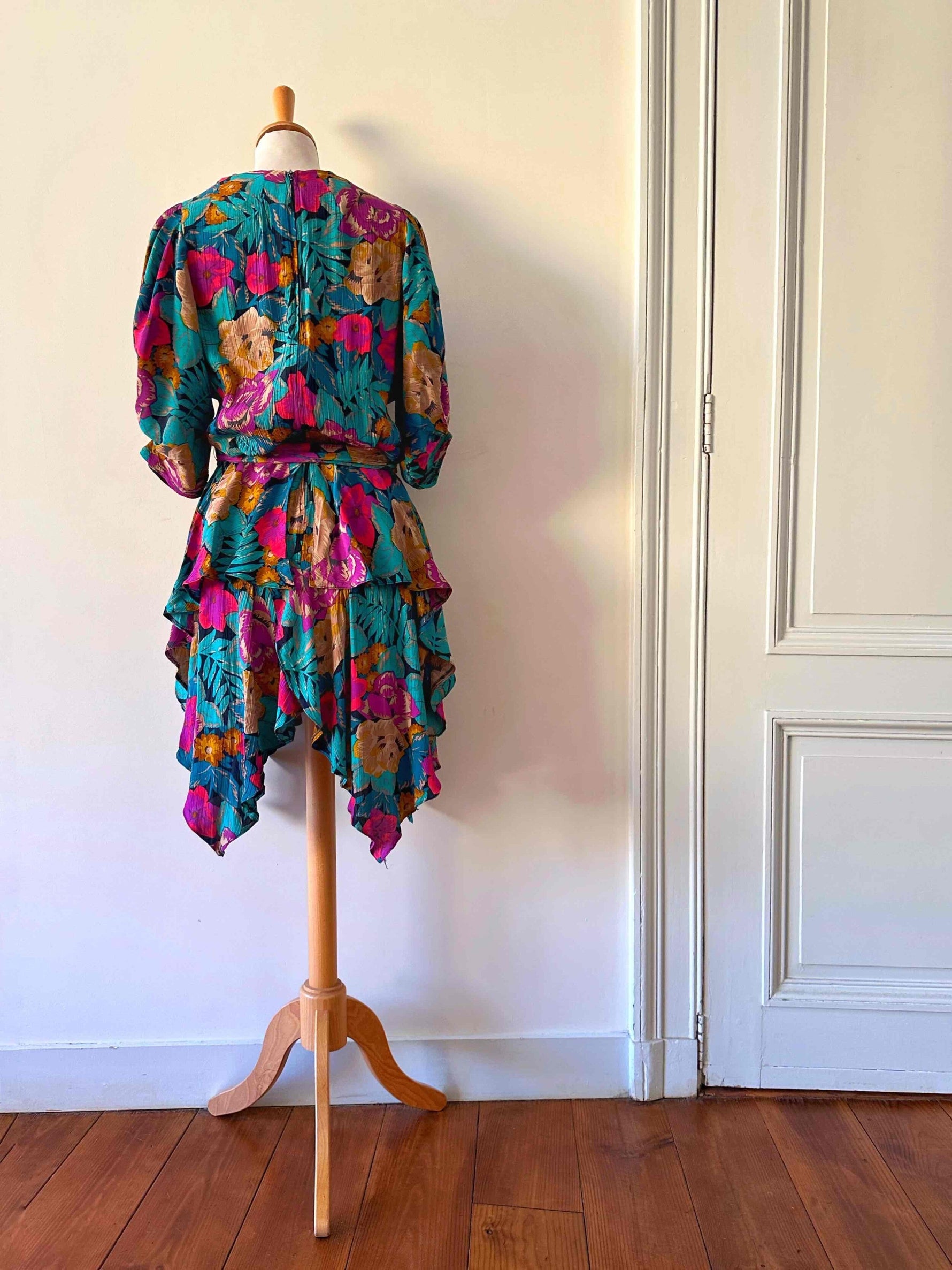 Prix unitaire parMini robe à fleurs, en viscose plissée, manches ballons gigots, haut cache-coeur, bas volanté froufrous, fermeture éclair au dos, taille élastique, ceinture taille à nouer, fabriquée en France, taille 36 portée ici sur un mannequin T36, aisselles 45cm.