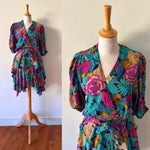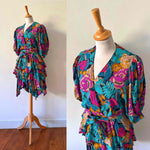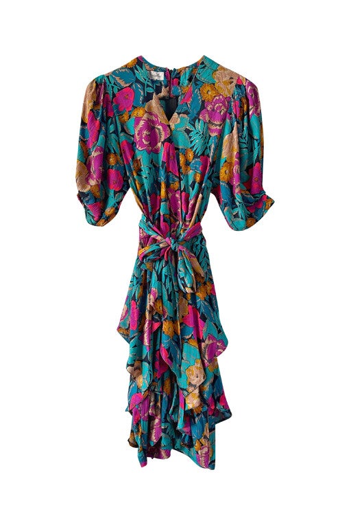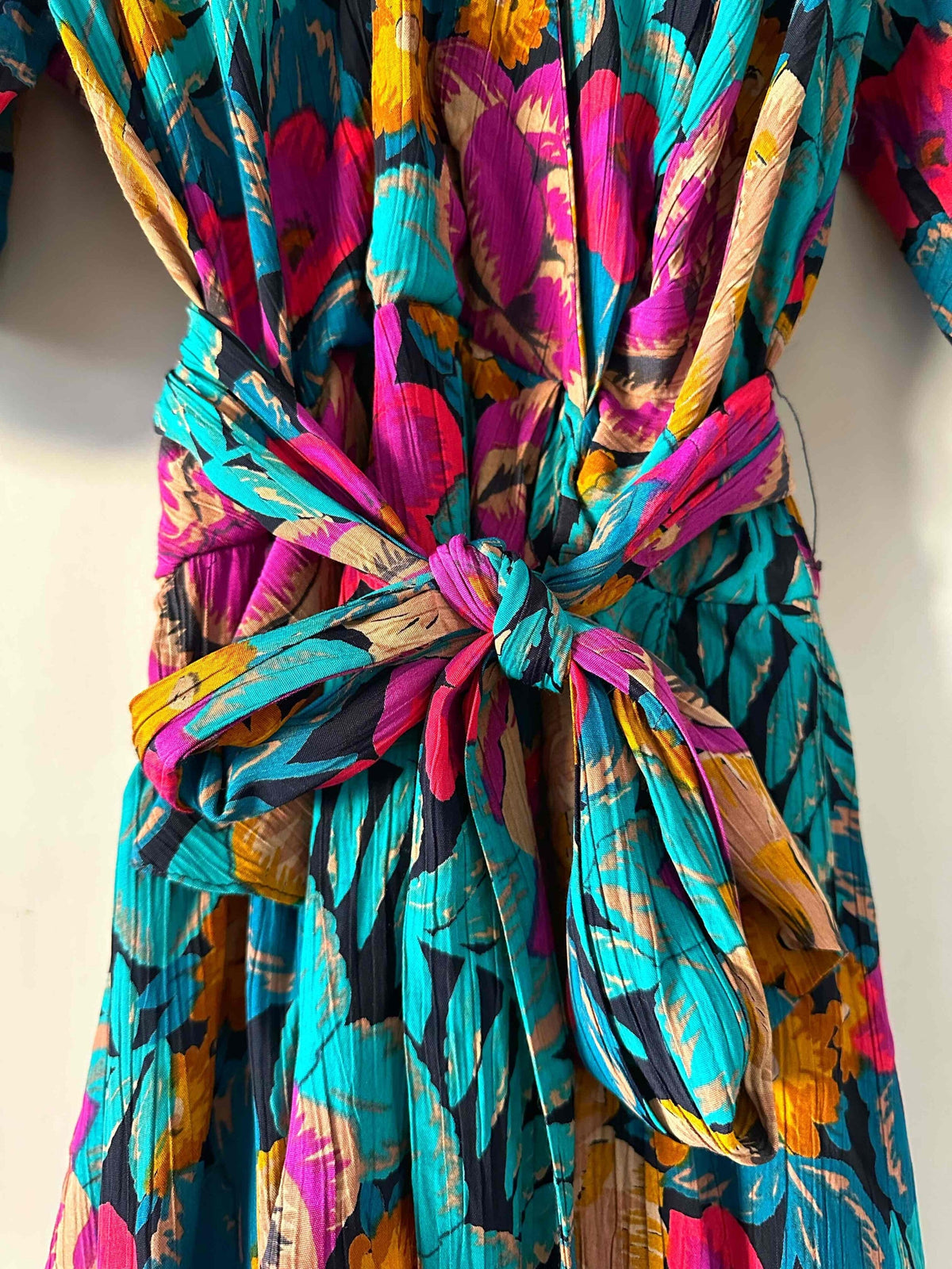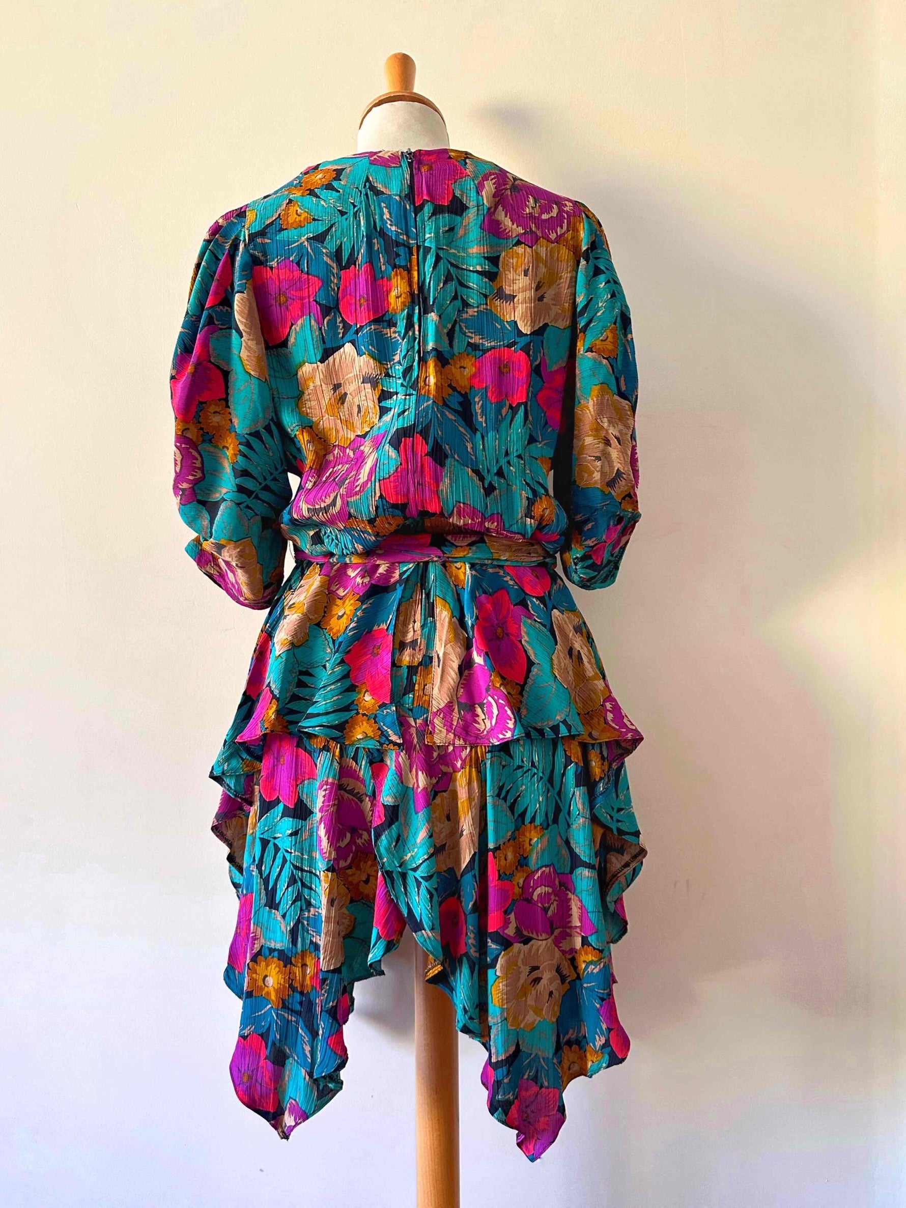 Prix unitaire parMini robe à fleurs, en viscose plissée, manches ballons gigots, haut cache-coeur, bas volanté froufrous, fermeture éclair au dos, taille élastique, ceinture taille à nouer, fabriquée en France, taille 36 portée ici sur un mannequin T36, aisselles 45cm.