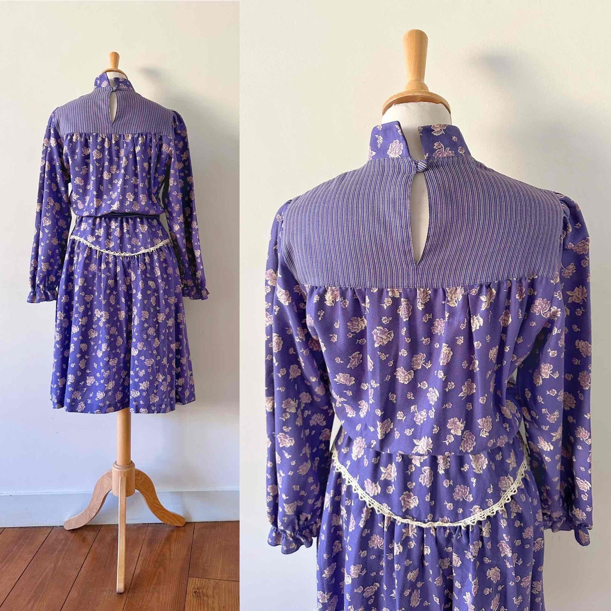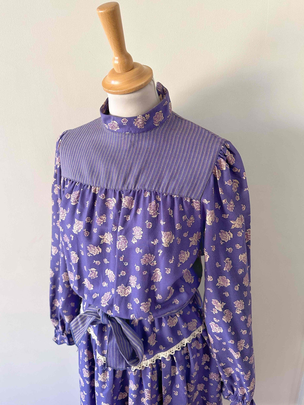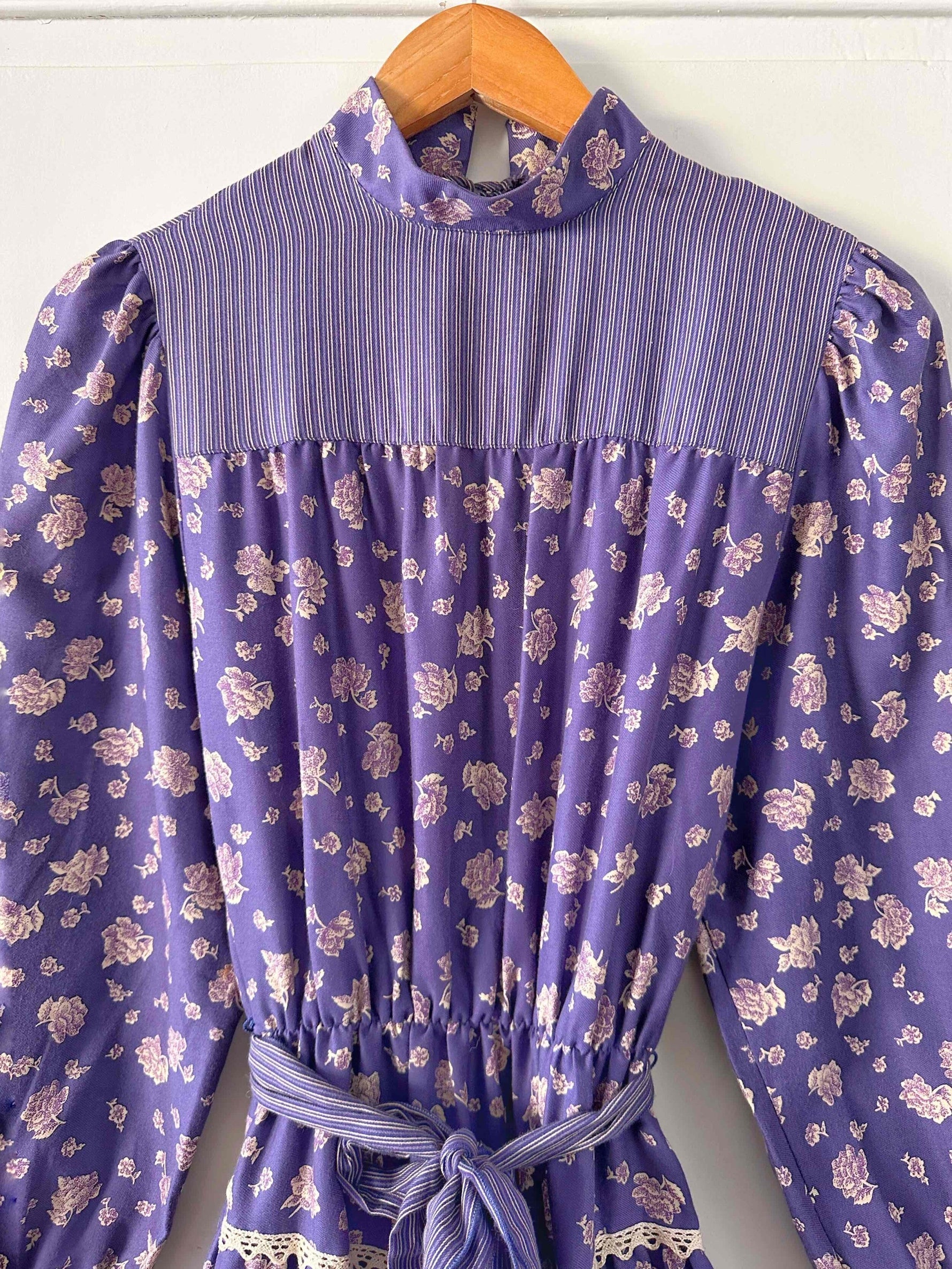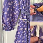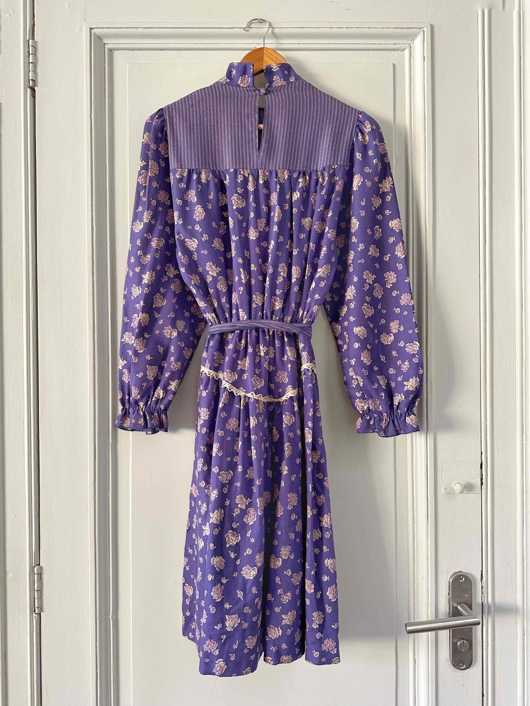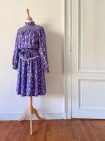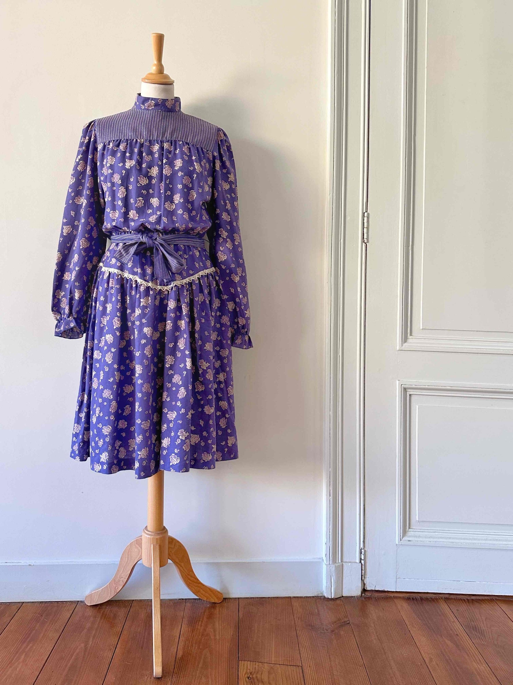 Prix unitaire parRobe boheme à fleurs, en viscose twill violette imprimée fleurs blanches et lilas, patchwork de tissus rayé, col montant à boutonner au col dos, manches ballons, brodée de dentelle blanche, taille élastique et ceinture taille à nouer, fabriquée en Italie, taille 34 et 36 portée ici sur un mannequin T36.