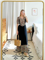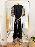 Prix unitaire parRobe longue noire avec empiècements fleuris, manches bouffantes, noeud dans le dos, col en V, portée ici sur une T36 pour 1m64.