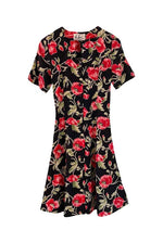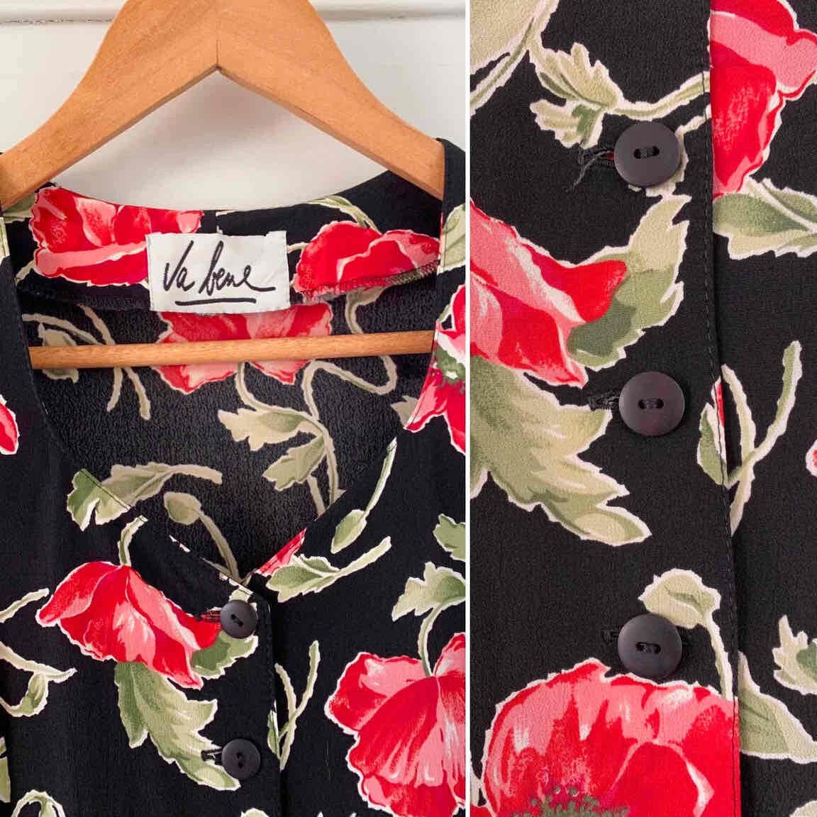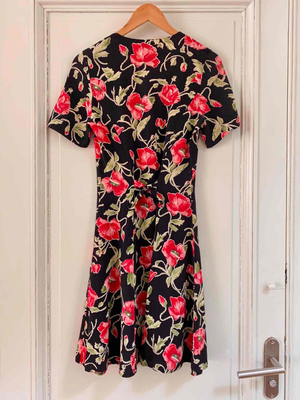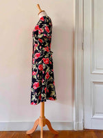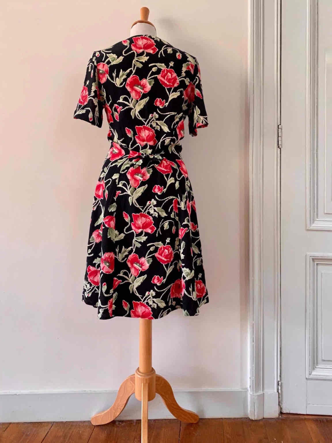 Prix unitaire parRobe Boutonnée à Fleurs en viscose crêpe noire imprimée fleurs de pavots, coquelicots rouges, roses, vertes, taille à nouer dos, fabriquée en Italie, aisselles 44cm, taille 36 portée ici sur un mannequin T36.